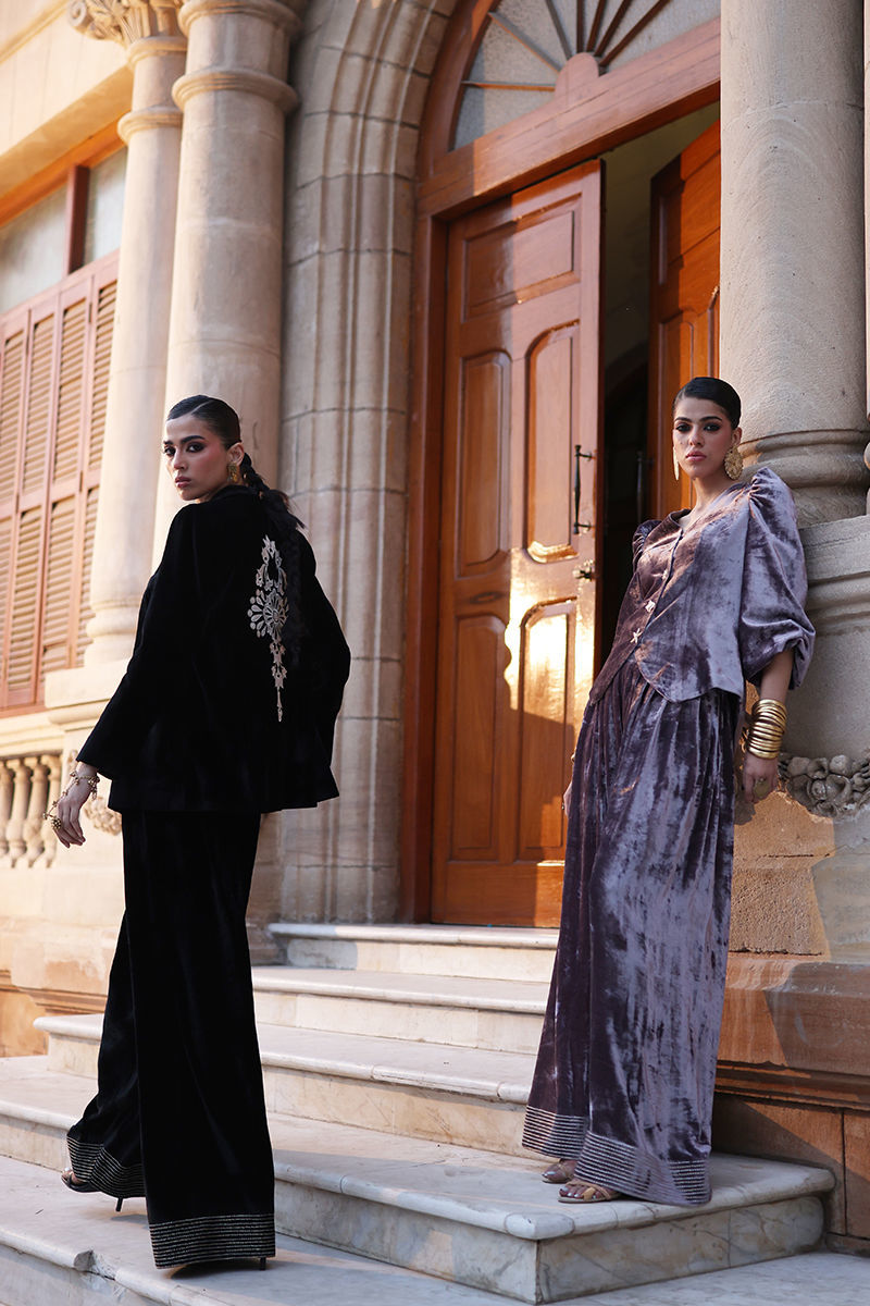 A sophisticated waist top with sleeves in pure velvet, rendered in the refined Quail hue. The back is adorned with intricate gold and silver embroidery and delicate silver appliqué work, while imported buttons accentuate the front for a polished finish. Paired with farshi culottes in pure velvet, featuring silver and gold embroidery along the hem, this ensemble balances traditional craftsmanship with contemporary elegance.