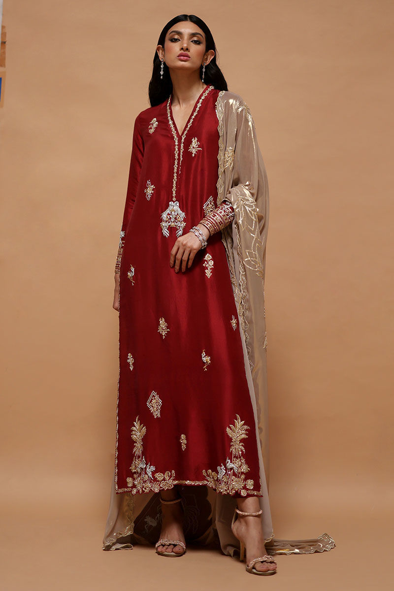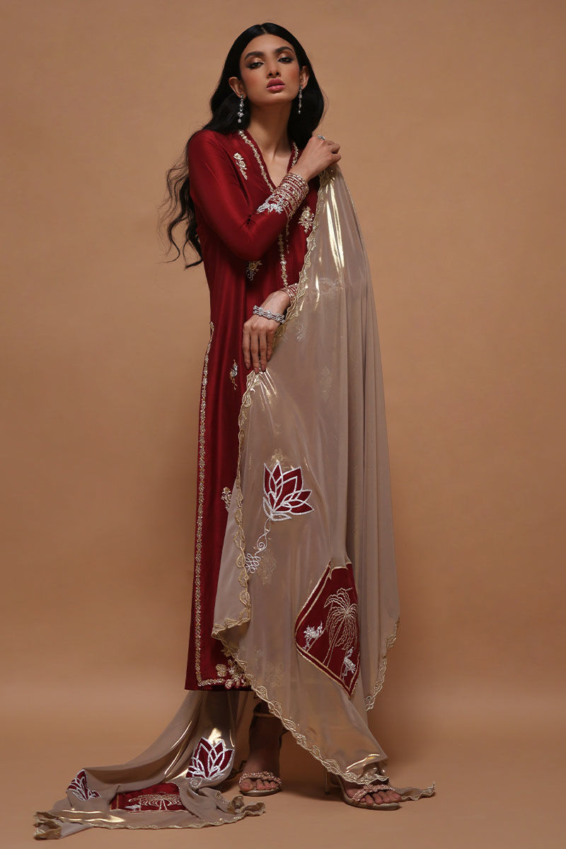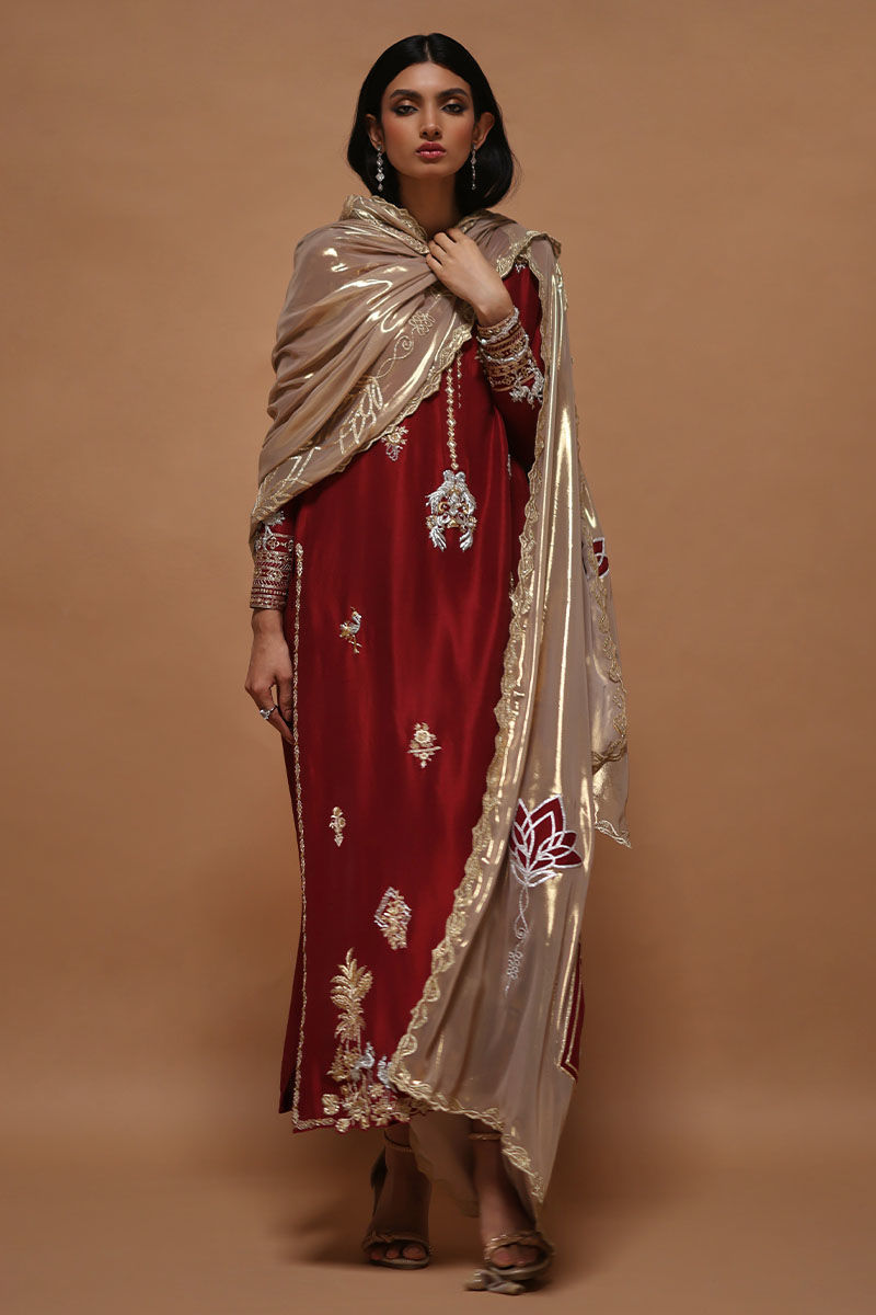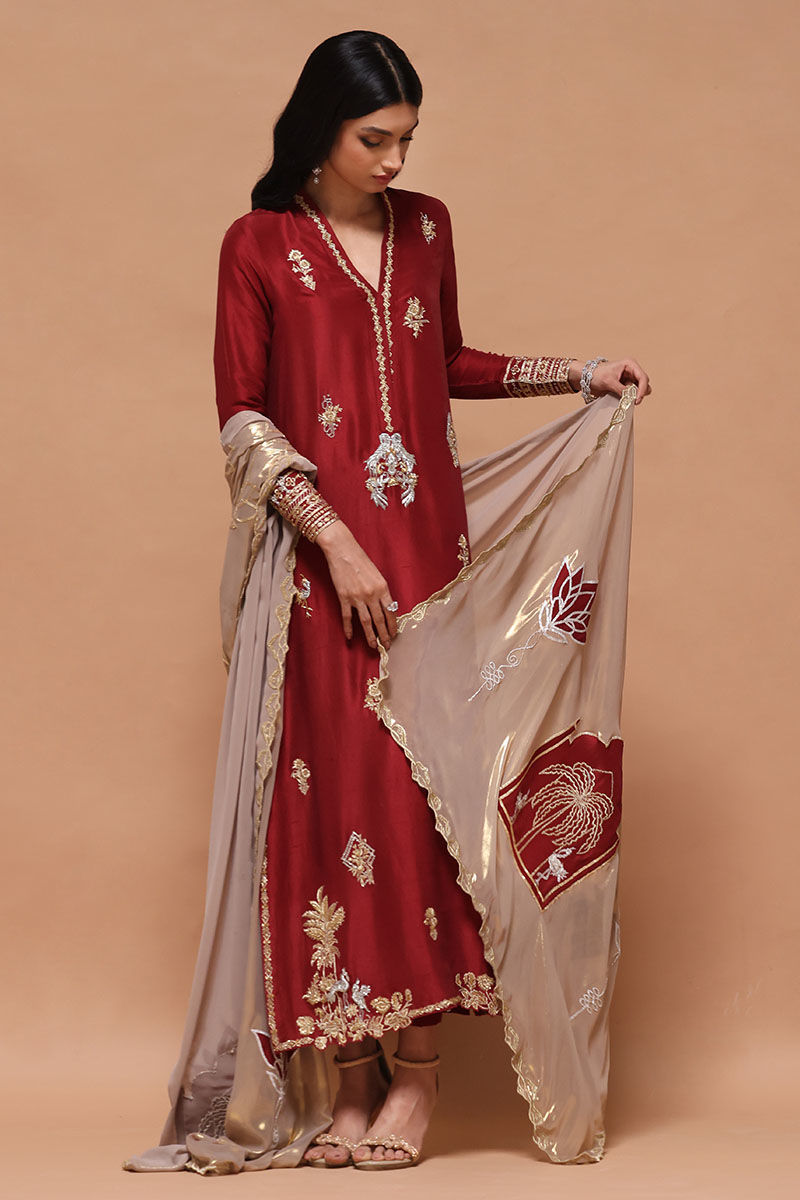 This antique maroon straight long shirt is made from pure raw silk (80 gms) and features intricate allover zari embroidery complemented by handwork with kora, dabka, nakshi, cutdana, tiki stones, and sequins. The shirt is paired with pure raw silk straight pants, enhancing the elegance of the ensemble. Completing the look is a lame chiffon dupatta, adorned with a four-side zari embroidered border, gota work, and colorful appliqué detailing on both sides of the pallu.
