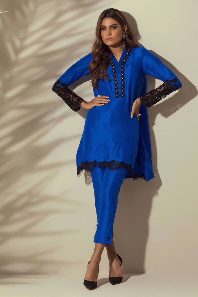 Electric blue colored pure raw silk Top embellished with black laces, nets and Chantilly border, handwork of stones and beads has been added to enhance the look.
