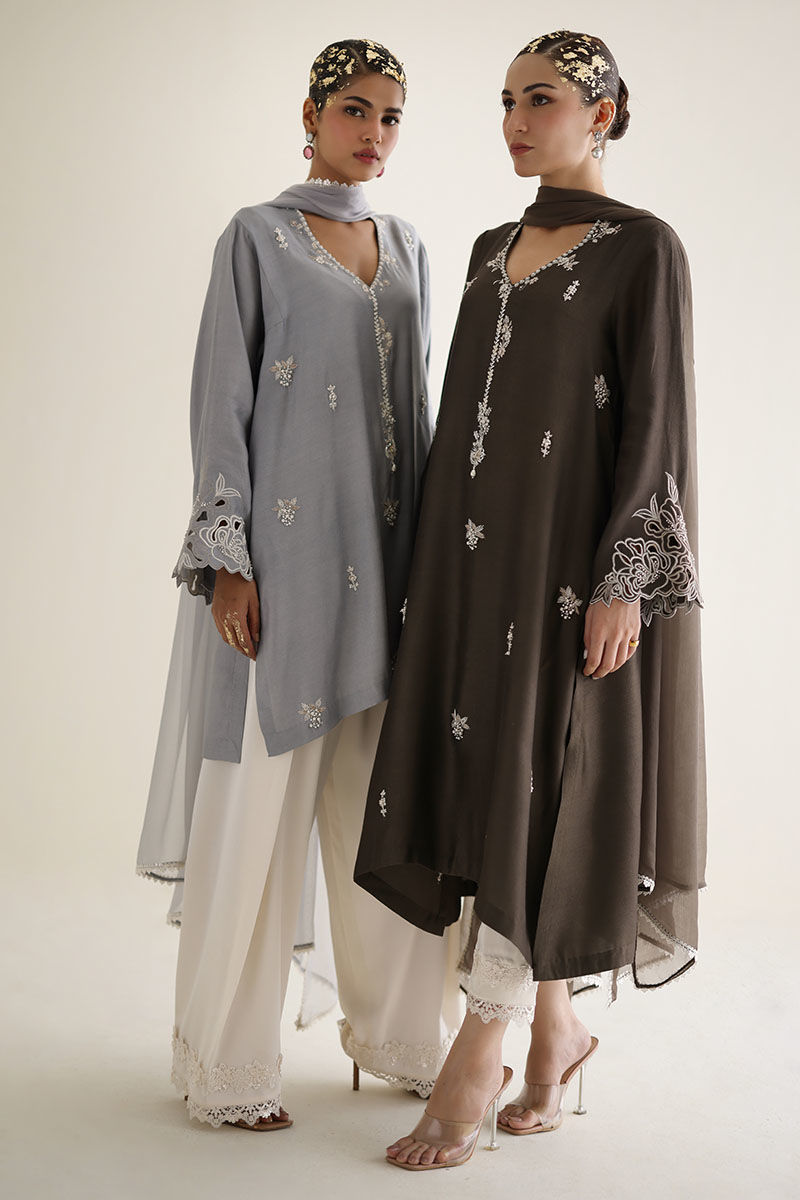 Introducing our stunning rock ridge khaadi shirt, crafted to perfection for your special occasions. Made from high-quality khaadi fabric, this shirt features exquisite embroidery with resham, zari, cutdana, tiki stone, pearls, dabka, nakshi, Indian moti, and sequins, meticulously adorning the front and cutwork sleeves. Paired with candy crape pants adorned with delicate lace detailing at the bottom and a chiffon dupatta embellished with lace, this ensemble exudes elegance and charm. Elevate your style with this timeless outfit, perfect for any celebration. The model's shirt length is 43.