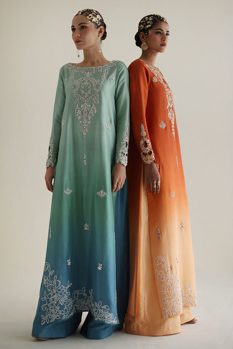 Introducing our Misty Jade ombre pure raw silk straight shirt, a fusion of sophistication and allure. Crafted from premium raw silk 80 gms, this shirt features intricate embroidery with resham, zari, cutdana, tiki stones, pearls, crystals, and sequins on the front and sleeves, adding a touch of opulence to your ensemble. Paired with pure raw silk culottes for a seamless look and complemented by a pure organza dupatta, this outfit exudes elegance and charm. Elevate your style with this stunning ensemble. The model's shirt length is 54.