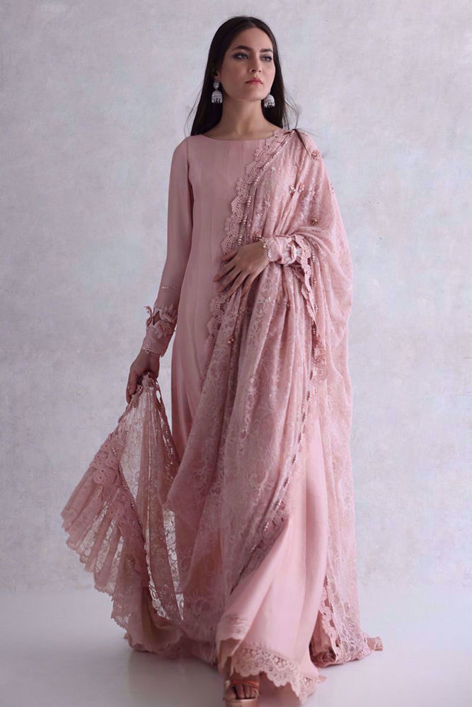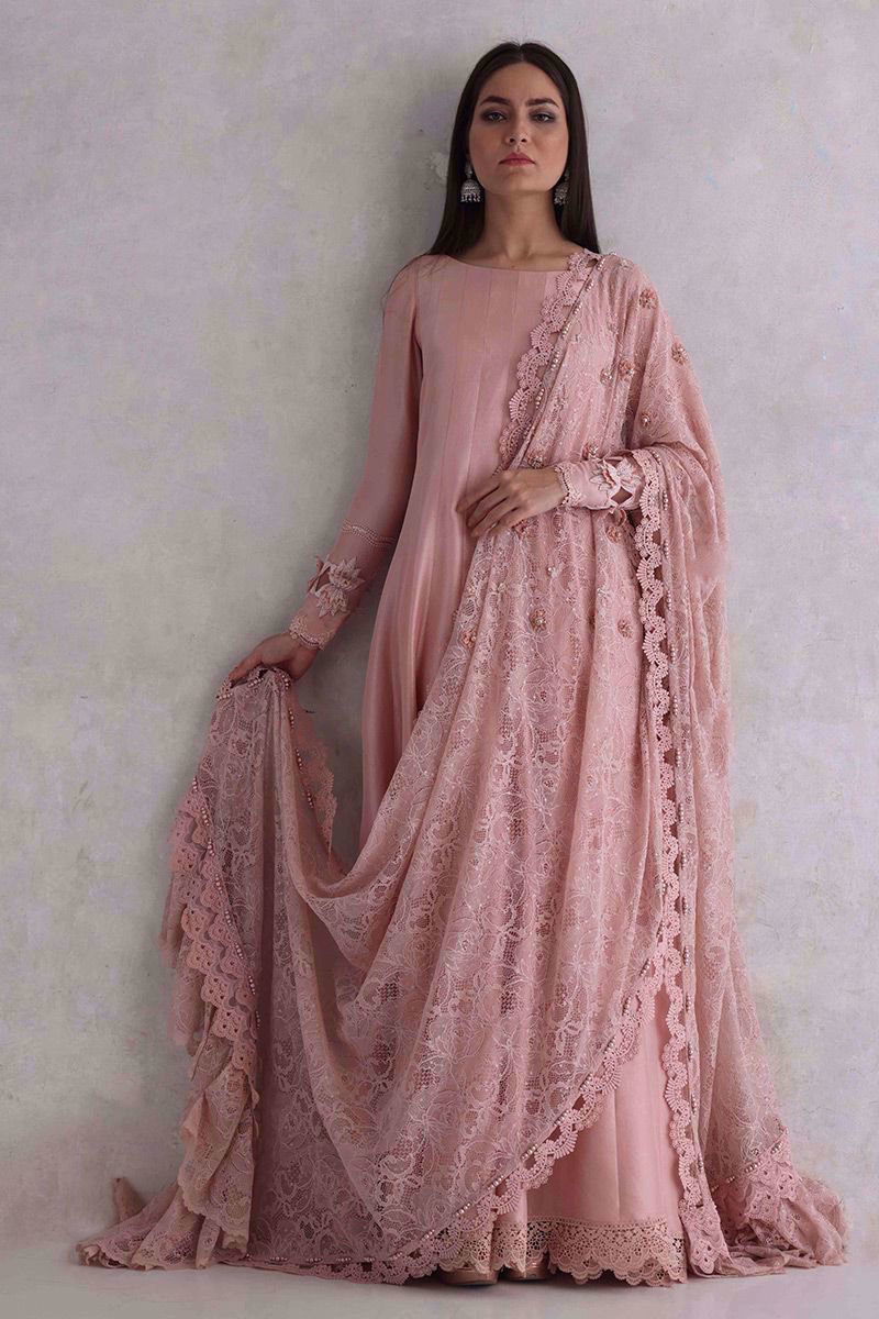 Flawless lengthy English Rose pure raw silk kalidar is a statement of purity. This unadorned long kalidar compliments best with beautifully embellished sleeves and back comprising of self-colored 3D handwork motifs and laces. To complete off the look, same color semi pure pants add the beauty of this outfit, it's a flowy Chantilly dupatta with the same color handwork, laces, and frills to be purchased at additional cost. This outfit is paired with semi pure silk pants.