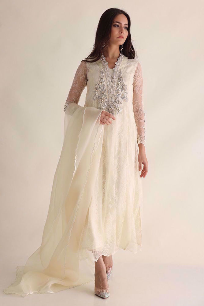 Here you see the most gorgeous Chantilly shirt in snow white color beautified with handmade organza flowers, pearls, crystals, sequins, stones, and resham on the neckline and sleeves. Same color pure organza dupatta with resham work scallops and shimmer silk pants can be purchased at an additional cost.