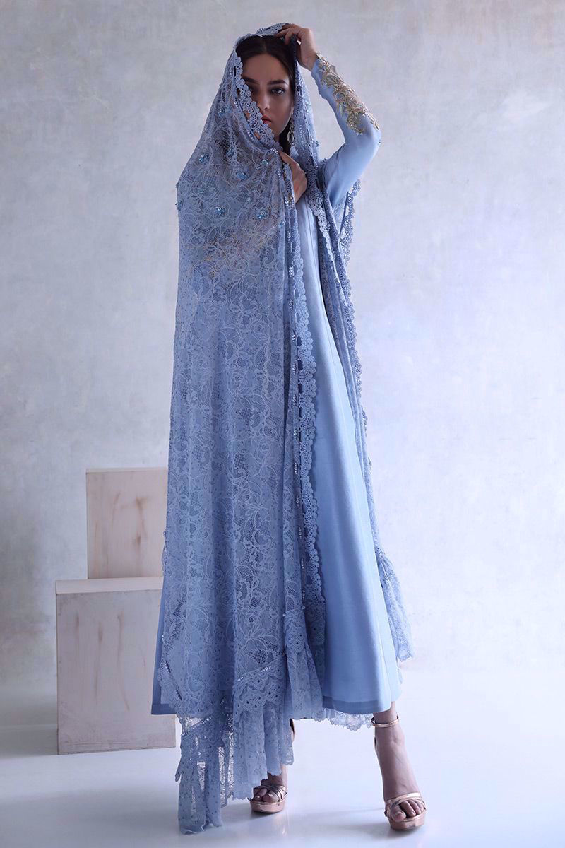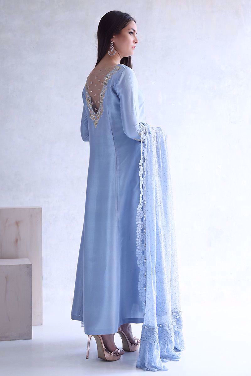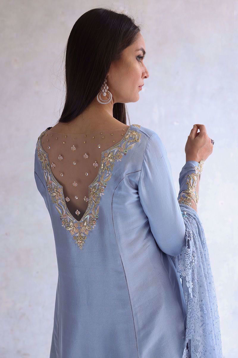 A pure raw silk shirt in cashmere blue color features a prince panel silhouette. This gorgeous shirt complements best with beautifully embroidered sleeves and back, comprising of multi-colored resham, zari, crystals, pearls, gota, sequins, and raw Swarovski.
