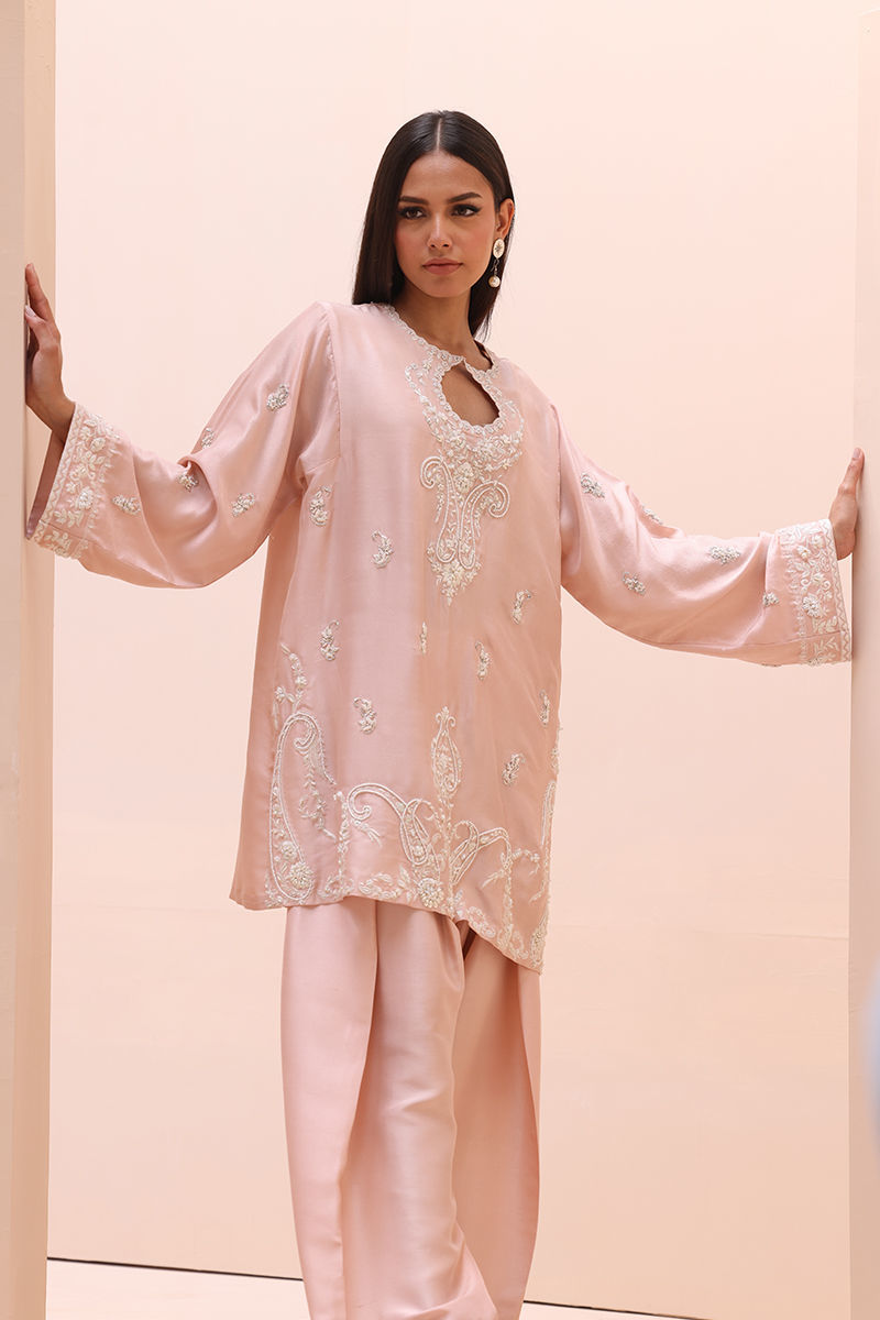 Graceful Soft Pink Ensemble – Crafted from Pure Raw Silk for the Shirt and Shalwar and delicate Pure Organza for the Dupatta, this exquisite outfit features all-over Ivory Resham and Lorix embroidery. Enhanced with intricate handwork using Moti, Crystals, Tikki Stones, Sequins, Cutdana, and Pearls, it boasts a stunning sequins handwork border. The dupatta is adorned with all-over sequins chan and crystal hangings on the pallu, adding a touch of ethereal elegance.