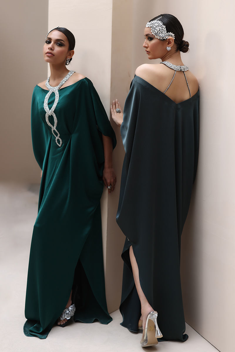 Elegant Charm in Alpine Green – This exquisite kaftan, crafted from luxurious Textured Silk, is adorned with intricate hand-stitched stonework on the neckline and delicate boti embellishments on the sleeves. A timeless statement of sophistication and grace.