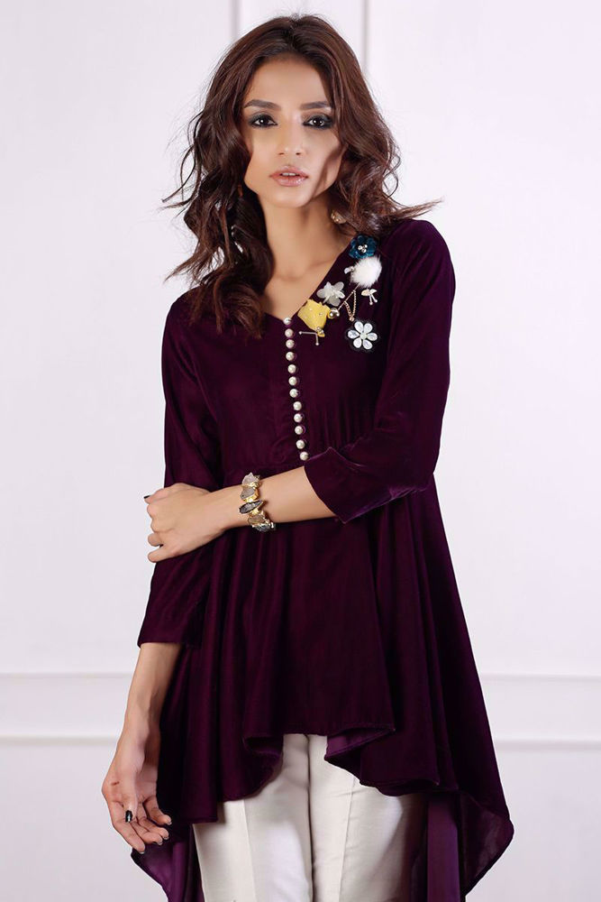 Trendy high low Plum velvet peplum with v-neckline and loops buttons. Detailing of fur, flower and hanging is given to revamp the look.