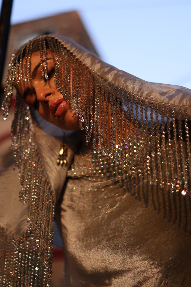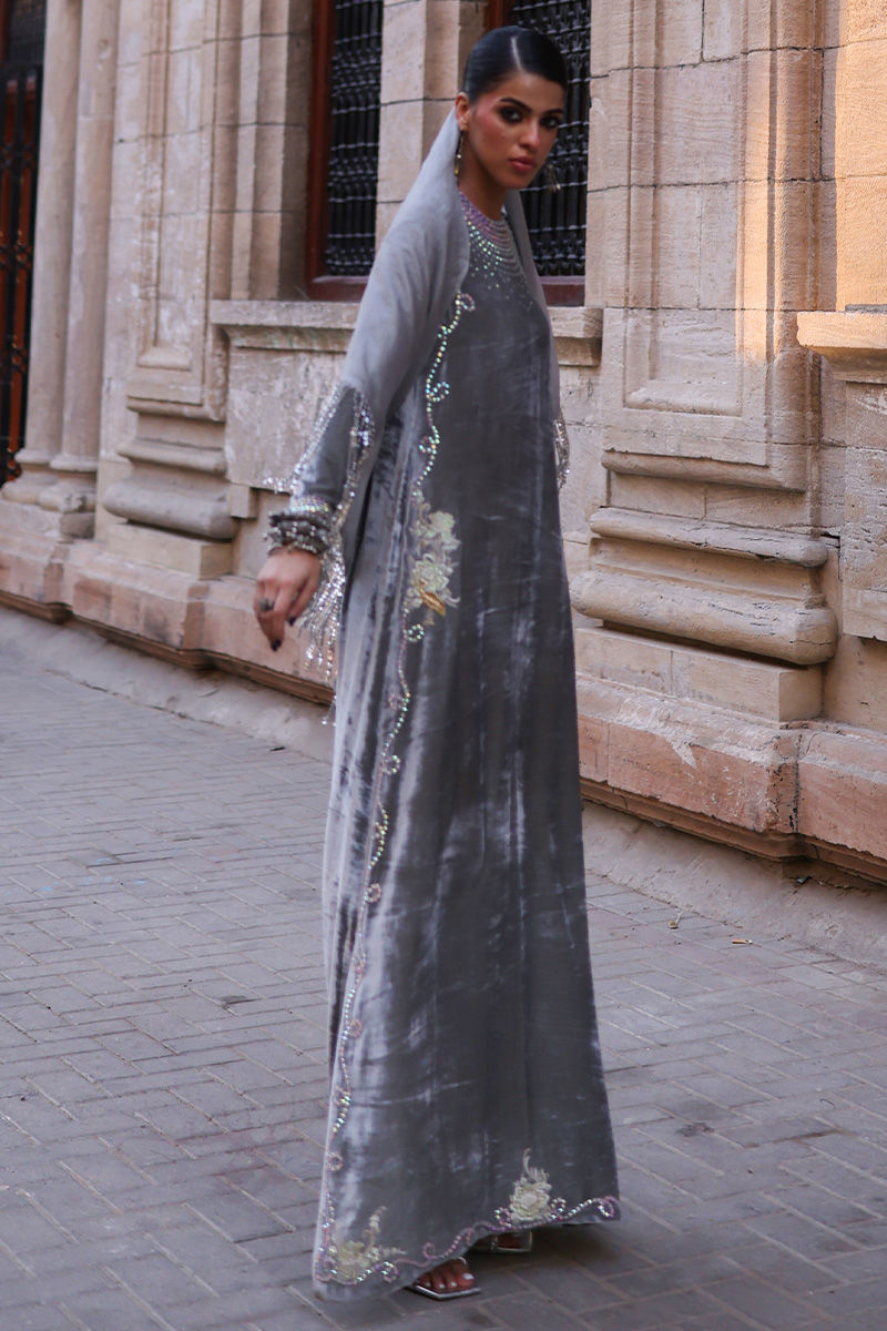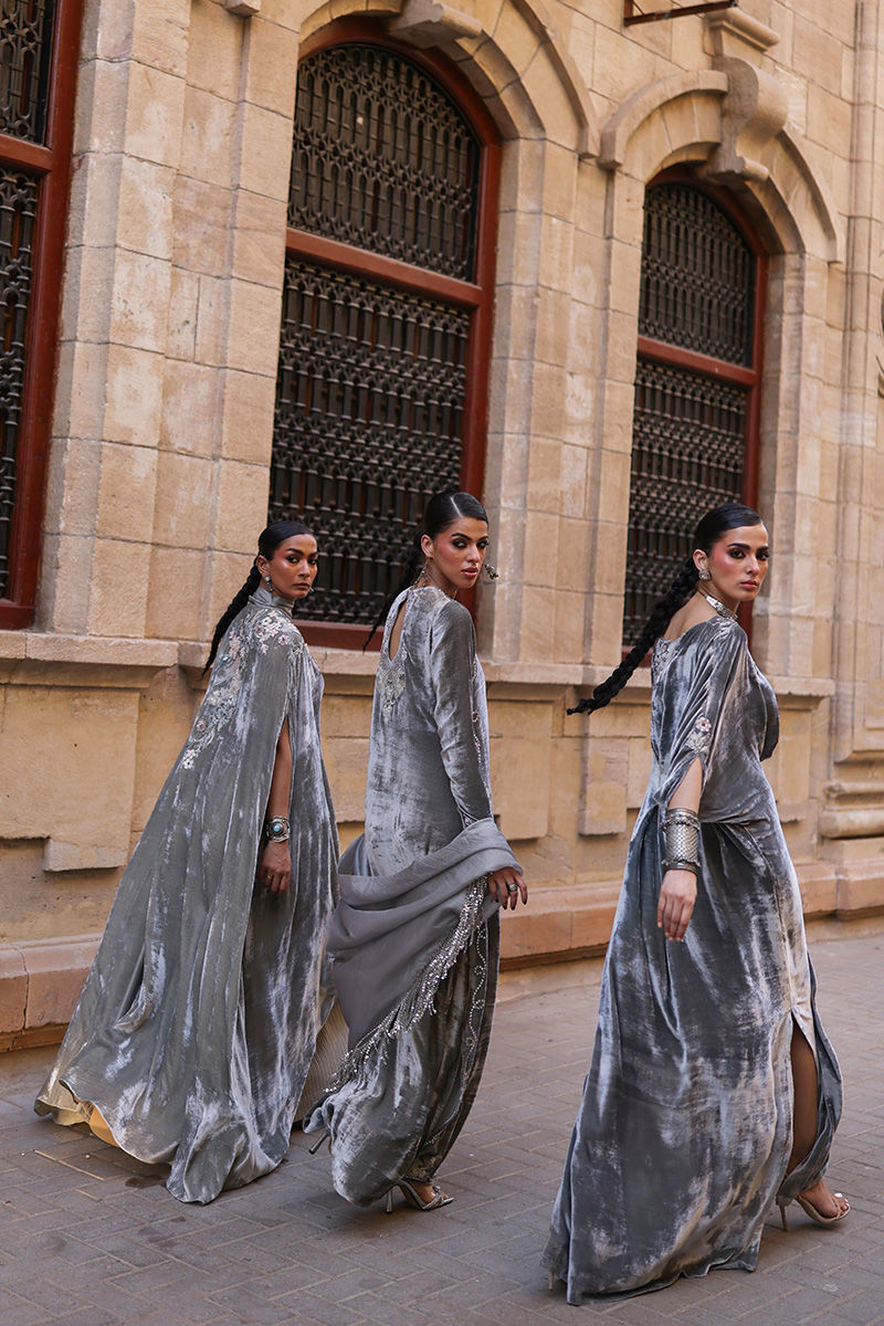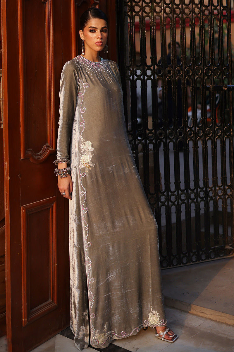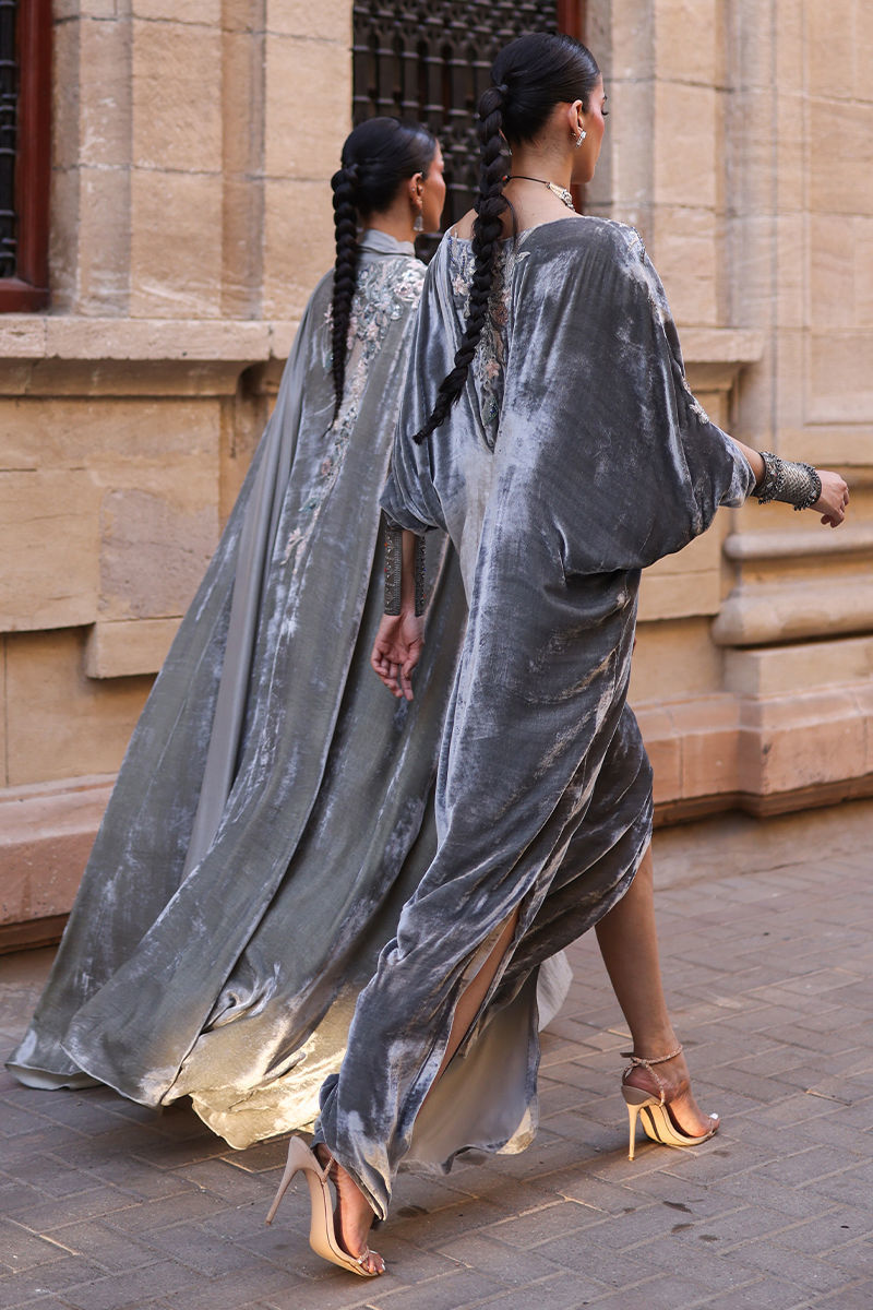 An elegant Desert Sage kaftan crafted from pure velvet, adorned with exquisite hand-stitched stonework featuring zari, resham, cutdana, sequins, dabka, and nakshi detailing on the front, back, and sleeves. The silhouette is thoughtfully designed with functional pockets for added ease. Paired with a refined shrug in diamond silk and culottes or pants tailored from soft cotton charmeuse, this ensemble blends luxurious craftsmanship with understated sophistication—a perfect choice for timeless festive charm.