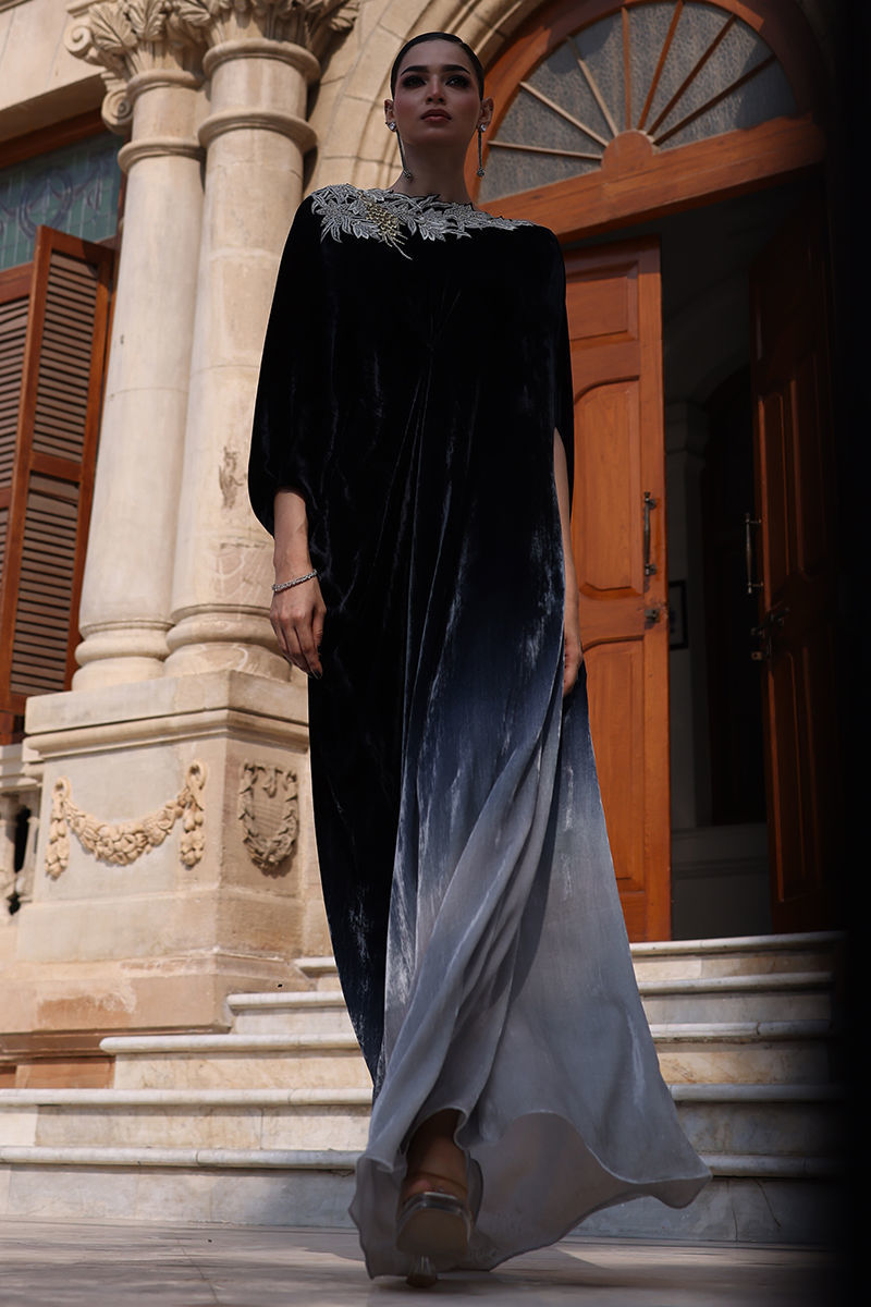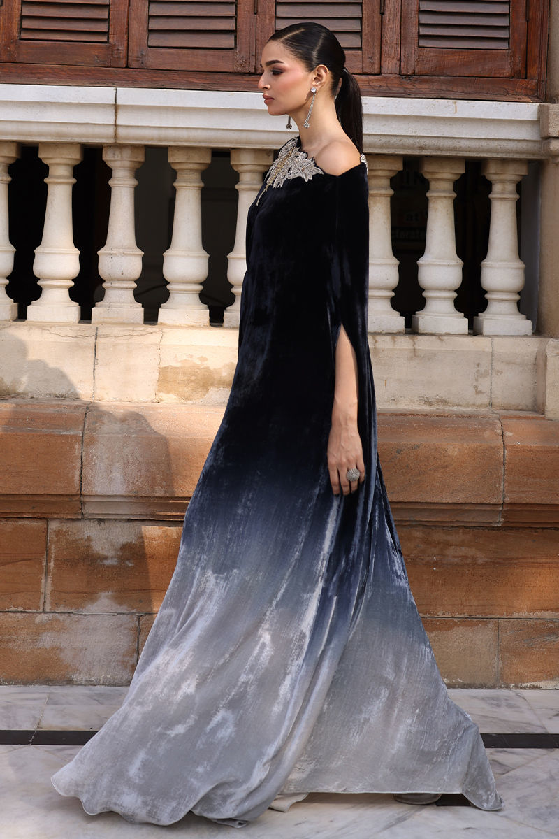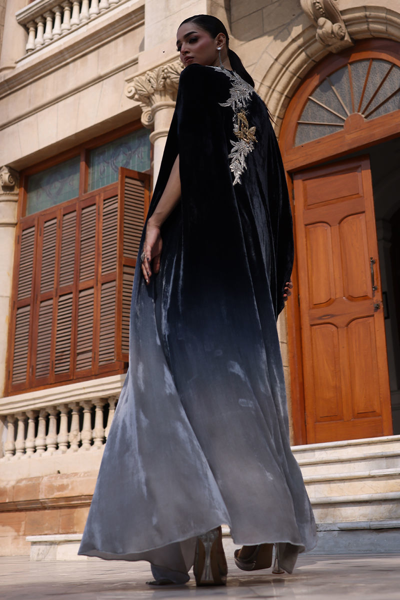 A stunning Black Ombre kaftan crafted from pure velvet, beautifully adorned with intricate silver and gold embroidery featuring zari, moti, nakshi, dabka, cutdana, kaamdani, stones, and crystals on the front and back. The detailed cutwork adds a refined touch of artistry, creating a perfect balance of elegance and opulence. Paired with grey cotton charmeuse pants, this ensemble exudes timeless grace and contemporary sophistication.