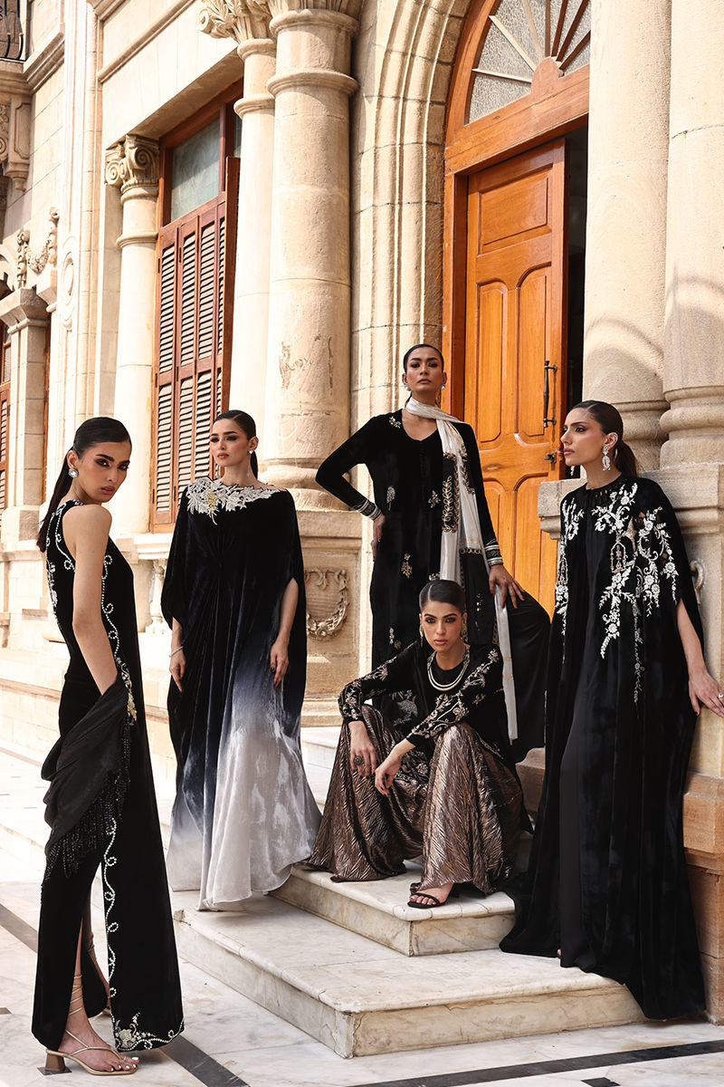 Color: Kaftan: Black Ombre and Pants: Grey Fabric: Pure Velvet Work Details: Embroidered and Embellished