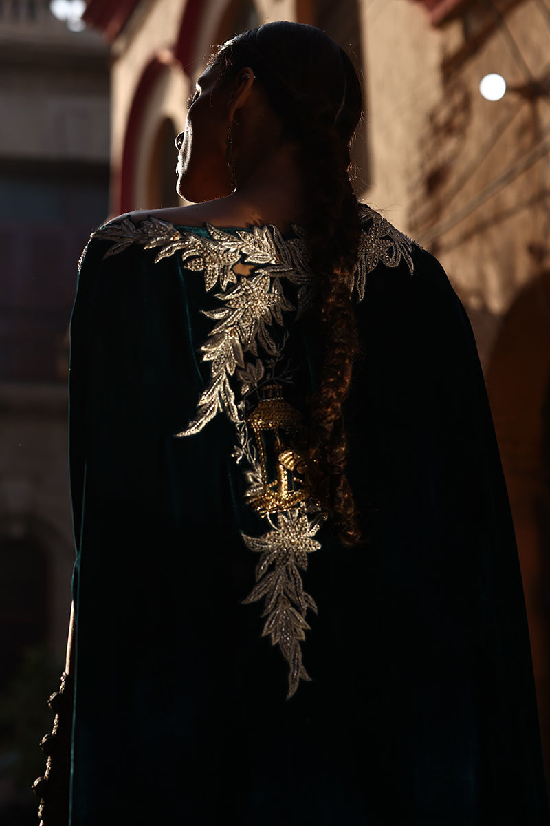 A graceful Teal Ombre kaftan crafted from pure velvet, featuring exquisite silver and gold embroidery with intricate detailing of zari, moti, nakshi, dabka, cutdana, kaamdani, stones, and crystals on the front and back. The elegant cutwork enhances its refined craftsmanship, adding depth and texture to the design. Paired with cotton charmeuse pants in a lighter tone, this ensemble embodies timeless luxury and understated sophistication — perfect for festive and formal occasions.