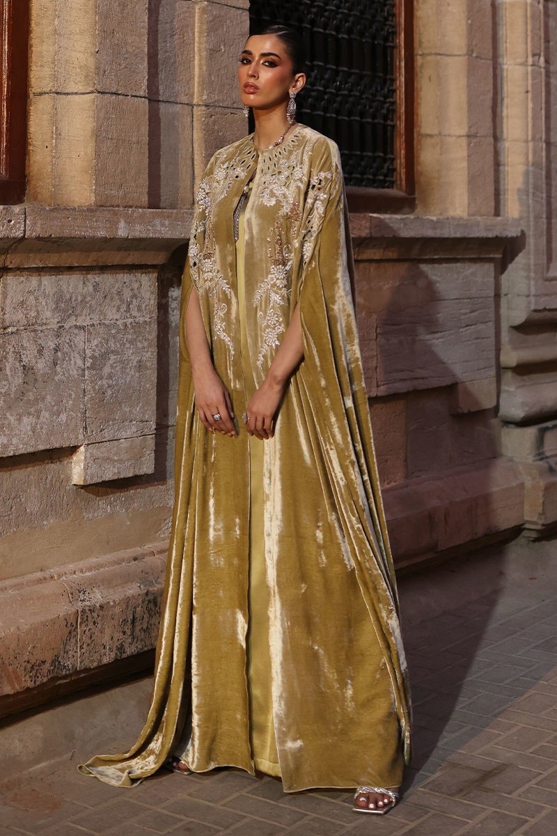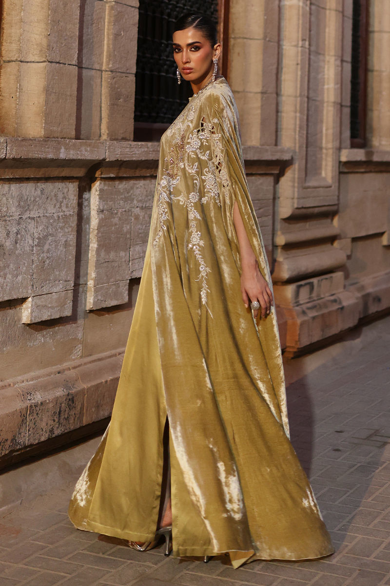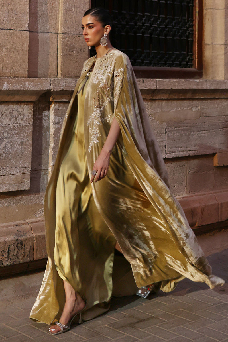 A statement of elegance in lime bean velvet, this cape features intricate gold zari embroidery and delicate cutwork across the front and back. The design is enriched with silver zari, lorex, white resham, stones, and fully rose gold handwork motifs, complemented by handcrafted patels for a luxurious, artisanal finish. Lined with cotton charmeuse for comfort, it effortlessly blends sophistication with meticulous craftsmanship.