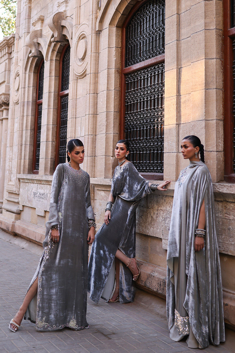 This high-low silhouette in luxurious pure velvet exudes contemporary elegance, paired with pleated culottes for a modern, flowing look. The ensemble features an attached stole in pure medium silk, adding grace and sophistication. Both the front and back are adorned with intricate zari and colored resham embroidery, enhanced with sequins, moti, pearls, cutdana, and crystals, showcasing meticulous handwork and timeless artistry.