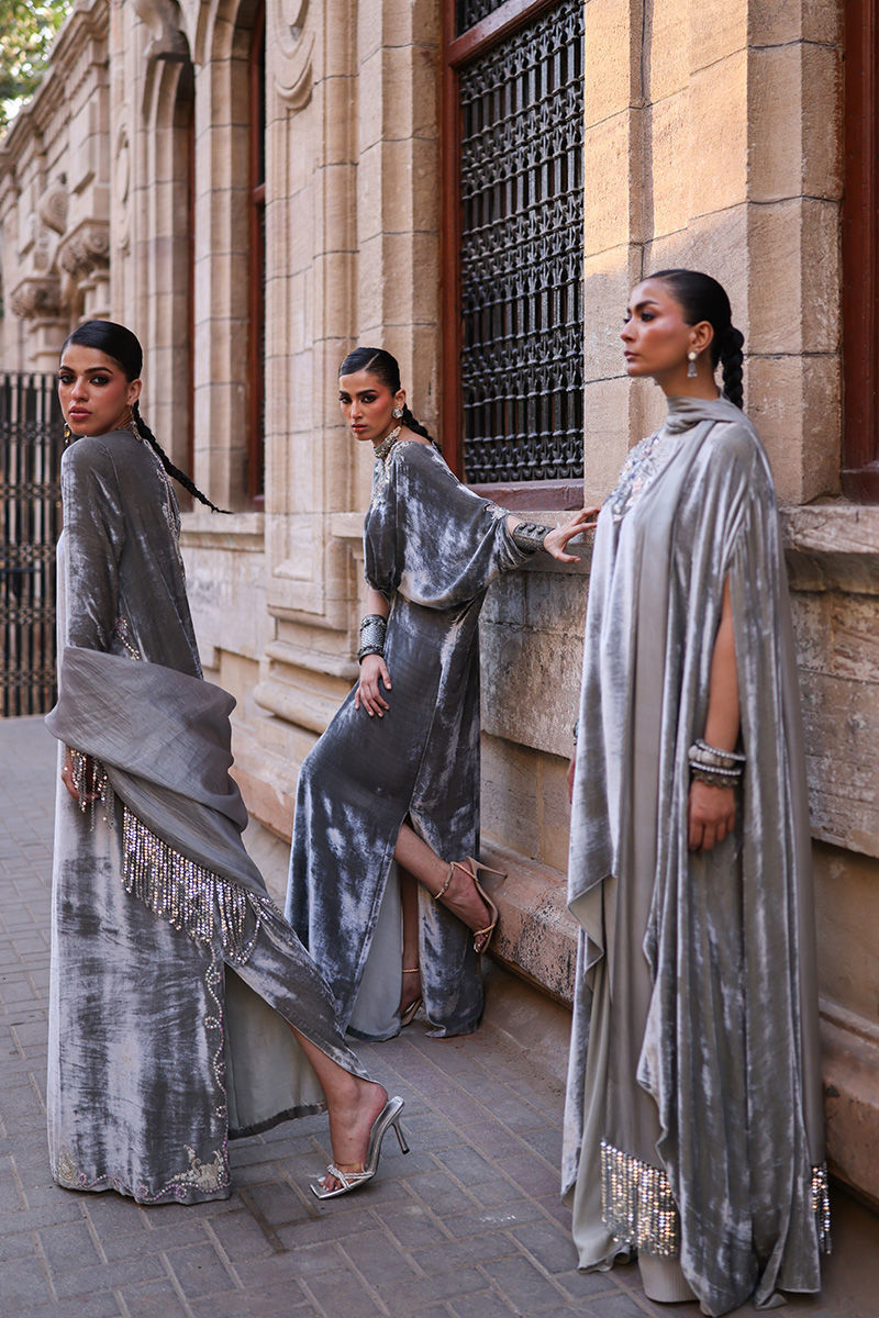 A sophisticated kaftan in luxurious pure velvet, paired with cotton charmeuse pants for comfort and elegance. The ensemble is adorned on the front, back, and sleeves with intricate silver zari and colored resham embroidery, enhanced with delicate cutdana, sequins, pearls, and crystals, showcasing exceptional handwork and timeless craftsmanship.