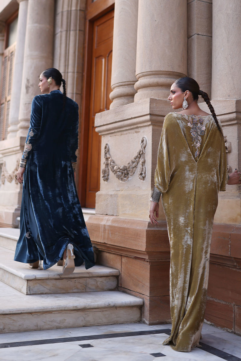 This elegant Sugar Cane-colored kaftan is crafted in luxurious pure velvet, paired with cotton charmeuse pants for comfort and sophistication. The front, back, and sleeves are adorned with intricate silver zari and colored resham embroidery, enhanced with cutdana, sequins, pearls, and crystals, reflecting exquisite handwork and timeless elegance.
