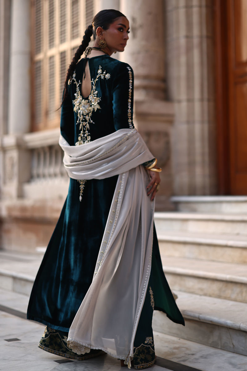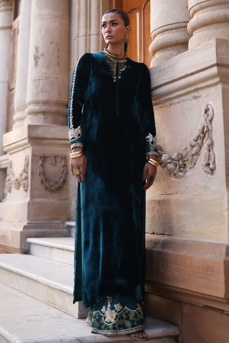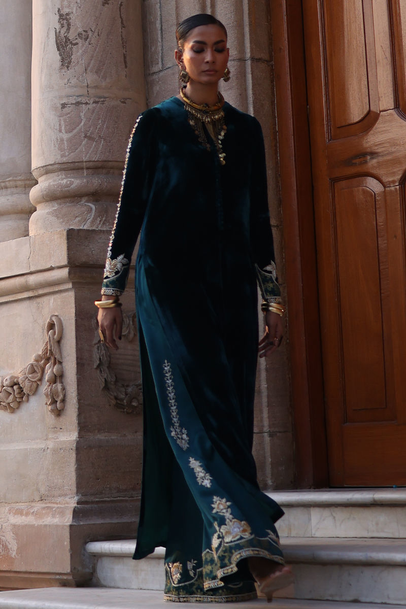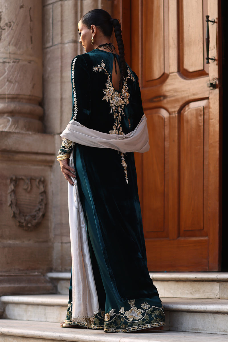 An exquisite emerald green straight long shirt crafted from pure velvet, richly adorned with silver and gold zari embroidery and heavy zardozi work. The intricate detailing features kora, dabka, cutdana, stones, pearls, nakshi, and sequins on the front, back, and sleeves, reflecting timeless craftsmanship. Paired with cotton charmeuse culottes in matching emerald green, enhanced with silver, gold zari, lorix embroidery, and Banarasi appliqué. The look is beautifully completed with a fog beige lame chiffon dupatta, delicately embroidered in gold, silver, and lorix, adding a graceful contrast and regal finish.