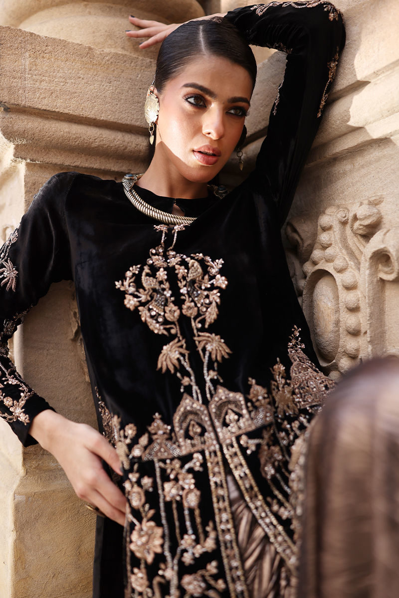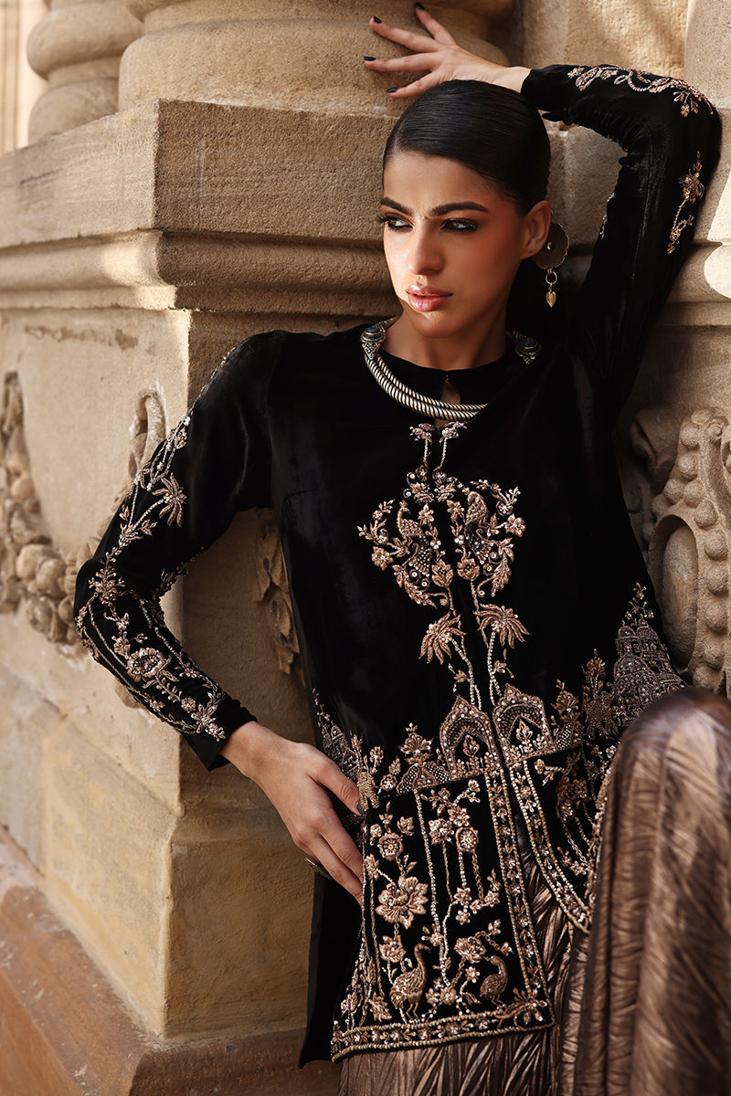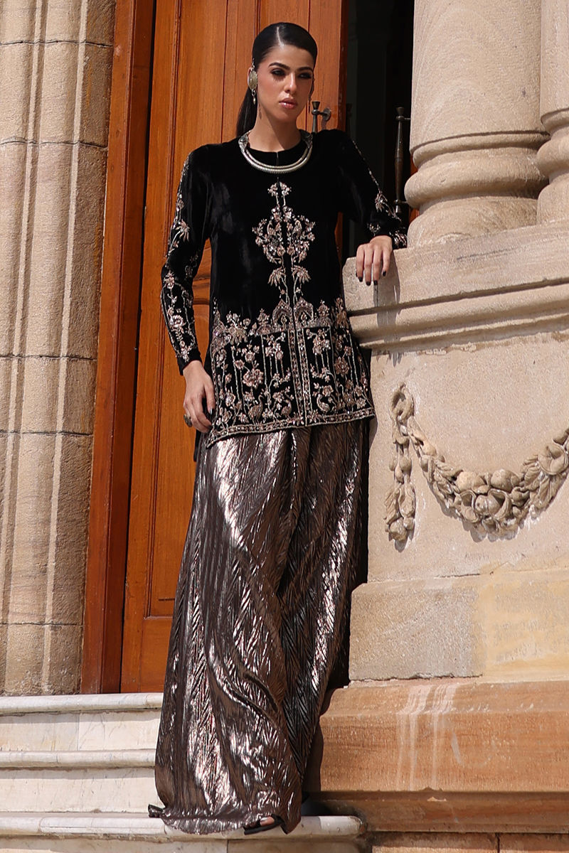 A striking front-open short shirt crafted in luxurious pure black velvet, adorned with copper zari and lorix embroidery. The ensemble is elevated with antique and copper handwork featuring stones, sequins, dabka, nakshi, and cutdana on the front, back, and sleeves, reflecting exquisite craftsmanship and timeless detail. Paired with flowy crushed culottes in shiny copper, this look effortlessly blends rich texture, contrast, and contemporary elegance.