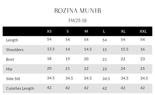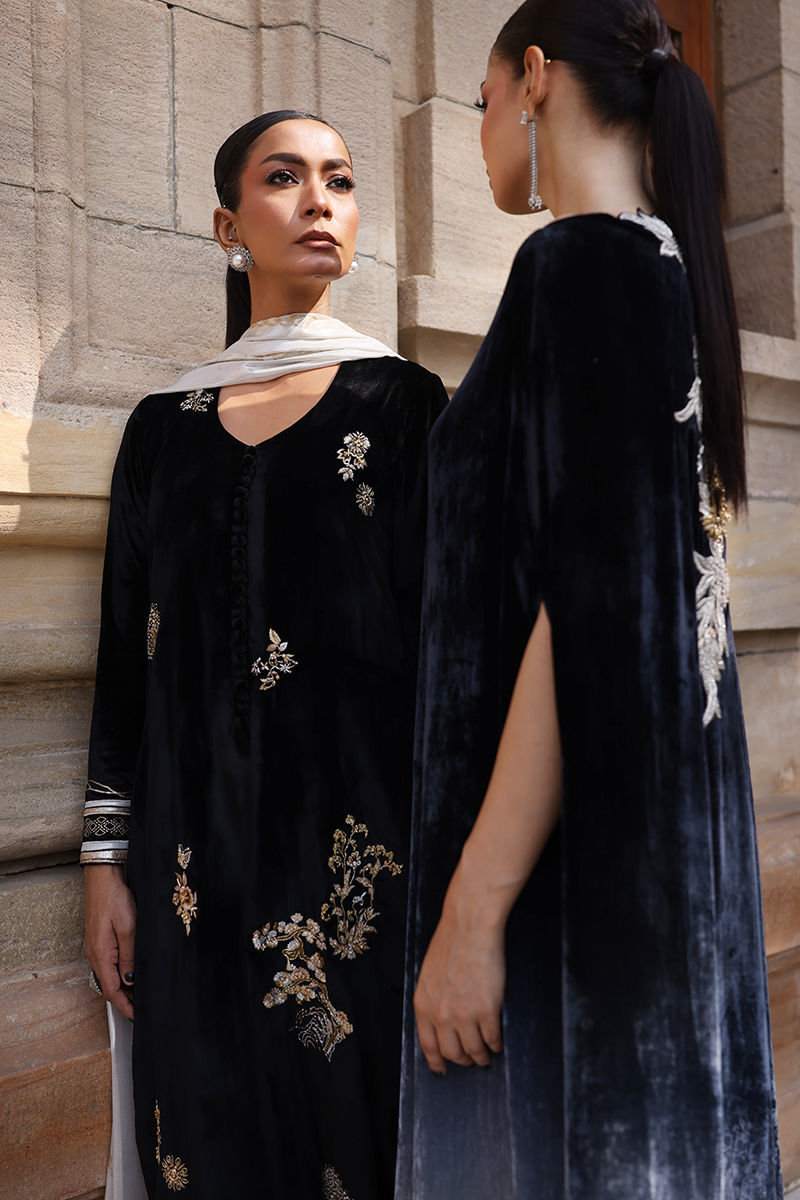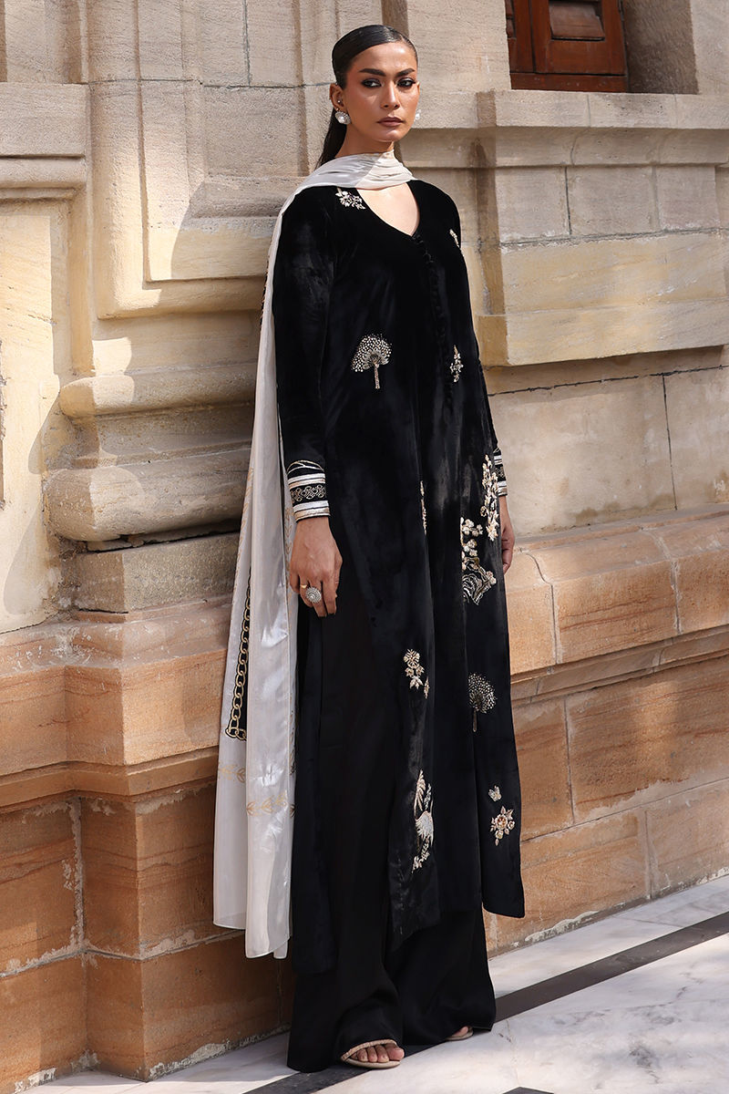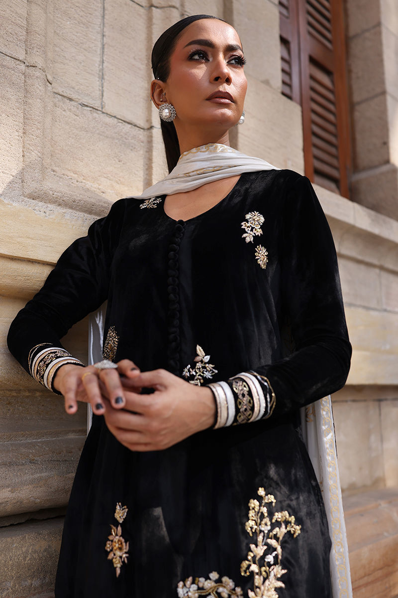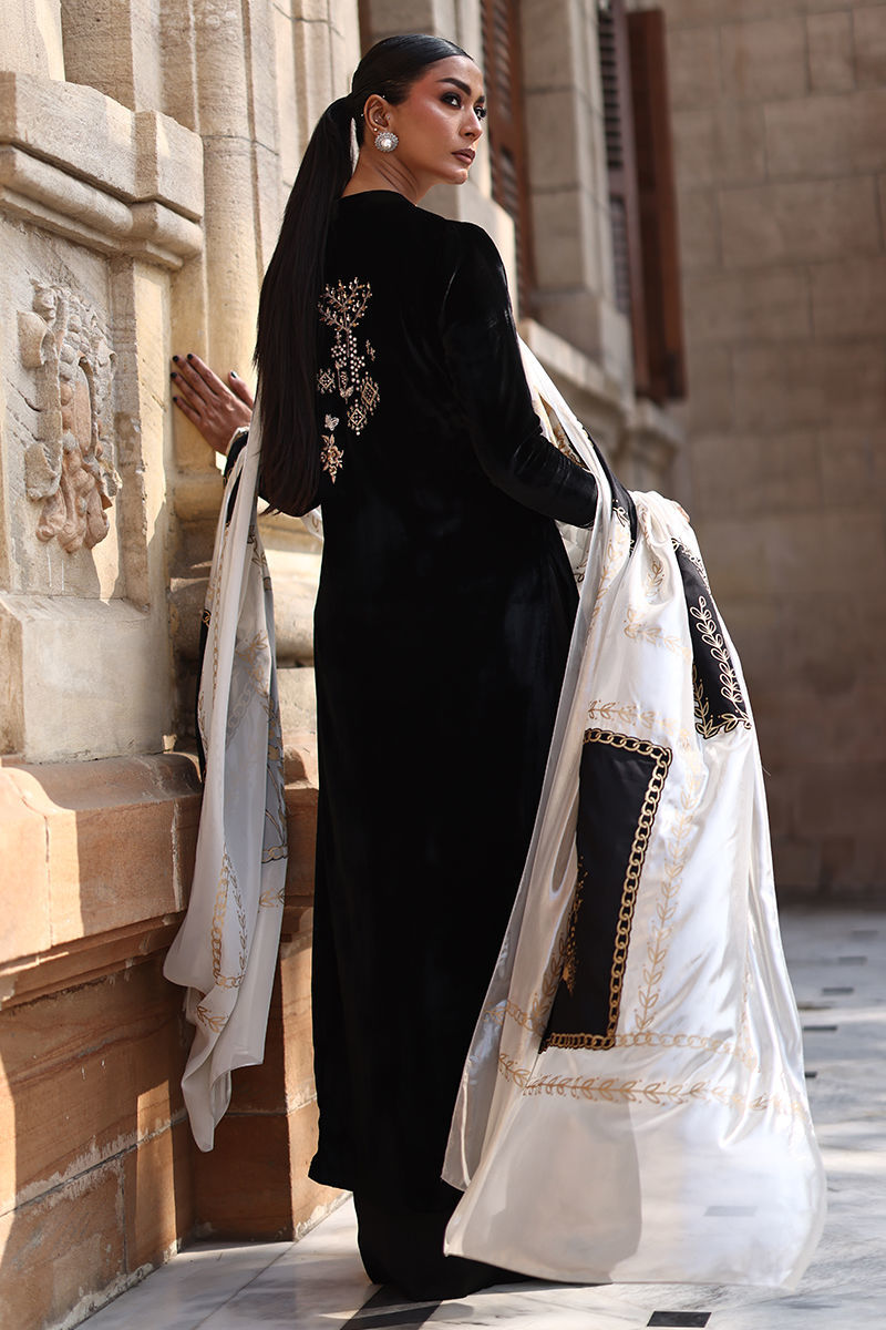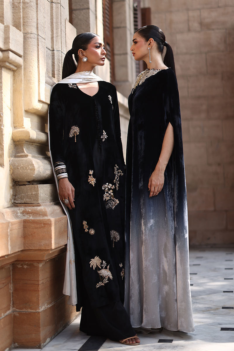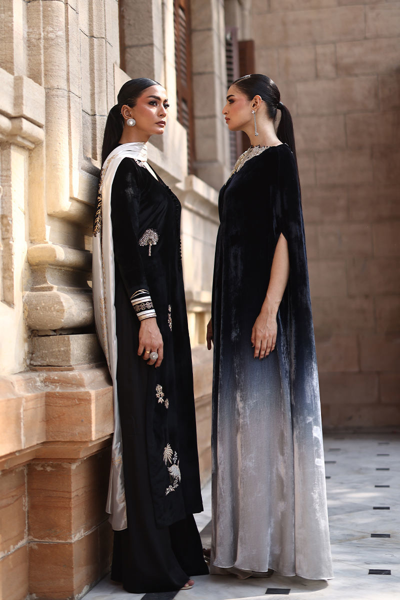 A timeless straight long shirt crafted from luxurious pure black velvet, exquisitely detailed with copper, silver, and antique zari embroidery. The design is elevated with meticulous handwork of stones, sequins, dabka, nakshi, moti, and cutdana on the front, back, and sleeves, embodying refined craftsmanship and opulent charm. Paired with cotton charmeuse culottes for a sleek, elegant silhouette, and complemented by a lame chiffon dupatta featuring a black and gold screen print with silver accents, this ensemble perfectly balances classic allure and contemporary sophistication.