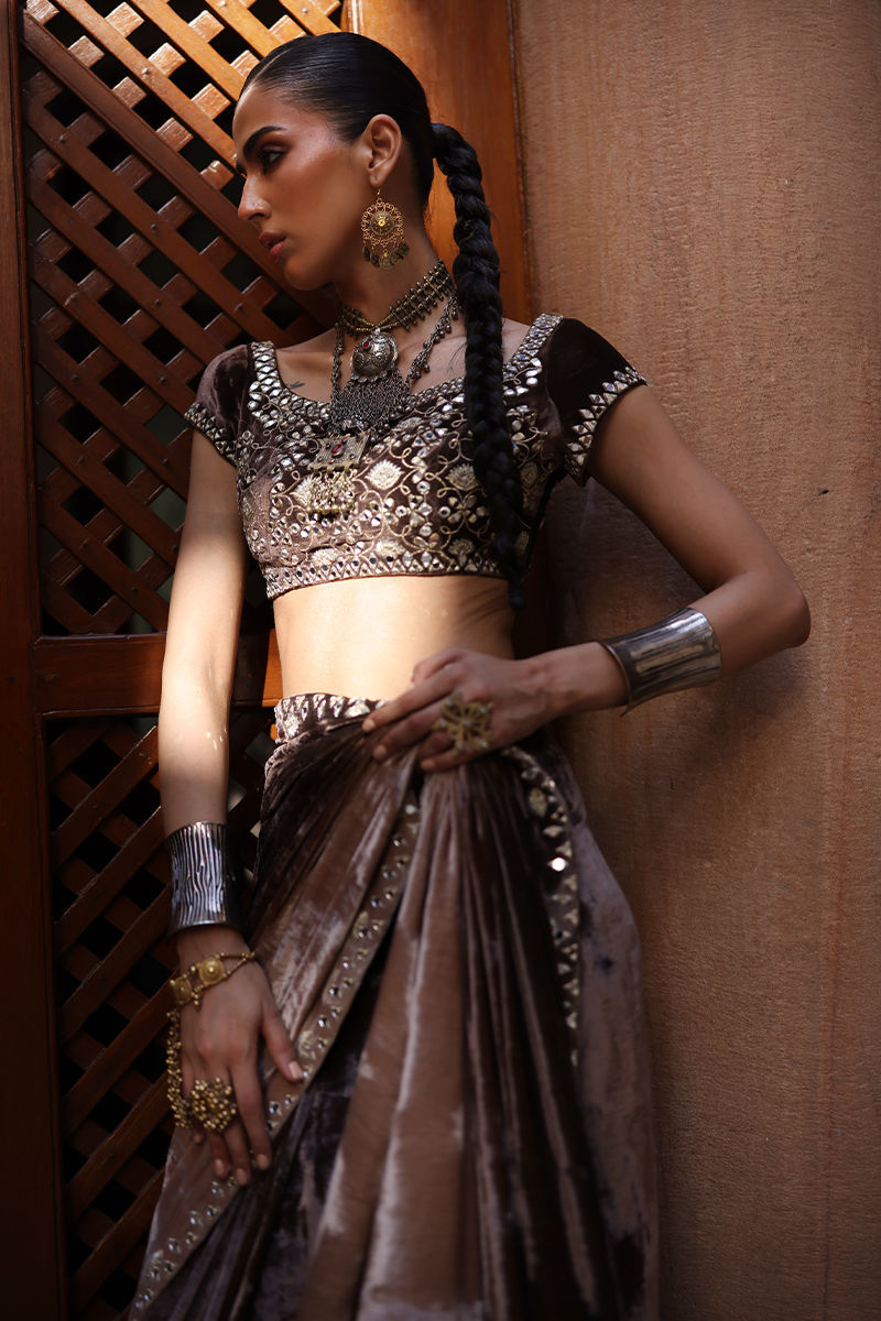 A luxurious saree crafted in pure velvet in a stunning pine wood ombre hue, adorned all over with mirror work. The ensemble is further enhanced with golden and silver zari and lorix embroidery, creating a rich, textured finish that exudes elegance and timeless charm.