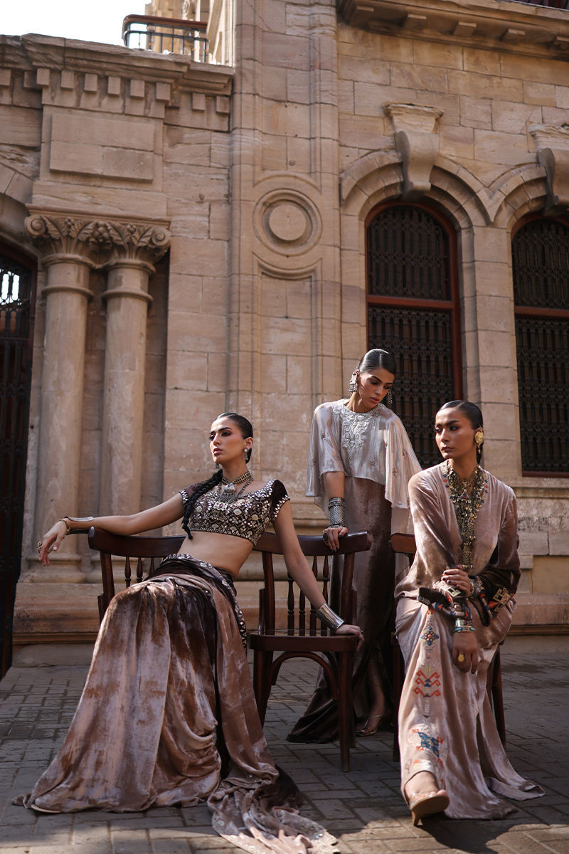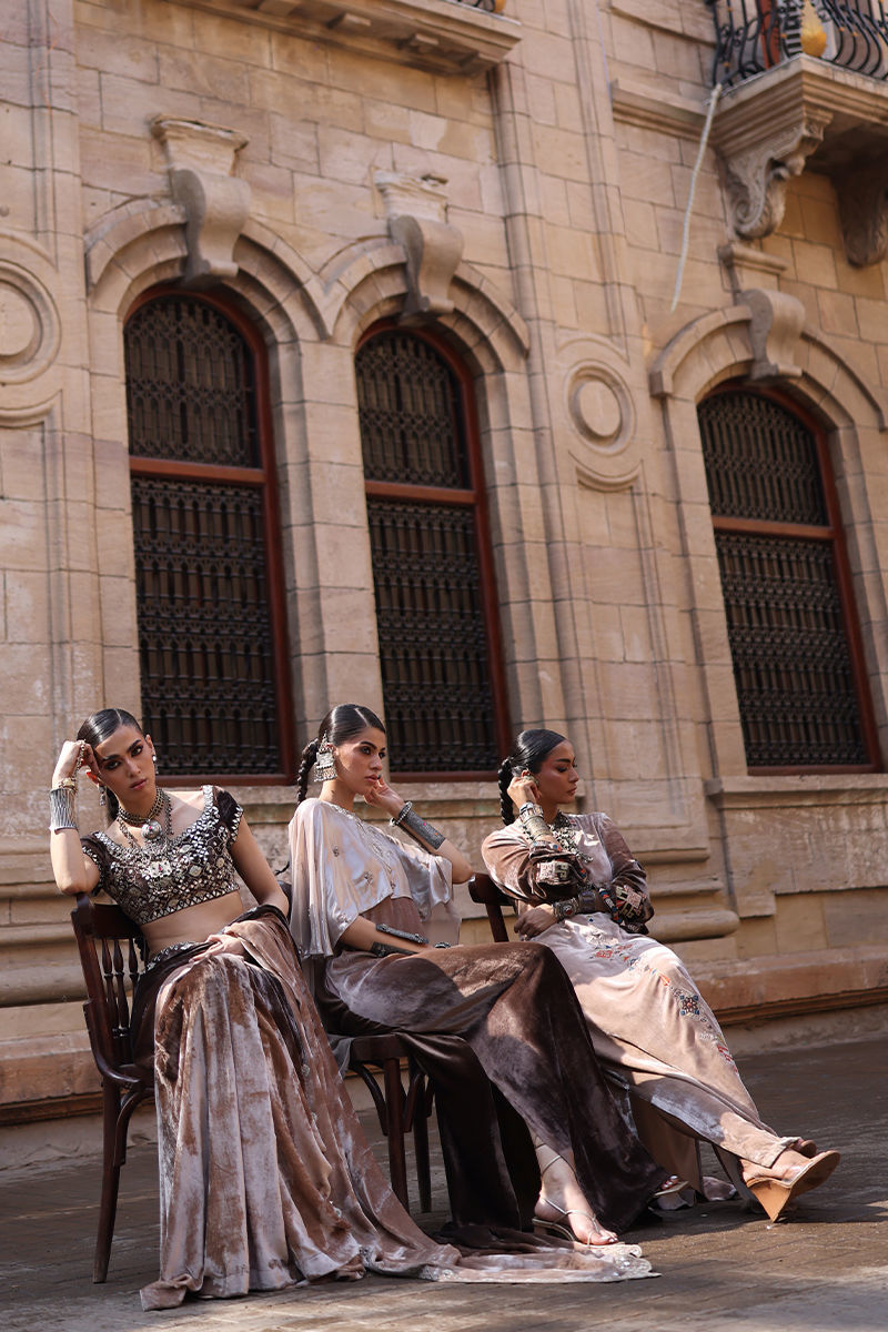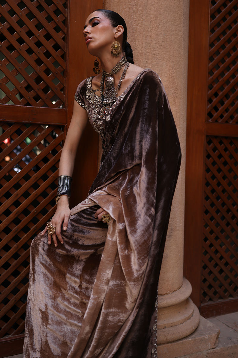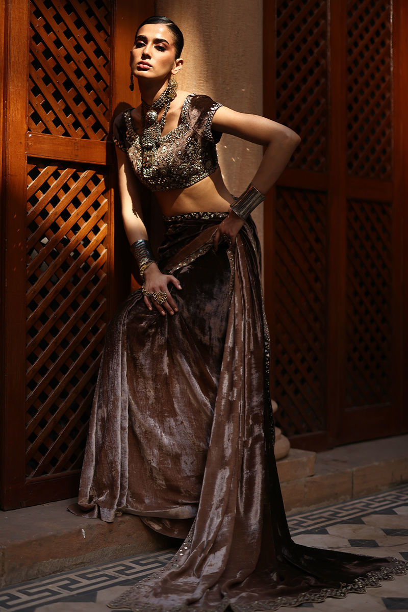 Color: Pine Wood Ombre Fabric: Pure Velvet Work Details: Embroidered and Embellished