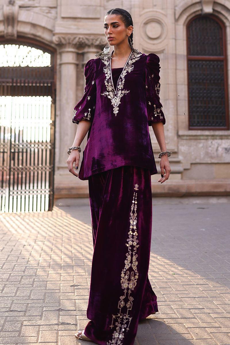 A chic short shirt crafted in luxurious pure velvet in magenta, featuring intricate mirror work complemented by gold, silver zari, and lorix embroidery on the front and sleeves. Paired with Fashi culottes in matching velvet, also adorned with mirror work and gold, silver, and lorix embroidery, creating a cohesive, elegant ensemble. The look is completed with a fog beige lame chiffon dupatta embellished with gold, silver, and lorix embroidery, adding a soft, sophisticated contrast and finishing touch.