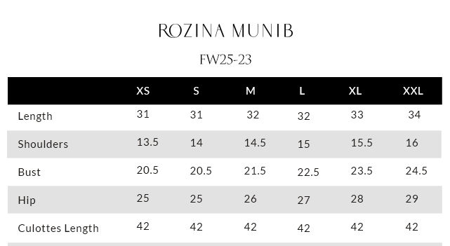 A chic short shirt crafted in luxurious pure velvet in magenta, featuring intricate mirror work complemented by gold, silver zari, and lorix embroidery on the front and sleeves. Paired with Farshi culottes in matching velvet, also adorned with mirror work and gold, silver, and lorix embroidery, creating a cohesive, elegant ensemble. The look is completed with a fog beige lame chiffon dupatta embellished with gold, silver, and lorix embroidery, adding a soft, sophisticated contrast and finishing touch.