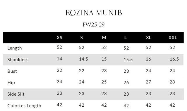 A loose-cut pure velvet shirt with pockets, beautifully rendered in a timeless Antique tone. The shirt is adorned with intricate appliqués, detailed gold embroidery, and heavy zardozi work featuring gota, dabka, nakshi, pearls, crystals, stones, cutdana, sequins, moti, and kaamdani on the front and sleeves. It is paired with pure velvet culottes and a lame chiffon dupatta, finished with delicate lace and banarsi detailing — a perfect balance of heritage artistry and contemporary grace.