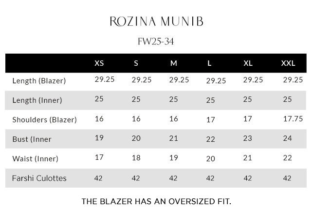 A sophisticated ensemble featuring a pure velvet waistcoat and blazer in classic Black. The blazer’s back is adorned with intricate gold and silver embroidery, while the waistcoat is detailed with imported buttons on the front for a refined finish. Paired with farshi culottes in pure velvet, embellished with silver and gold embroidery along the hem, this look blends regal craftsmanship with contemporary tailoring.