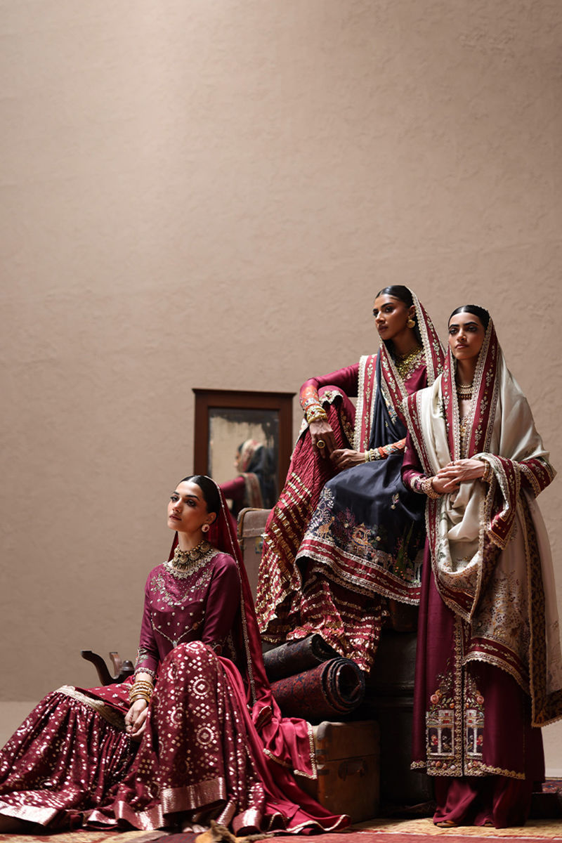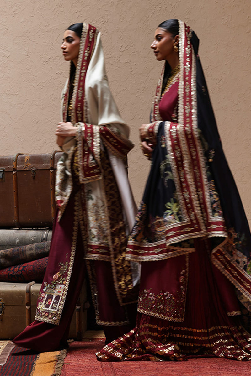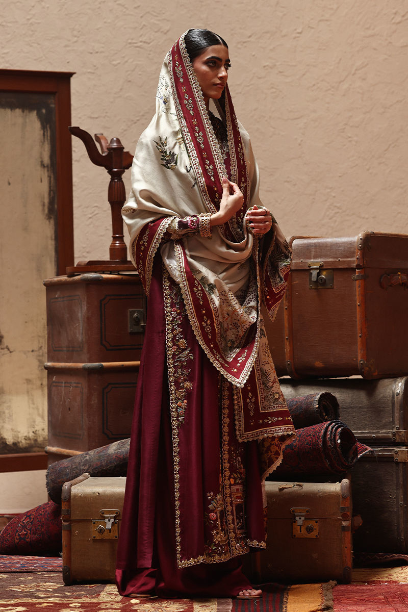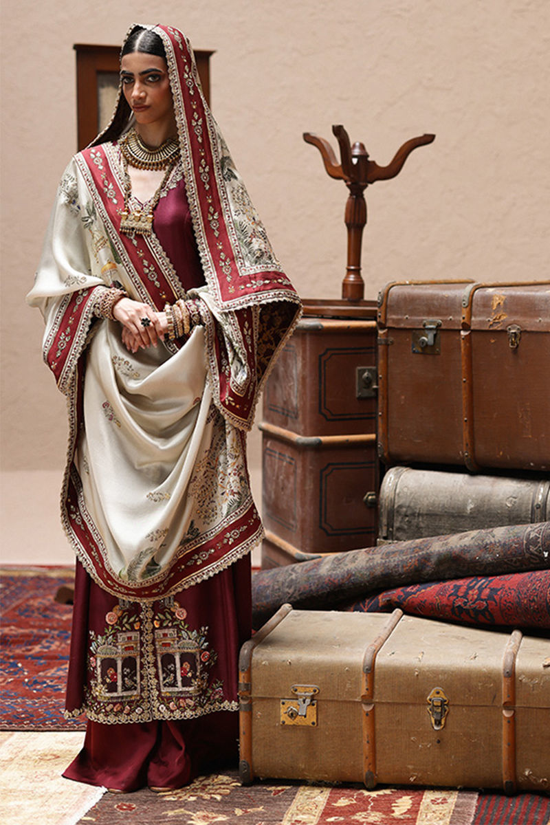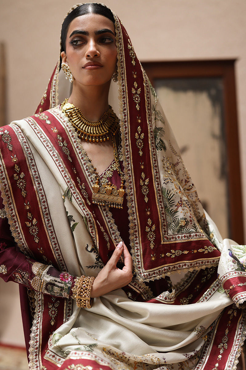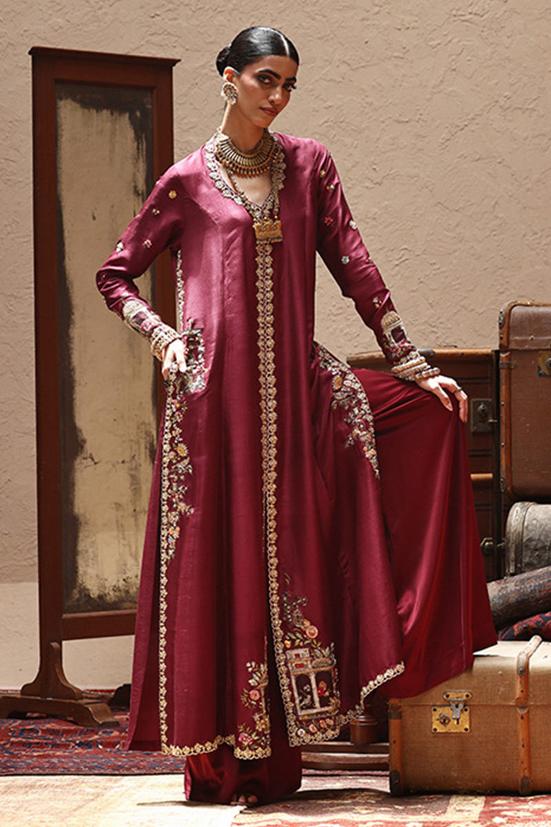 This Rio Red prince-panel ensemble in pure 80gms raw silk with pockets is adorned with Mughal-inspired digital motifs, enriched with resham, zari, zardozi, and embellishments of cutdana, crystals, stones, sequins, dabka, nakshi, and pearls on the front, back, and sleeves. Paired with cotton charmeuse culottes, it blends elegance with sophistication. Optional pure silk dupattas include a heavy four-sided gold embroidered bail with motifs, zardozi, and resham botis, or a lighter allover motif version with zardozi and resham botis. An additional beige sheesha silk shawl with Mughal-inspired digital print, zari, and zardozi detailing completes the look.