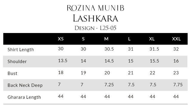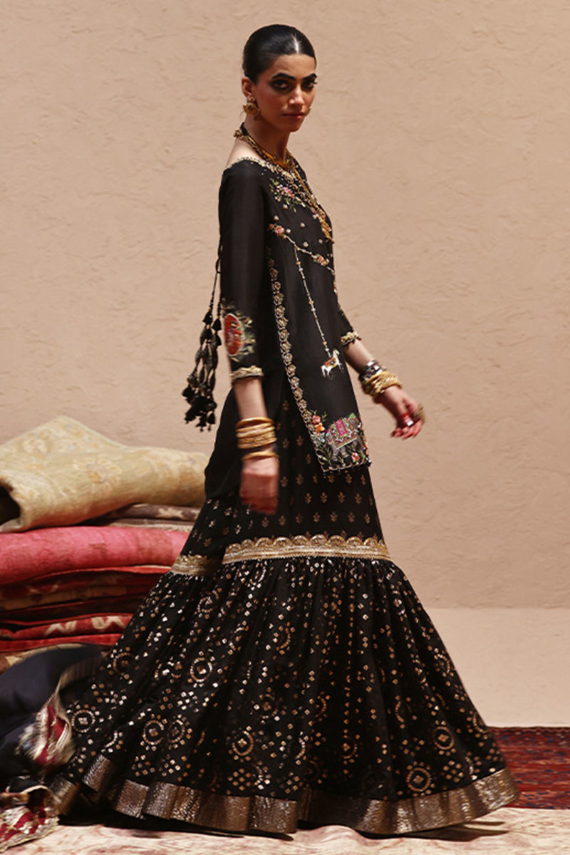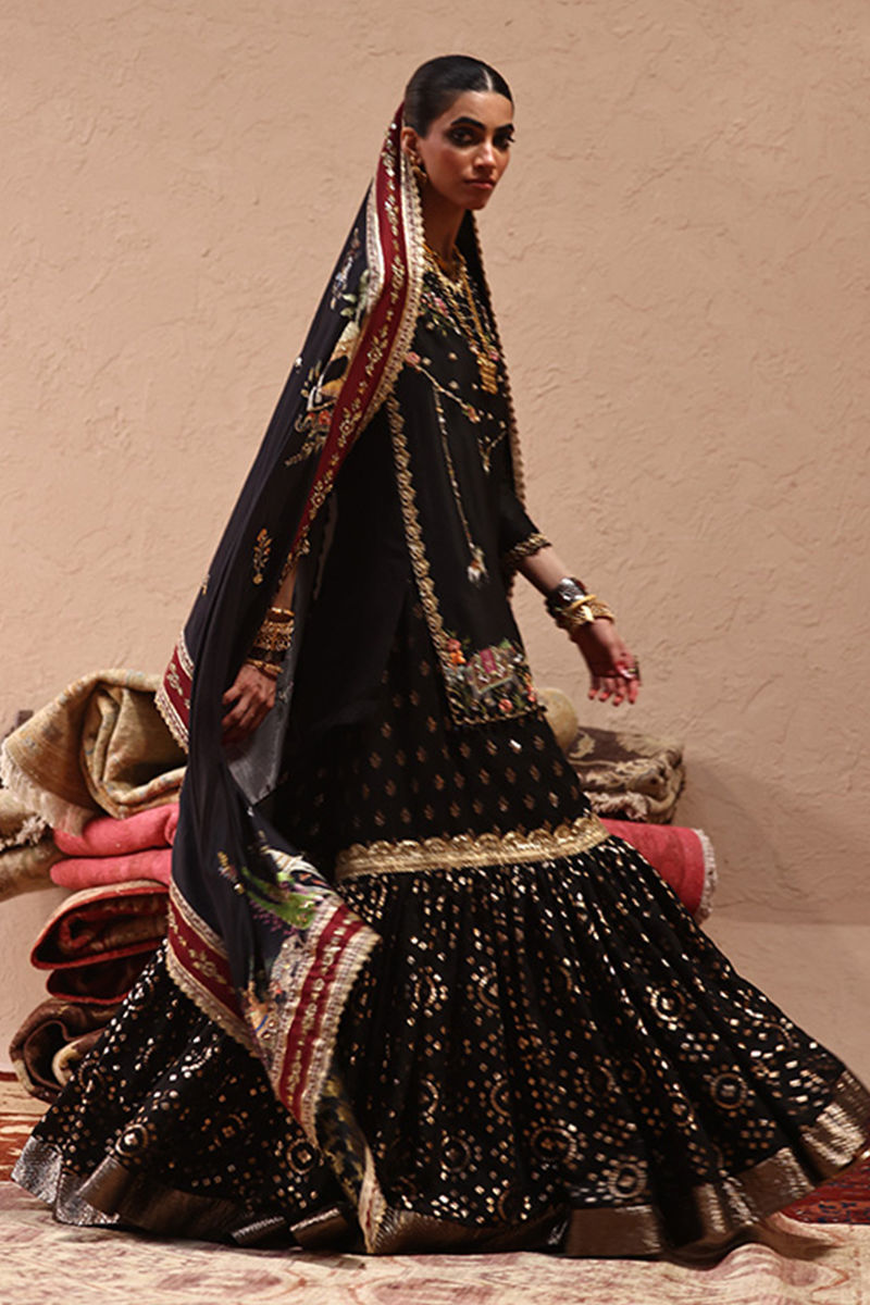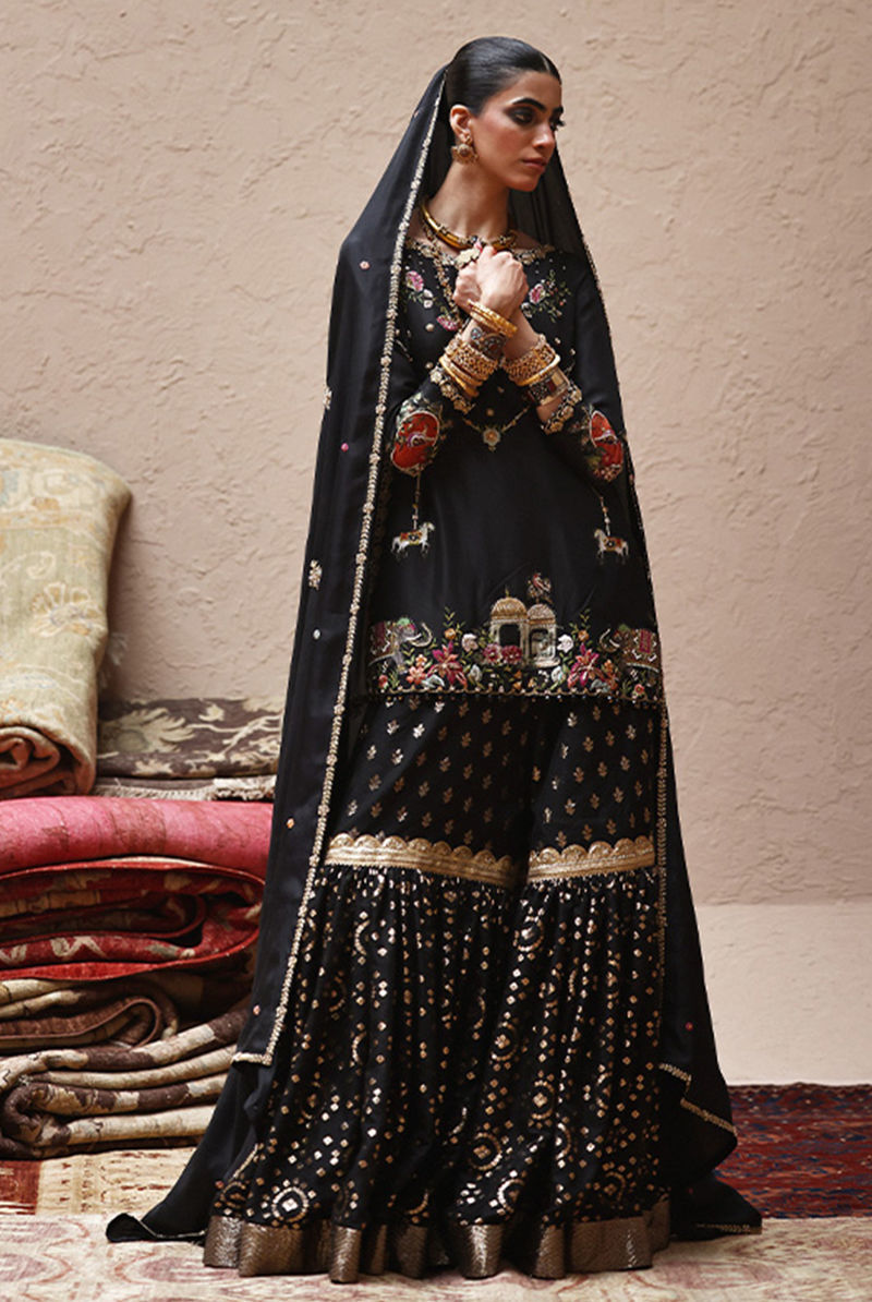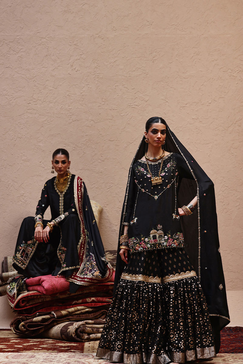 A timeless black short shirt in pure 80gms raw silk with gharara, adorned with Mughal-inspired digital motifs, resham, zari, zardozi, and embellished with cutdana, crystals, stones, sequins, dabka, nakshi, pearls, and handmade tassels on the front, back, and sleeves. The gharara comes in two lorex variations with banarsi borders. Optional pure silk dupattas include a heavy four-sided gold embroidered bail with zardozi and resham botis or a lighter allover motif with delicate detailing. An optional black sheesha silk shawl with Mughal digital print, zari, and zardozi work adds a regal finish.