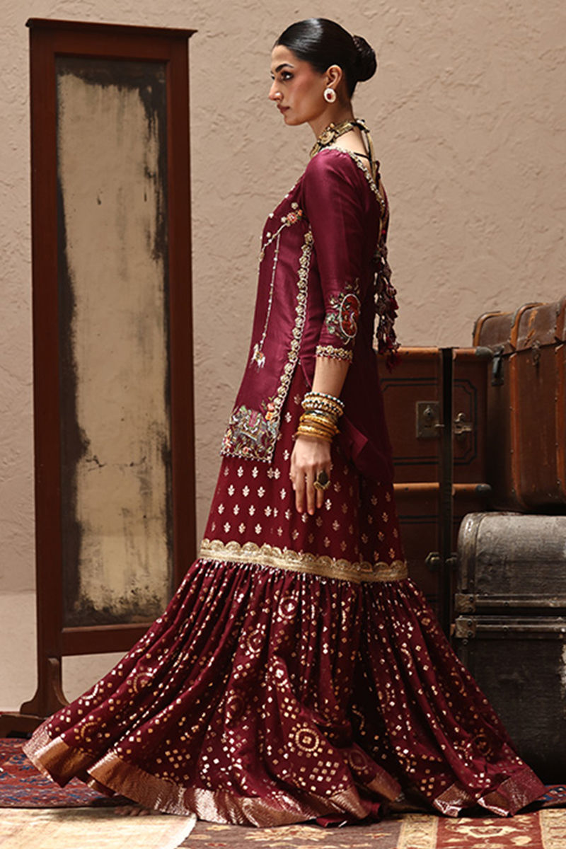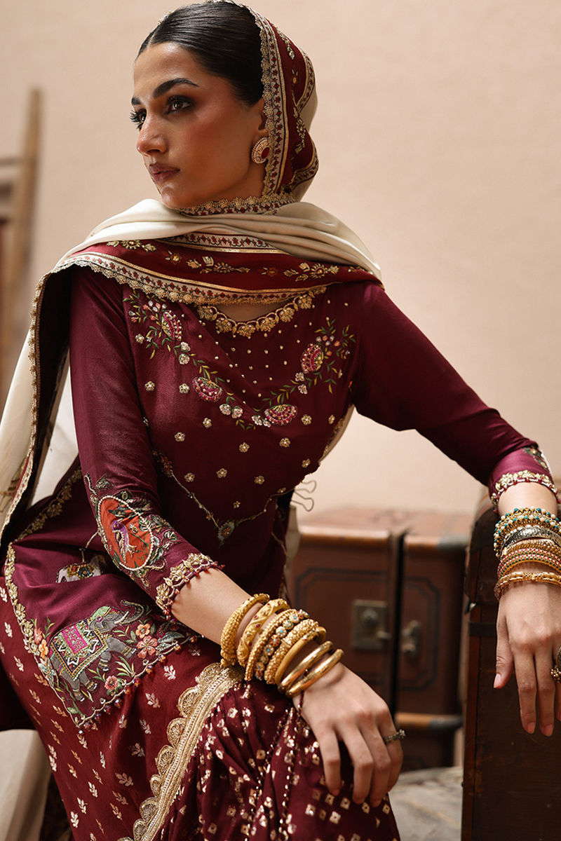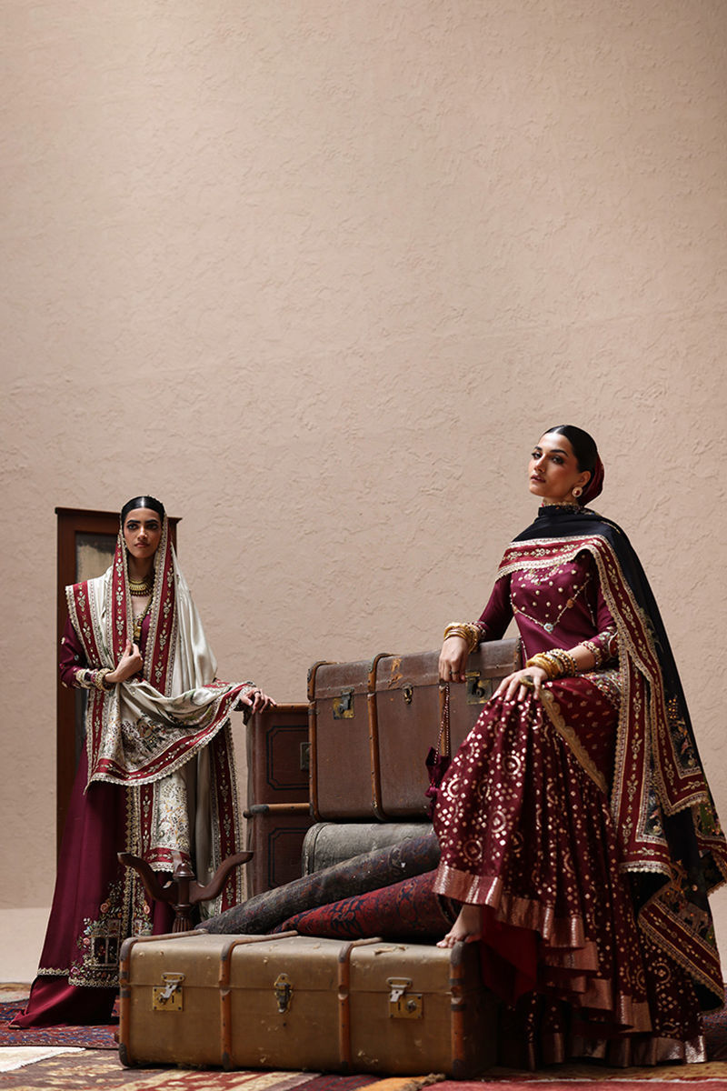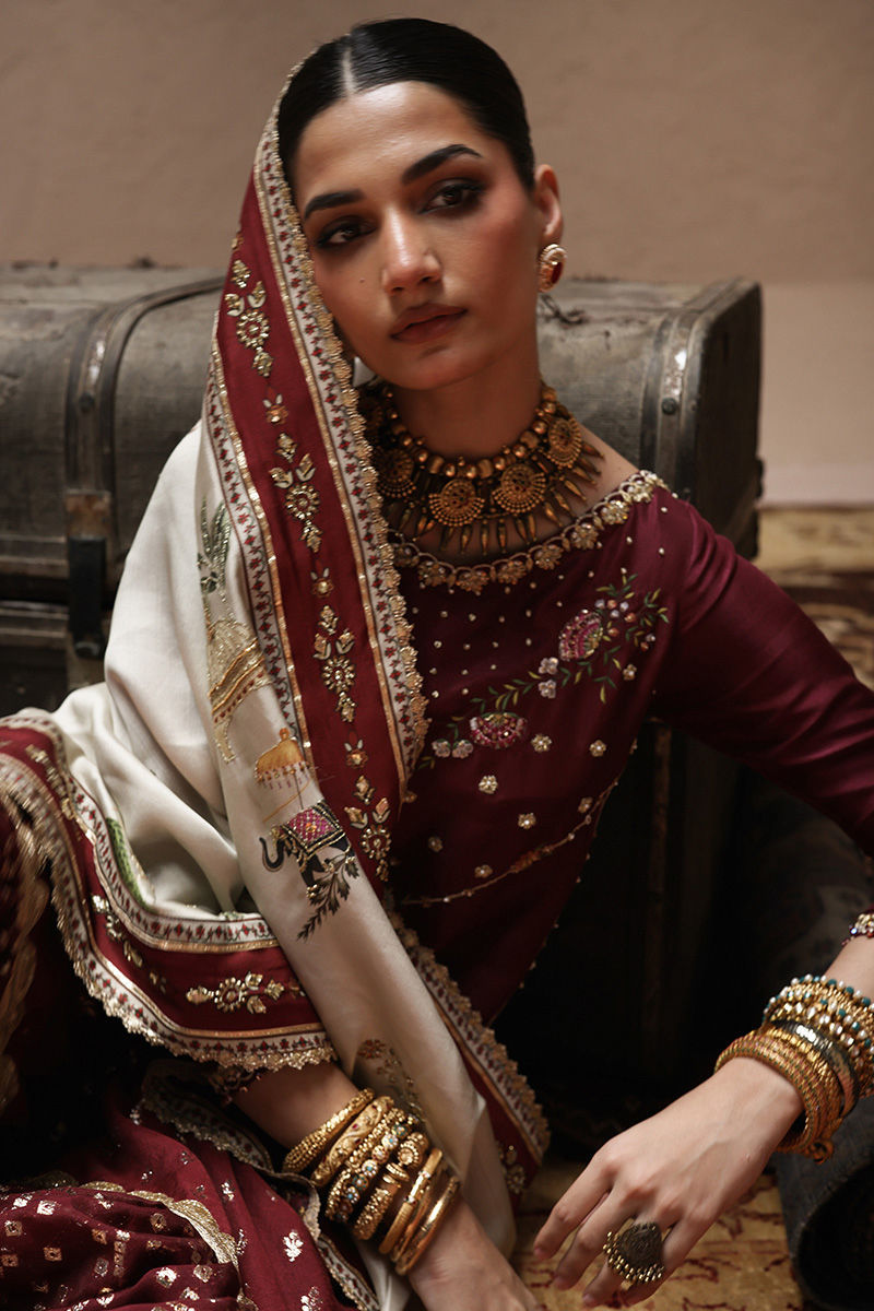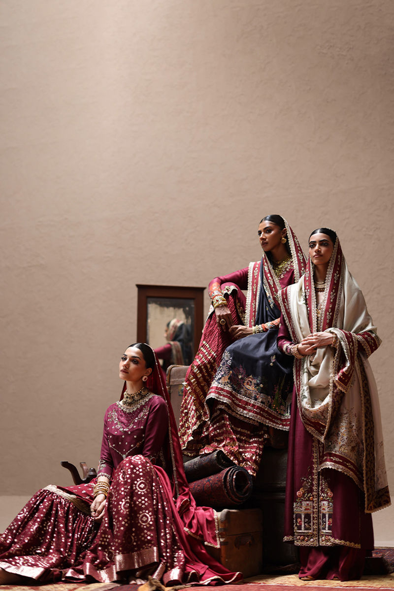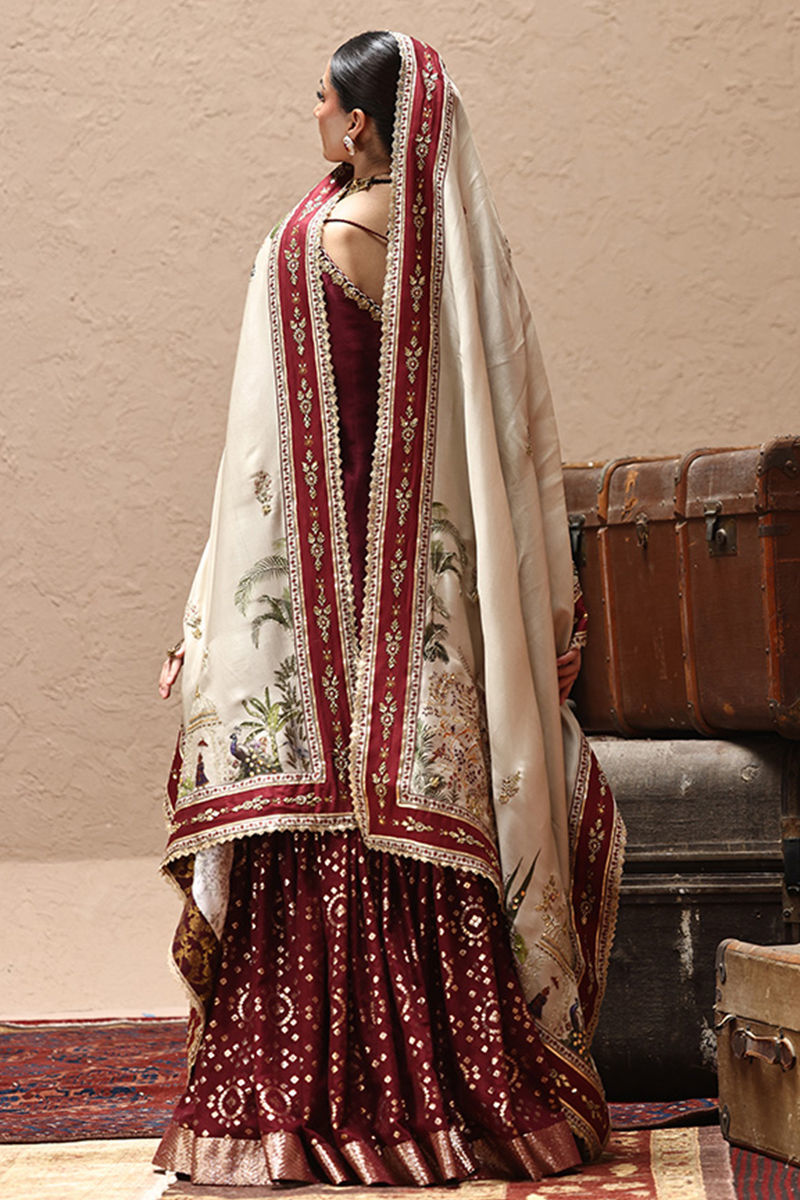 A striking Rio Red short shirt in pure 80gms raw silk with gharara, adorned with Mughal-inspired digital motifs, resham, zari, zardozi, and enriched with cutdana, crystals, stones, sequins, dabka, nakshi, pearls, and handmade tassels on the front, back, and sleeves. The gharara comes in two lorex variations with banarsi borders. Optional pure silk dupattas include a heavy four-sided gold embroidered bail with zardozi and resham botis, or a lighter allover motif with delicate detailing. A beige sheesha silk shawl with Mughal digital print, zari, and zardozi work completes the look with regal elegance.