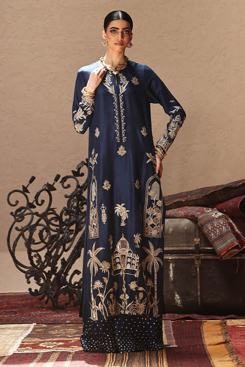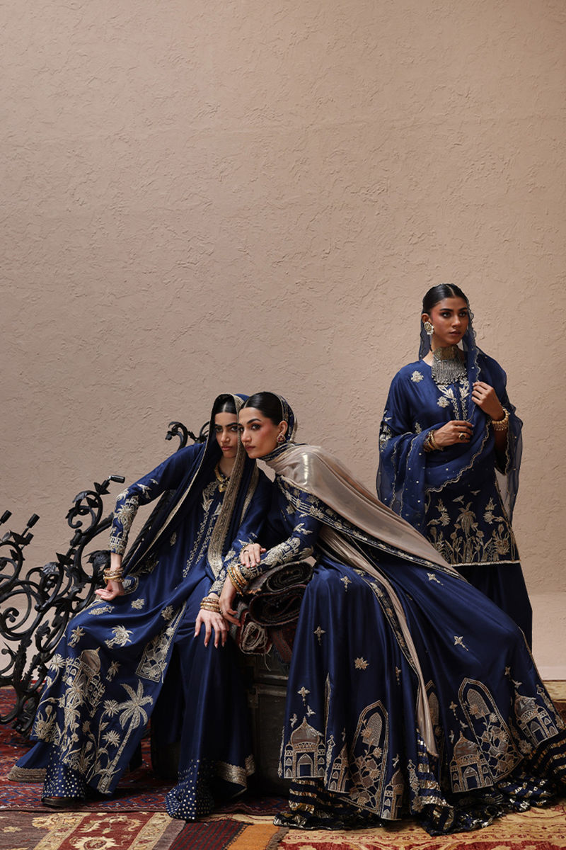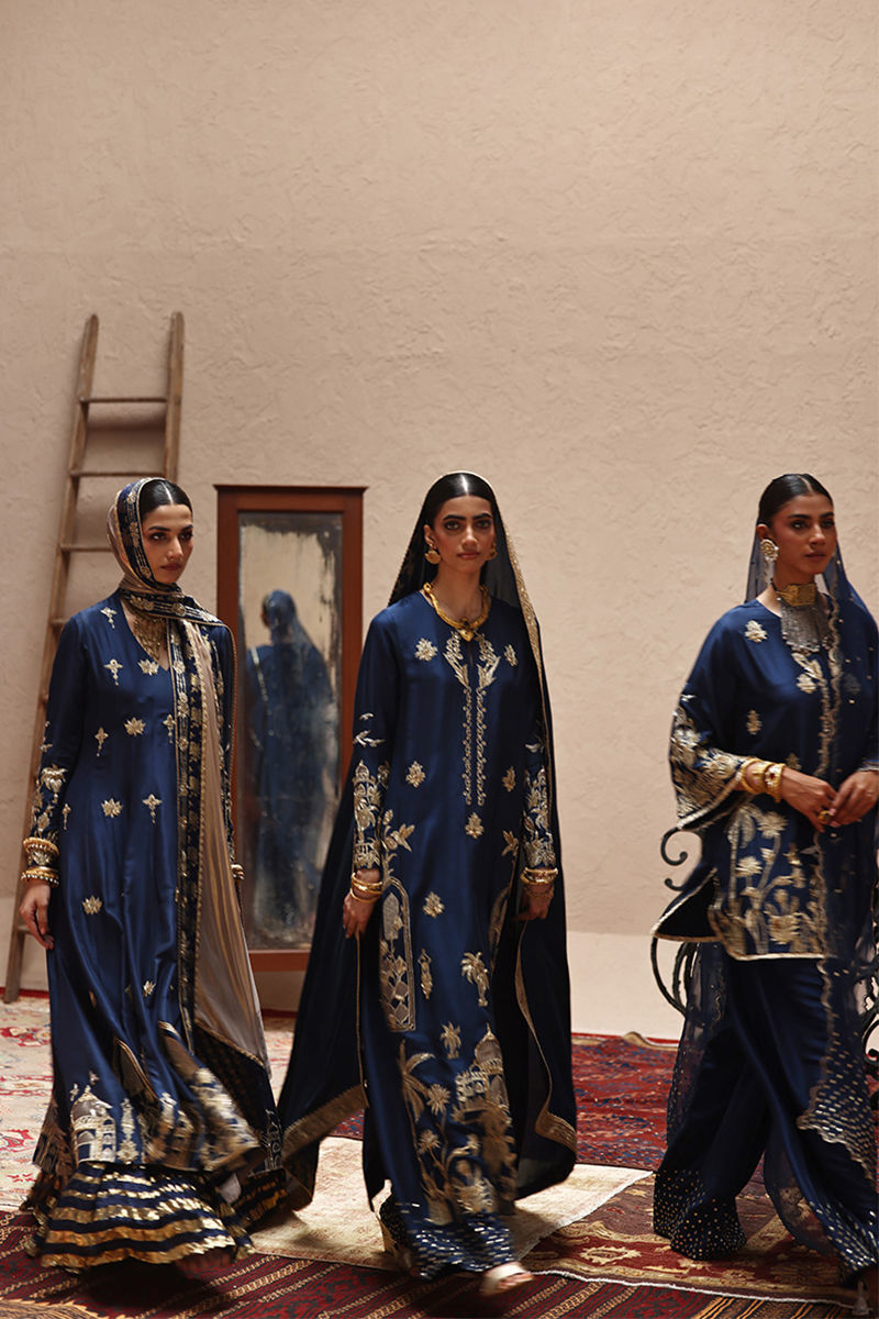 This elegant deep blue ensemble in pure 80gms raw silk features a straight long shirt, richly decorated with light and dark gold zari embroidery, antique lame, and intricate zardozi work including kora, dabka, cutdana, stones, pearls, nakshi, sequins, and delicate silver bird motifs across the front and sleeves. It is paired with matching culottes, finished with sequins at the hem for a subtle sparkle. Completing the look are three dupatta options: a gold lame dupatta with four-sided zari embroidery, handworked borders, and banarsi detailing; a pure organza dupatta with zari embroidered scallops, sequined handwork border, and chan; and a pure medium silk dupatta with a classic four-sided gold border.