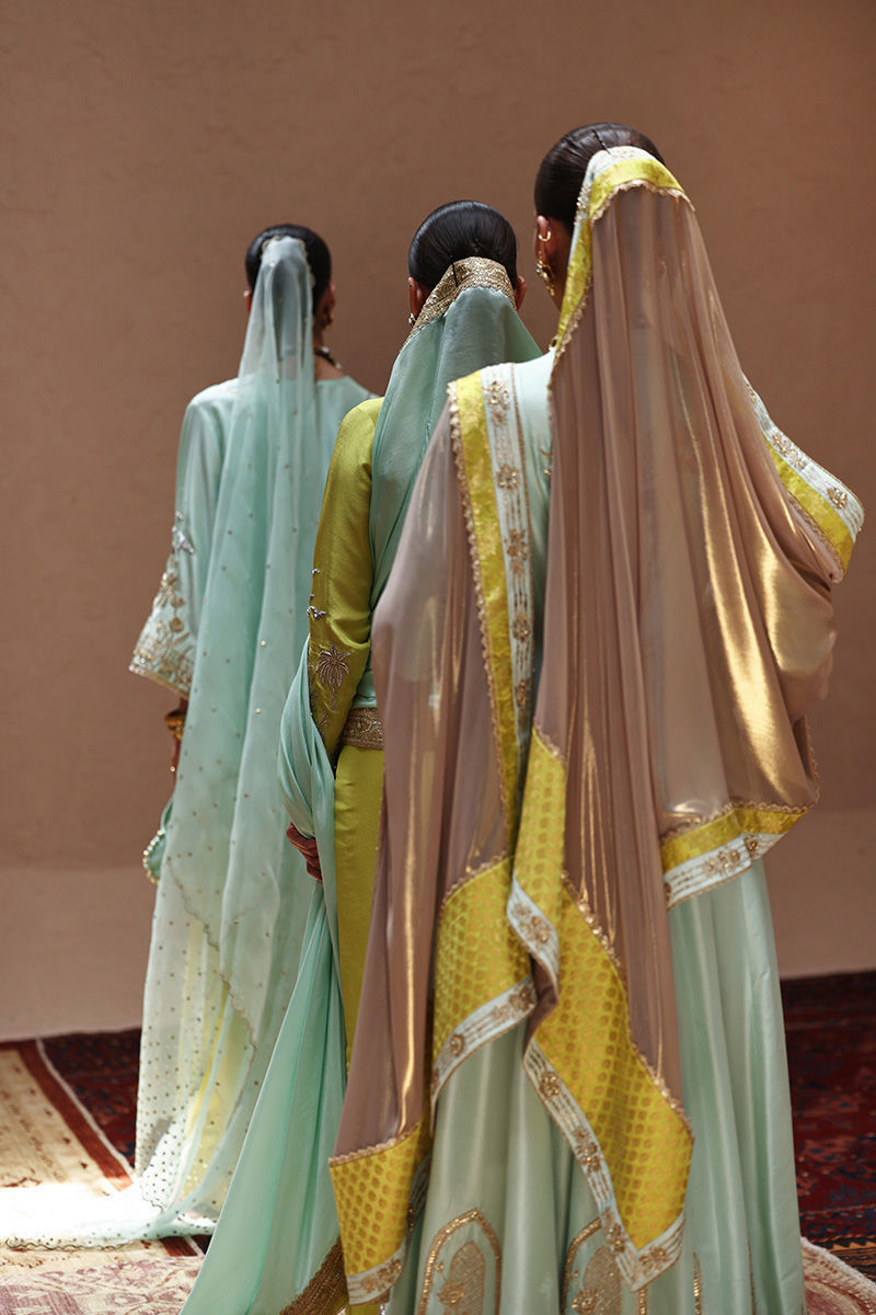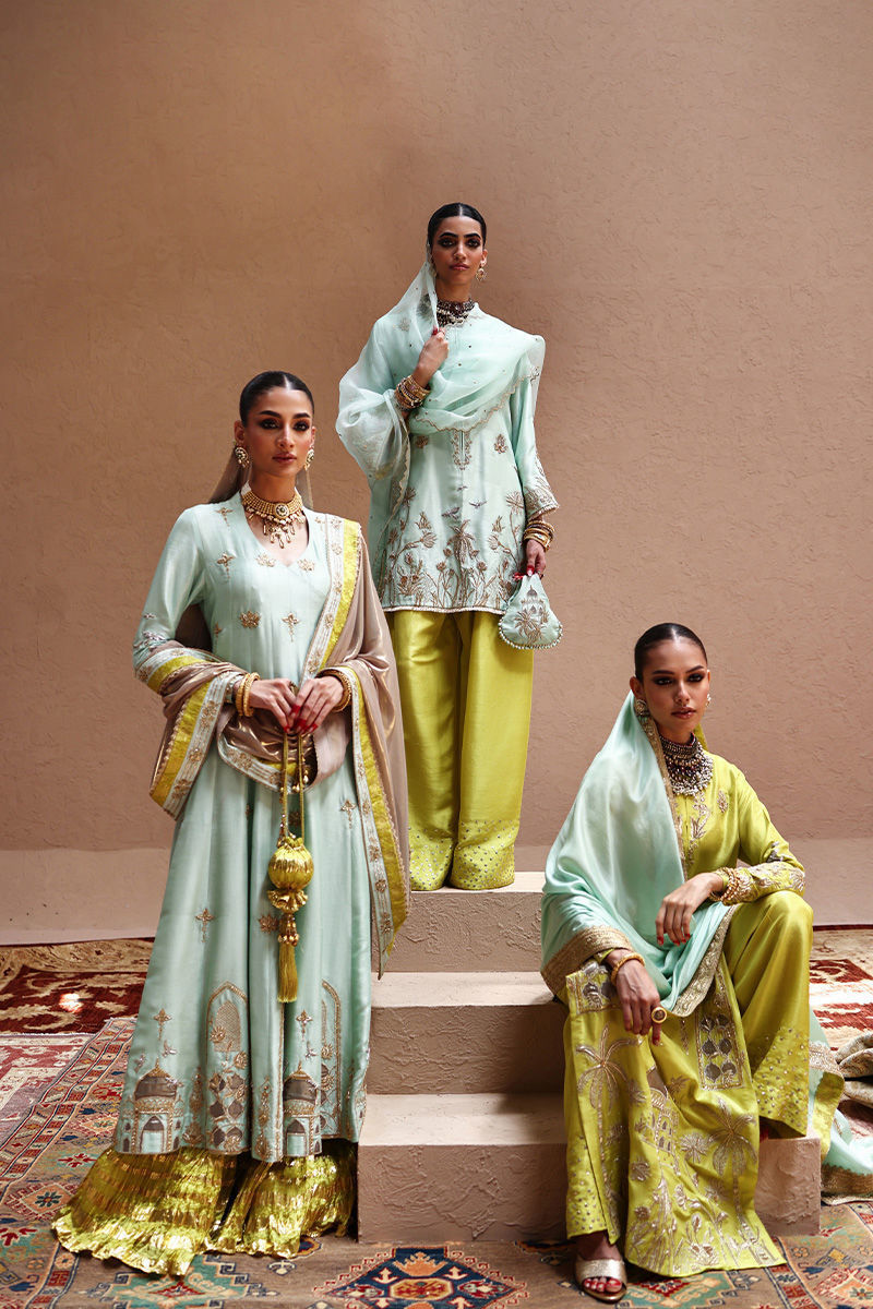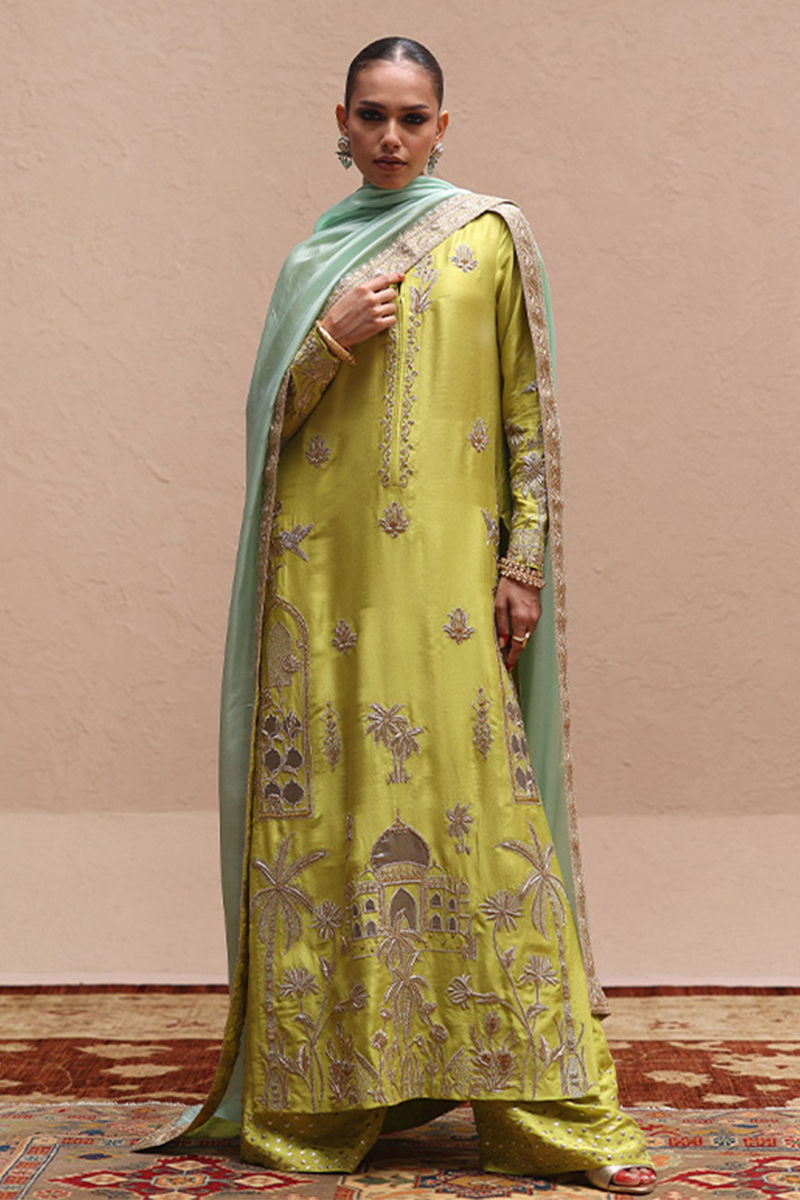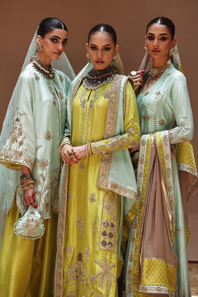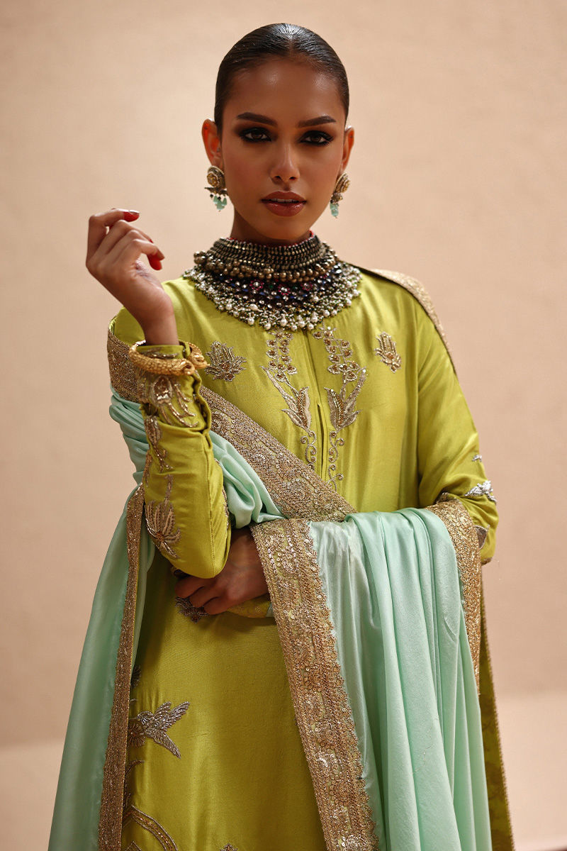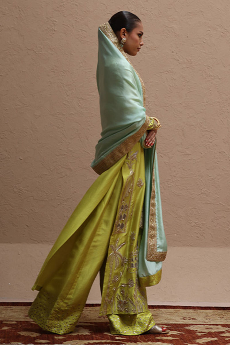 Radiant in lime, this straight long shirt in pure 80gms raw silk is beautifully adorned with light and dark gold zari embroidery, antique lame, and intricate zardozi work featuring kora, dabka, cutdana, stones, pearls, nakshi, sequins, and silver bird motifs on the front and sleeves. It pairs with culottes finished with sequins at the hem for subtle shimmer. The look is completed with three dupatta options: an aqua pure medium silk dupatta with a four-sided gold border, an aqua pure organza dupatta with scalloped zari embroidery, sequined handworked border and chan, and a gold lame dupatta detailed with zari embroidery, handworked borders, and banarsi finishing.