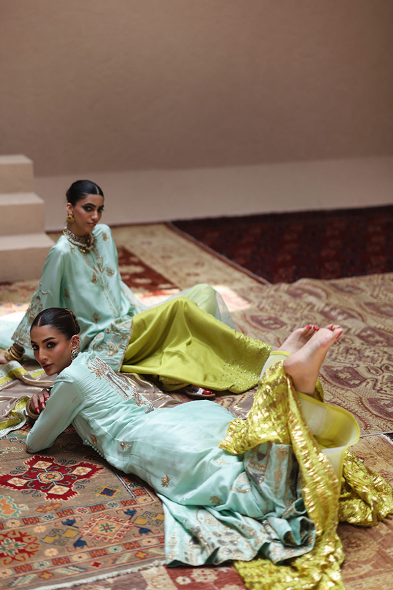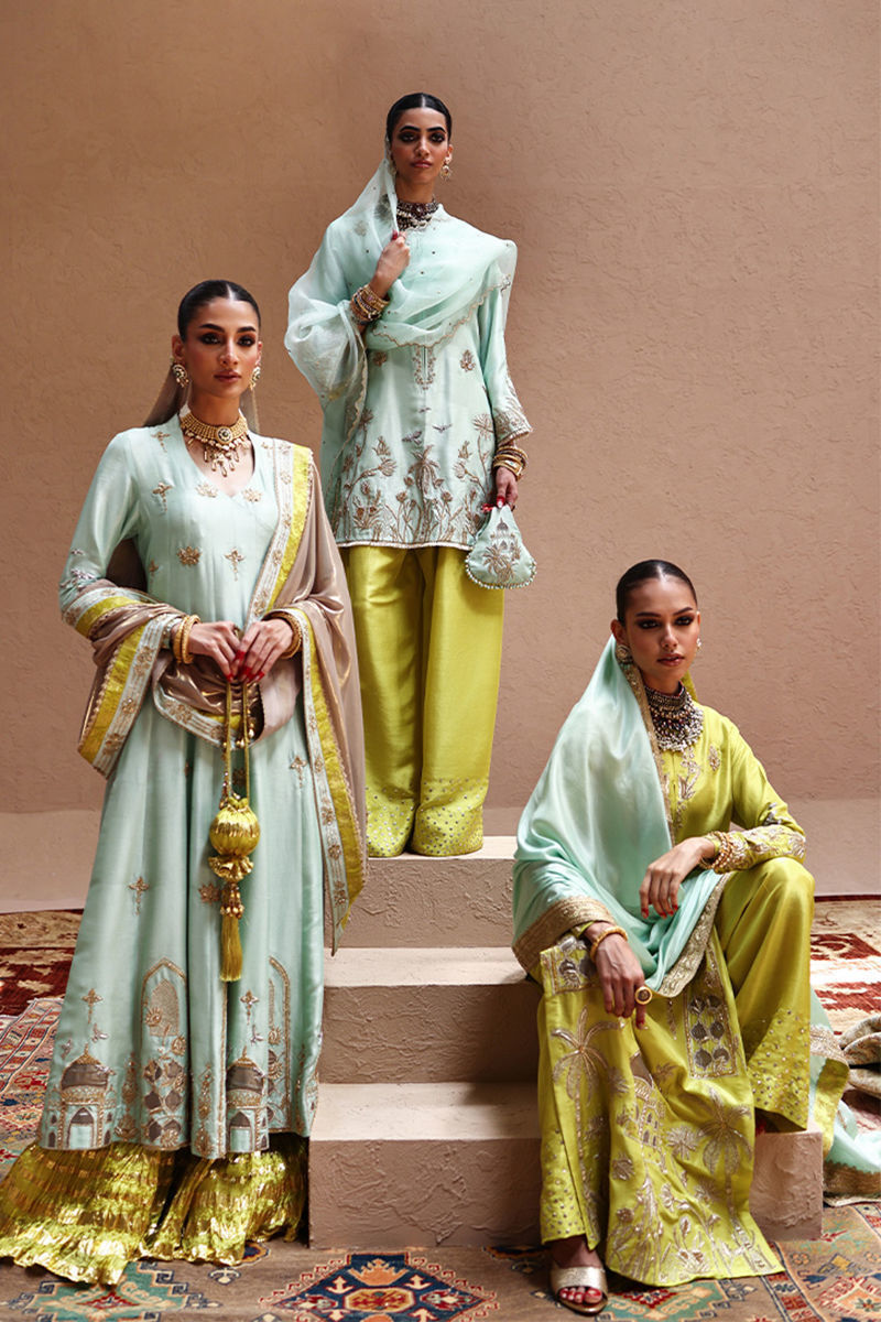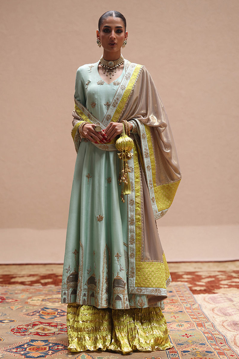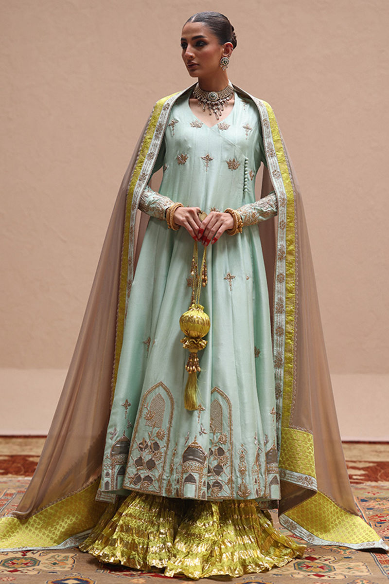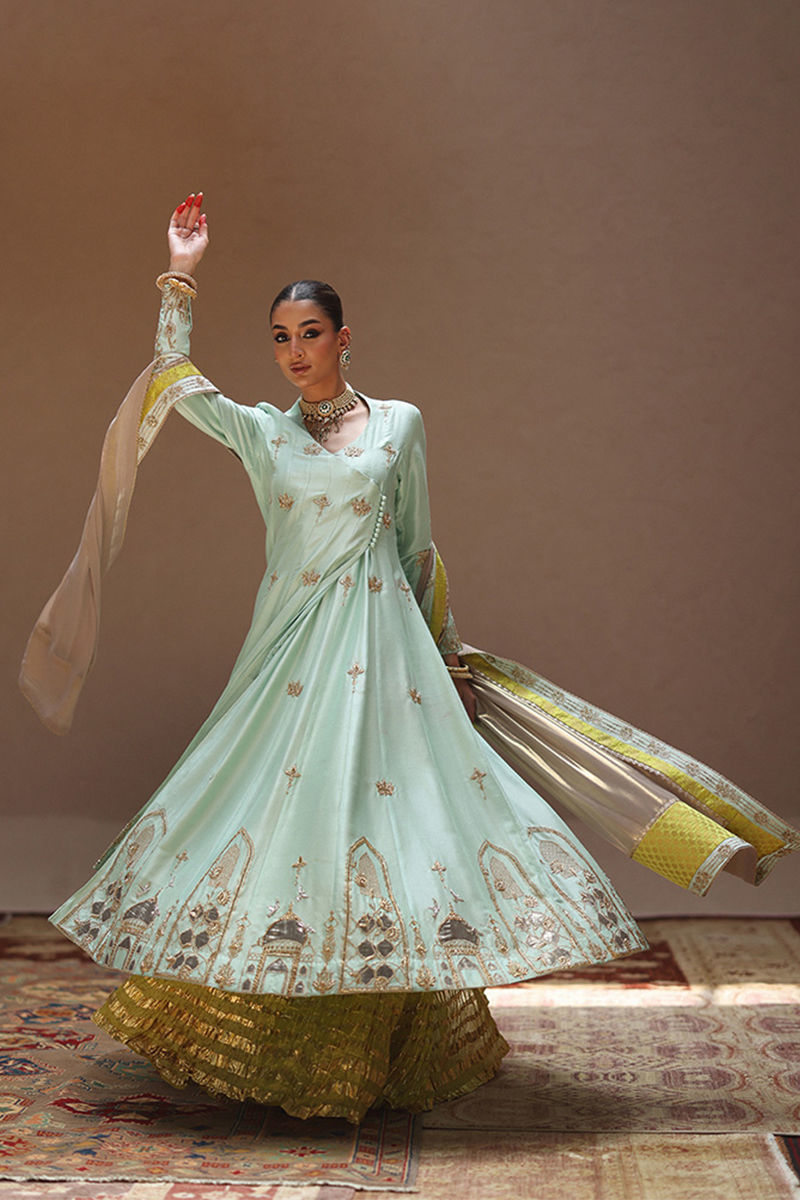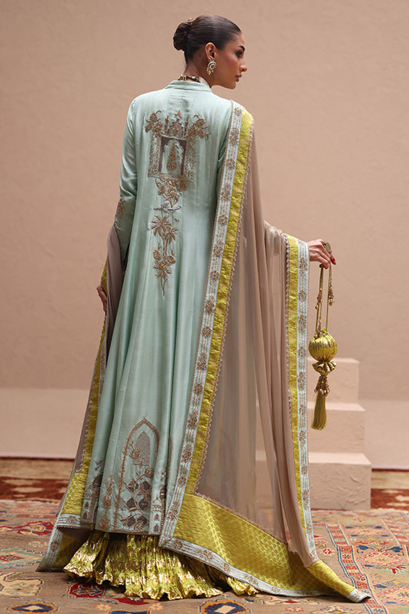 This aqua angarkha kalidaar in pure 80gms raw silk is adorned with light and dark gold zari embroidery, antique lame, and intricate zardozi work featuring kora, dabka, cutdana, stones, pearls, nakshi, sequins, and silver bird motifs on the front, sleeves, and back. Paired with crushed lime dhaka pants for a fresh, vibrant contrast, it can be styled with your choice of dupatta: a pure medium silk with a four-sided gold border, a pure organza with scalloped zari embroidery, sequined handworked border and chan, or a gold lame dupatta enriched with zari embroidery, handworked borders, and banarsi detailing.