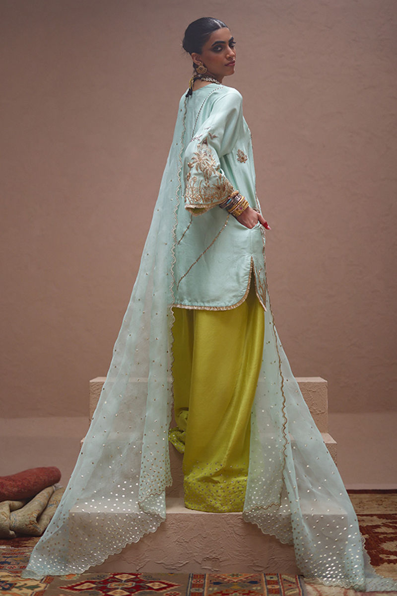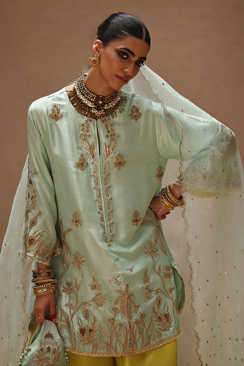 A refreshing statement in pure 80gms raw silk, this aqua short shirt with pockets is beautifully adorned with light and dark gold zari embroidery, antique lame, and zardozi work including kora, dabka, cut dana, stones, pearls, nakshi, sequins, and silver bird motifs on the front, sleeves, and back. It is paired with lime farshi culottes delicately finished with sequins at the hem for a graceful shimmer. The look can be styled with three versatile dupattas: a pure aqua silk with a classic four-sided gold border, a pure organza dupatta featuring scalloped zari embroidery with sequined handworked borders and chan, or a gold lame dupatta enriched with zari embroidery, handworked borders, and banarsi detailing for a regal finish.