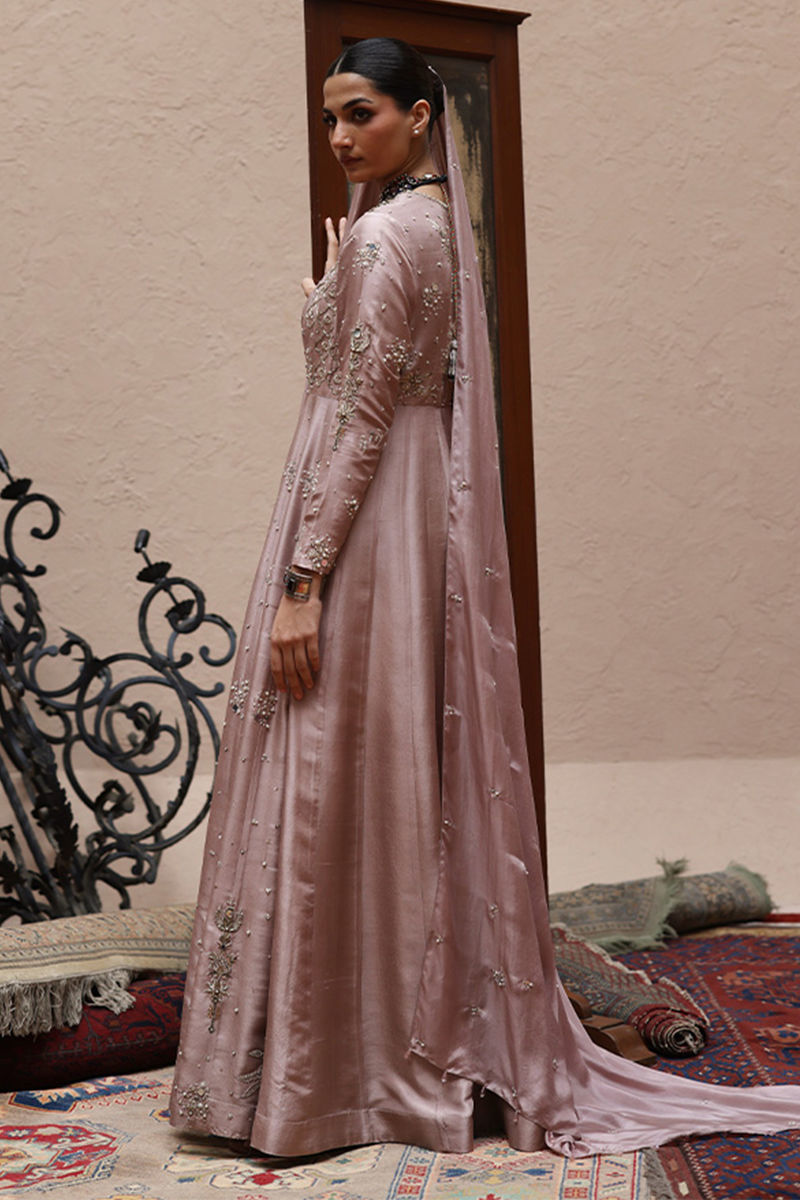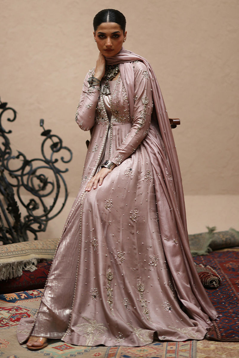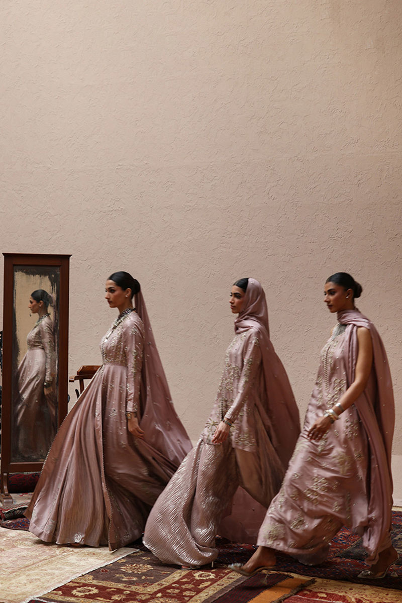 Misty Rose front-open kalidaar in pure 80gms raw silk, adorned with rose gold and antique zari embroidery with intricate zardozi work featuring kora, dabka, cutdana, stones, pearls, nakshi, sequins, and mirror on the front, sleeves, and back. The look is paired with a shimmer silk body, a shimmer crush flare, and a pure medium silk dupatta beautifully detailed with all-over botis and chan, finished with pearls, mirrors, and stones.