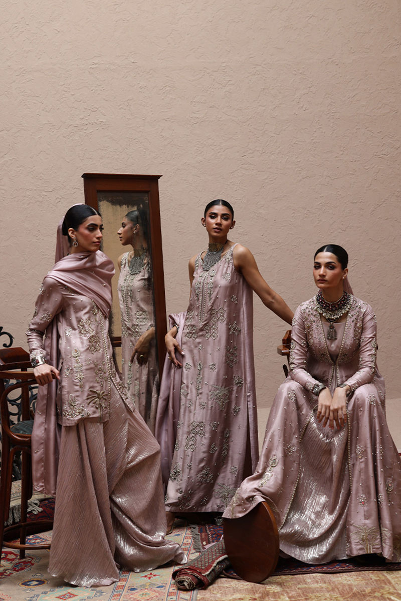 The straight kaftan with slits in Misty Rose color is crafted from pure 80gms raw silk and embellished with gold and antique zari embroidery, enriched with zardozi work featuring kora, dabka, cutdana, stones, pearls, nakshi, sequins, and mirrors on the front, sleeves, and back.It comes with versatile bottom options, including pants in pure raw silk or cotton charmeuse, and culottes in either fabric. The look is completed with a pure medium silk dupatta detailed with all-over botis and chan, delicately accented with pearls, mirrors, and stones.