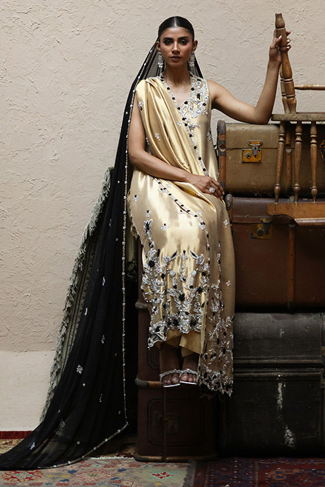 The straight long shirt in Rich Gold is tailored from luxurious lame fabric, intricately adorned with silver and black zari embroidery and enriched with heavy zardozi work including kora, dabka, cutdana, stones, pearls, nakshi and sequins on the front and back. Paired with cotton charmeuse culottes, the ensemble embodies effortless grace and sophistication, while a black lame chiffon dupatta completes the look with its four-sided zari and hand-embroidered bail detailed with all-over silver and gold zardozi botis for a regal finish.