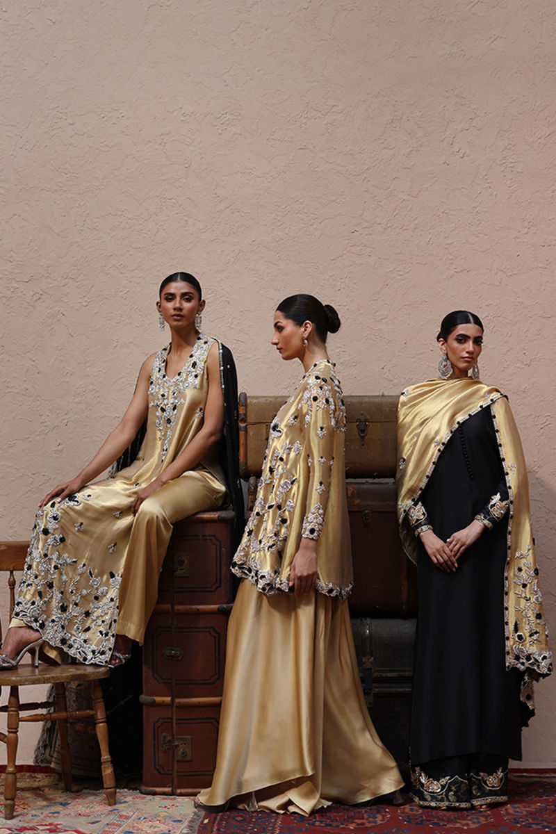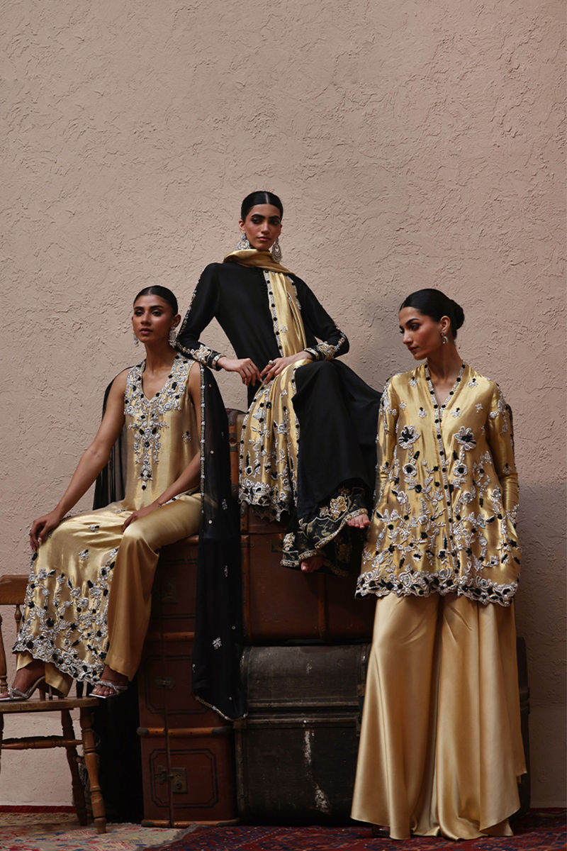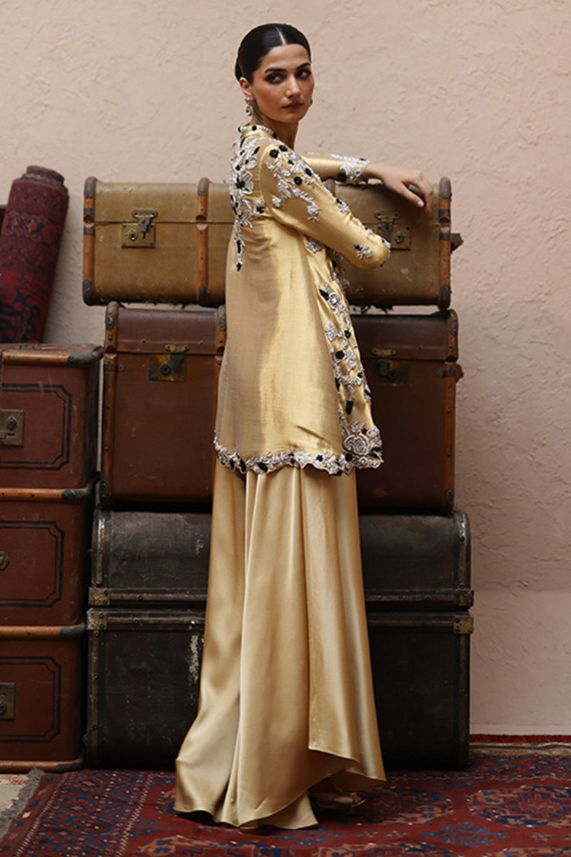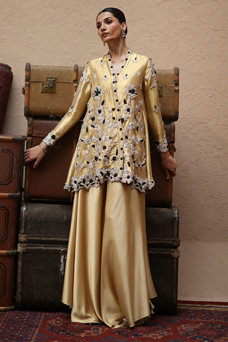 The short peplum in Rich Gold is tailored from luxurious lame fabric and intricately embellished with silver and black zari embroidery. Heavy zardozi detailing with kora, dabka, cutdana, stones, pearls, nakshi, and sequins graces the front, back, and sleeves, creating a regal statement. Paired with cotton charmeuse flare pants, the ensemble embodies elegance with a modern twist.