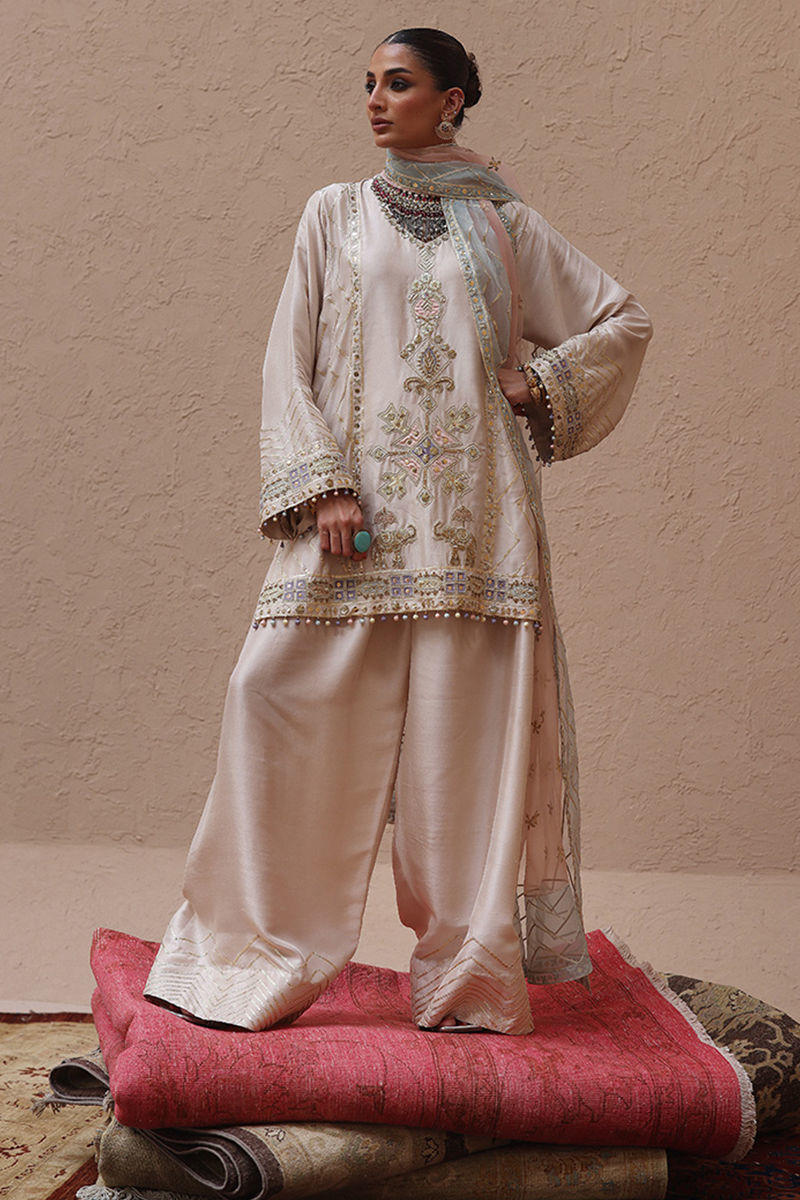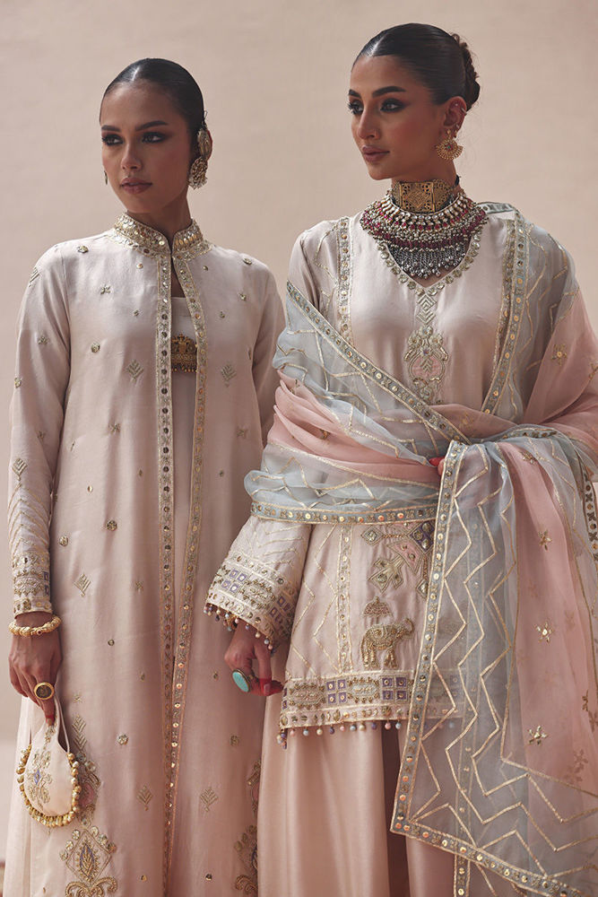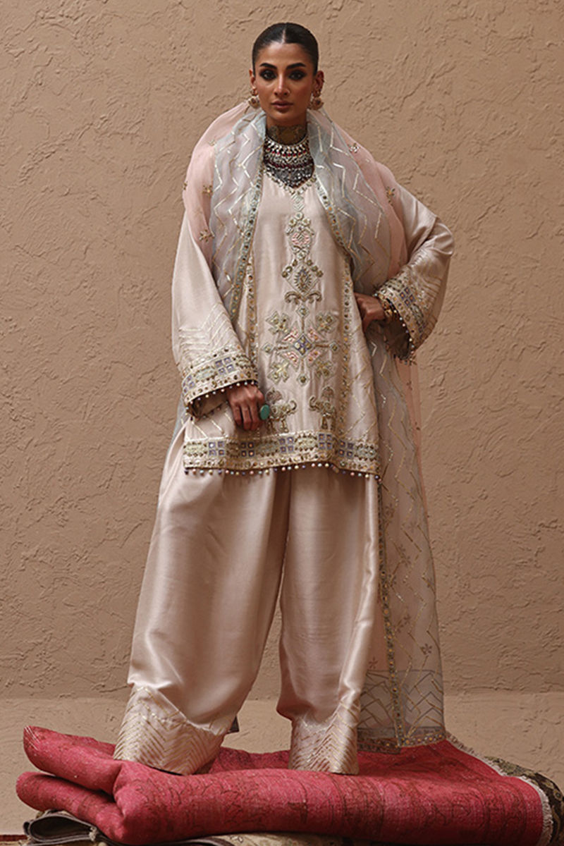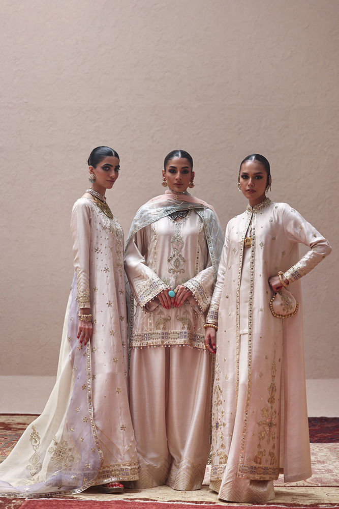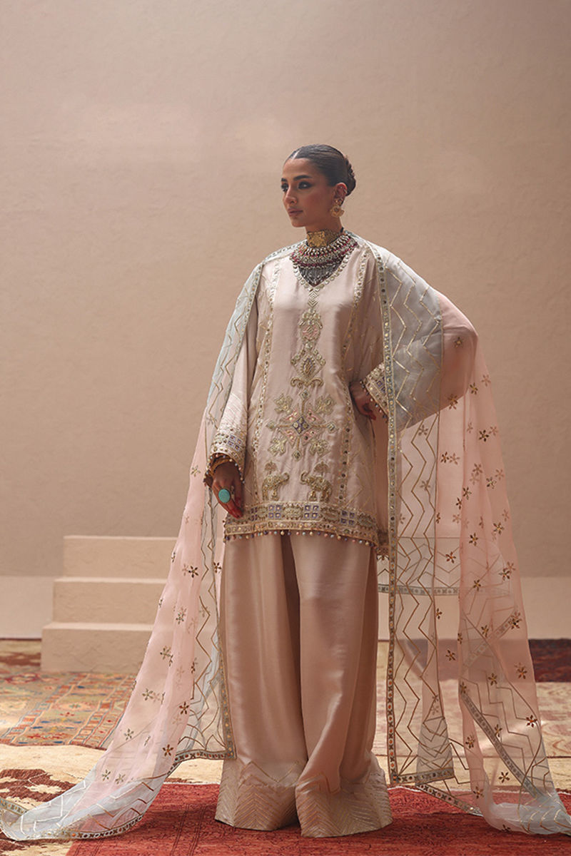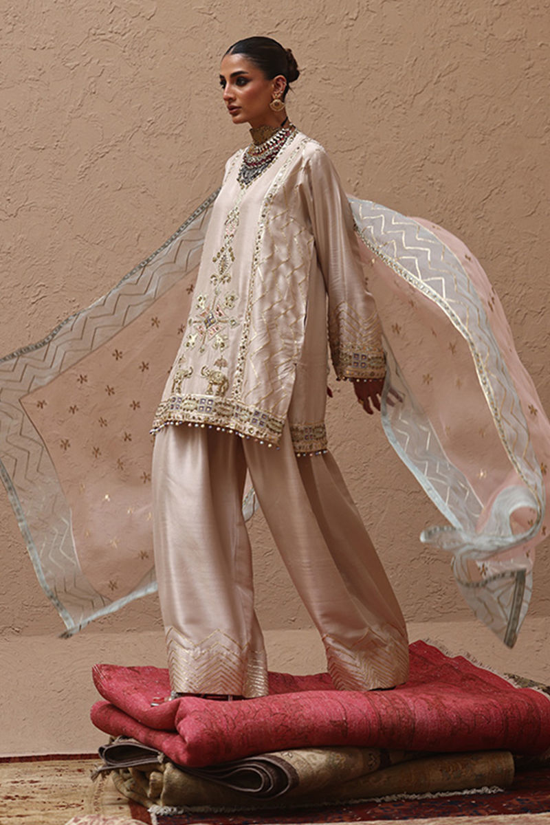 The short shirt with pockets in Seed Pearls, crafted from pure 80gms raw silk, is adorned with gota work, zari embroidery and colored appliqué, further enriched with zardozi details including kora, dabka, cutdana, stones, pearls, nakshi and sequins on the front and sleeves. It is paired with pure raw silk farshi culottes in the same shade, finished with a traditional gota border, while a contrasting aqua and pink pure organza dupatta with a four-sided gota, zari and sequins embroidered border and all-over botis completes the ensemble with graceful charm.
