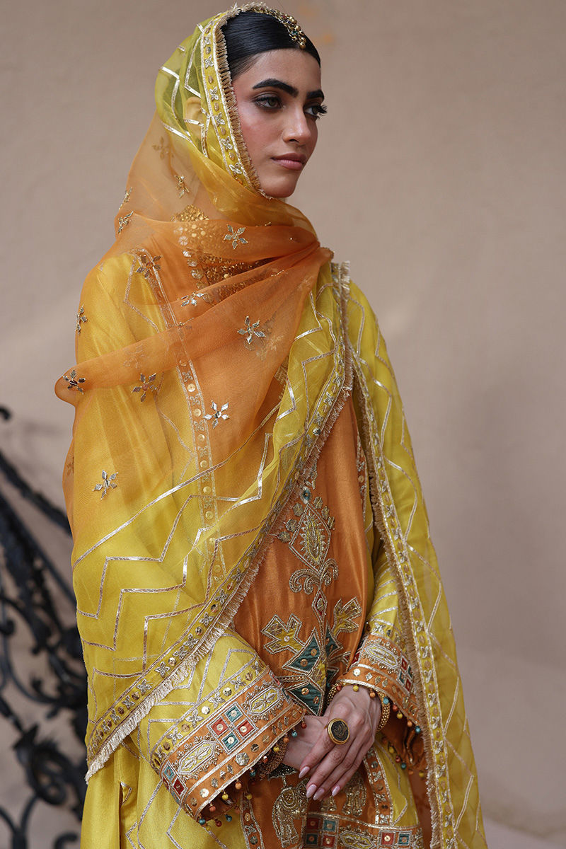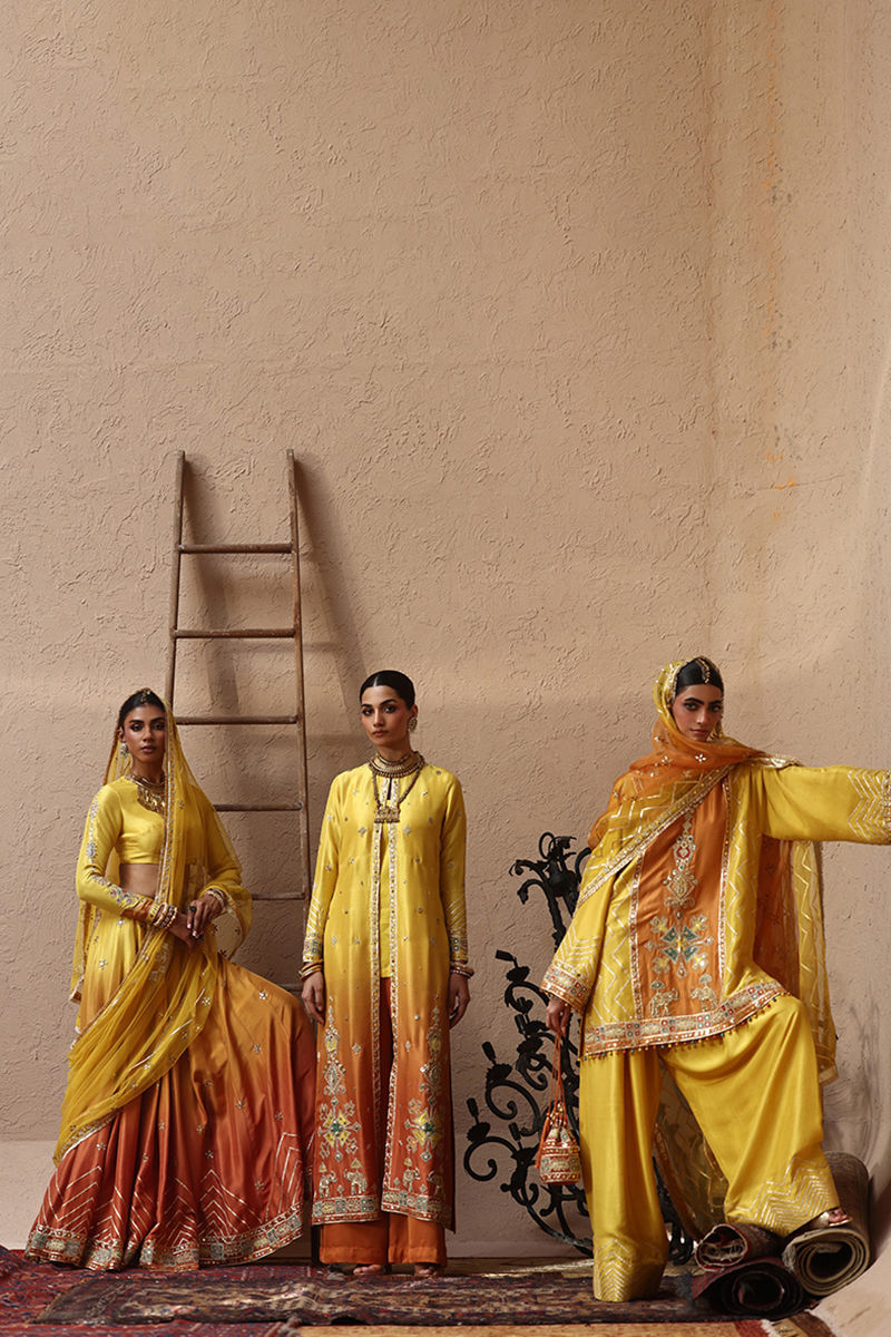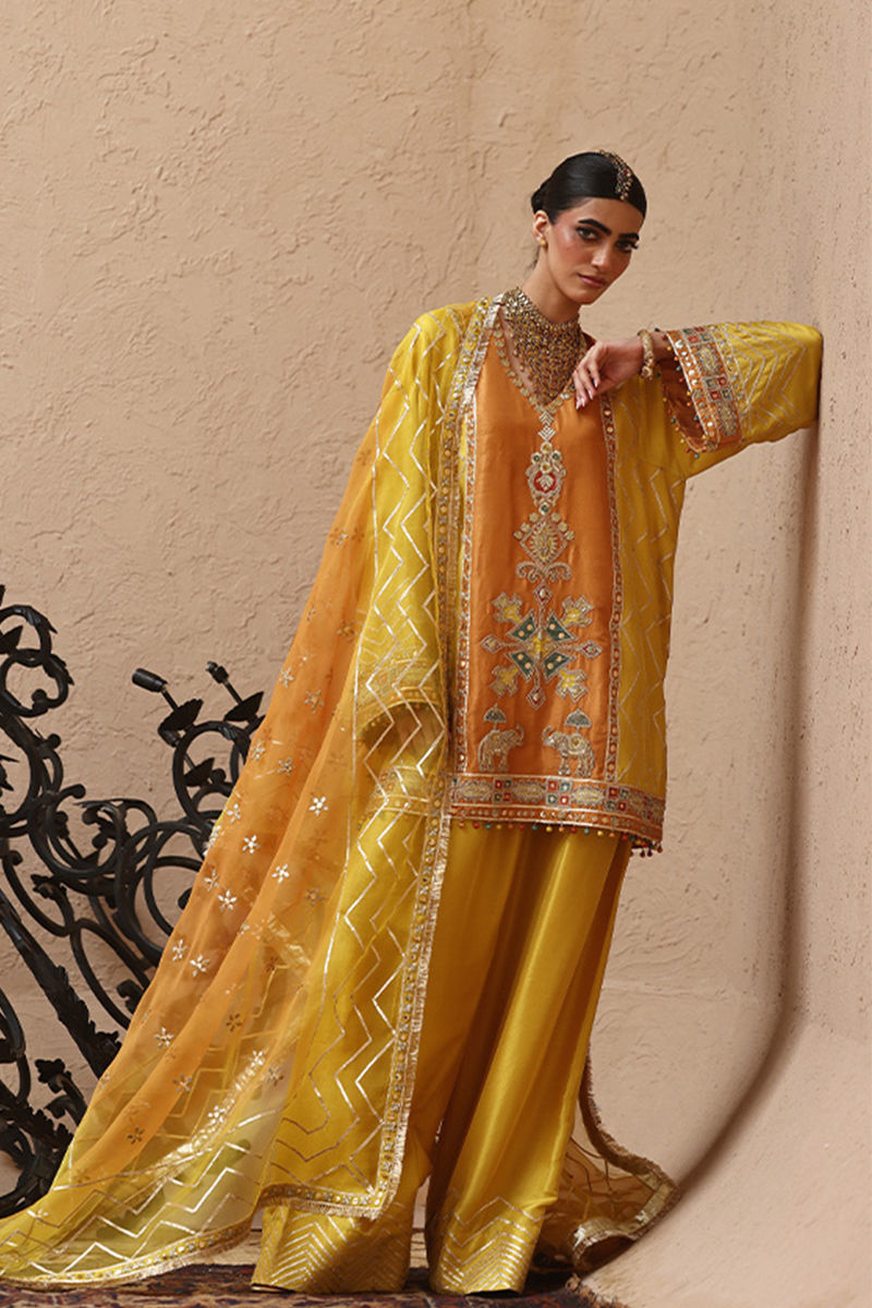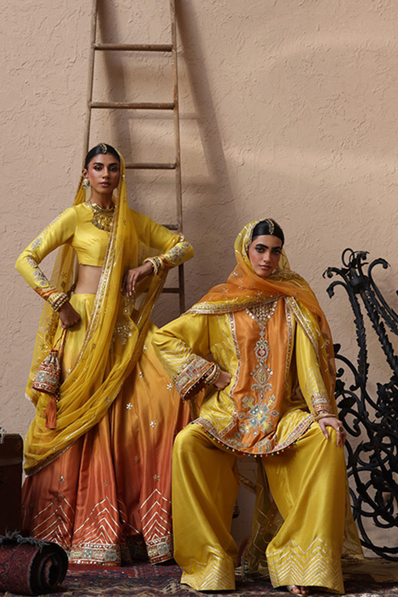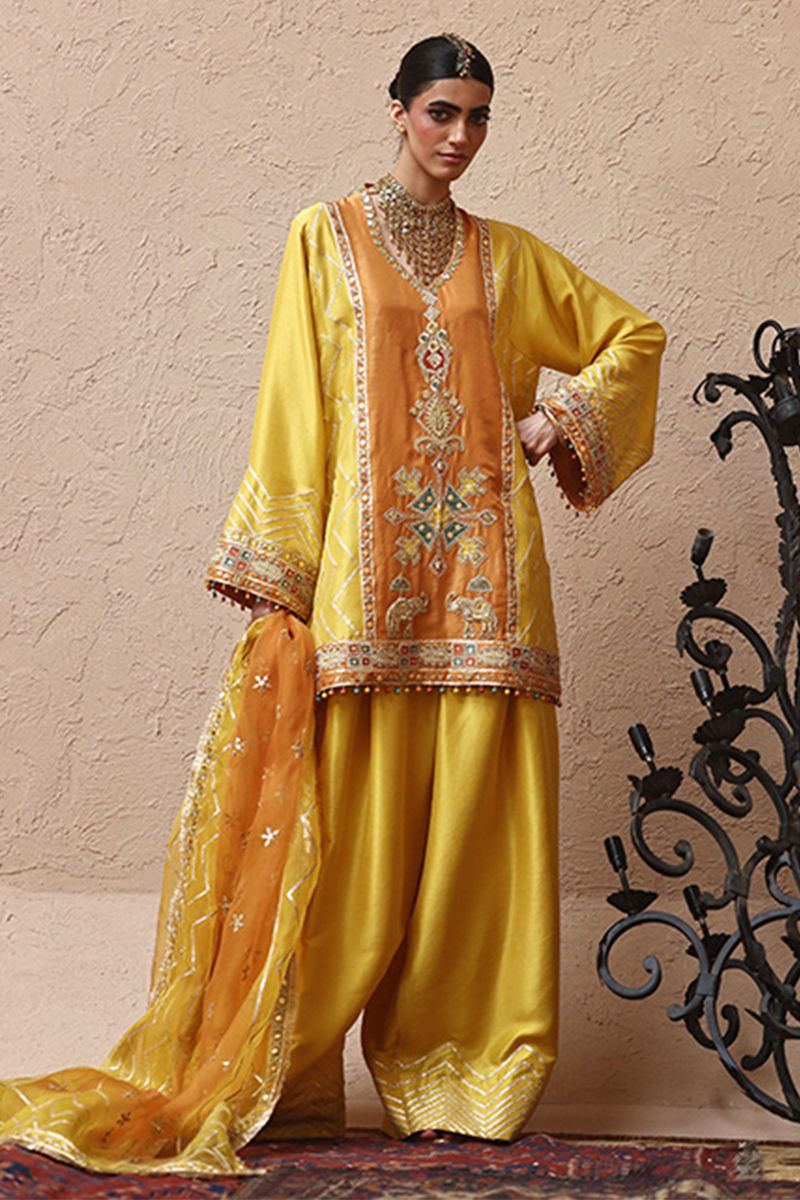 The short kurta with pockets in vibrant yellow, crafted from pure 80gms raw silk, is adorned with gold gota work, zari embroidery, and colored appliqué, further enriched with intricate zardozi detailing of kora, dabka, cutdana, stones, pearls, nakshi, and sequins on the front and sleeves. Paired with pure raw silk farshi culottes finished with a classic gota border, the ensemble is completed with two dupatta options: a net dupatta in vibrant yellow featuring a four-sided border and all-over gota, zari, and sequins embroidery, or a pure organza dupatta with a four-sided embroidered border and delicate all-over botis for graceful elegance.