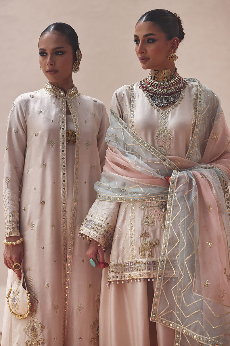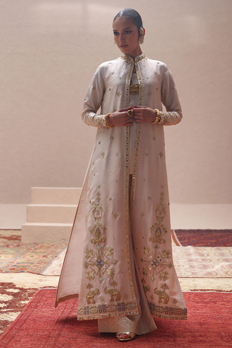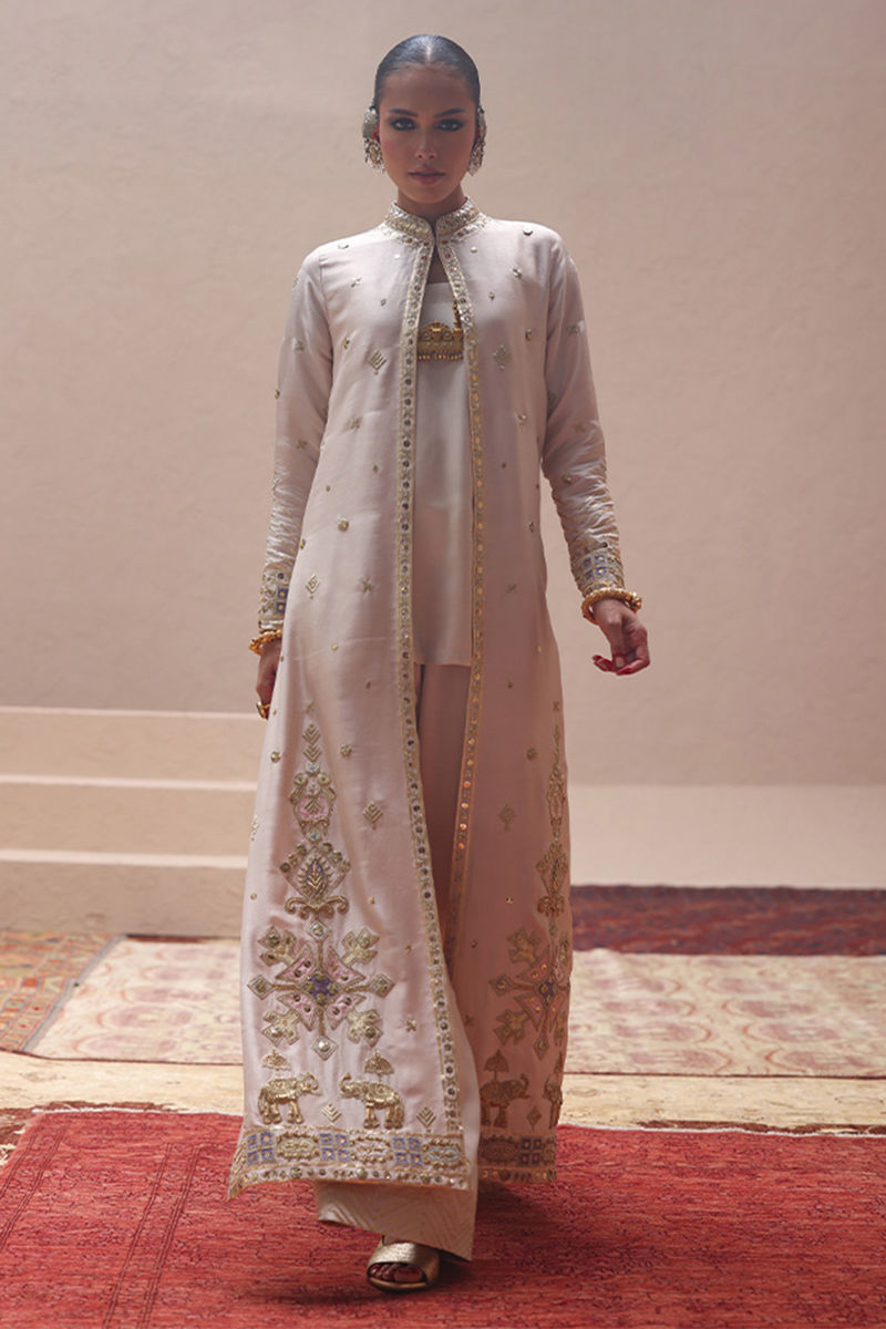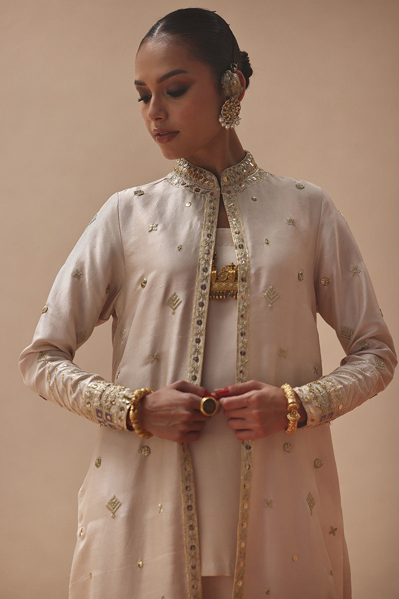 The Seed Pearls jacket, crafted from pure 80gms raw silk, is beautifully embellished with gold gota work, zari embroidery, and colored appliqué. Intricate zardozi work with kora, dabka, cutdana, stones, pearls, nakshi, and sequins enhances the front and sleeves, giving the design a regal touch. It is styled with a sleeveless inner in cotton charmeuse for effortless layering. The look is completed with cotton charmeuse culottes, finished with a traditional gota border that adds a graceful edge.