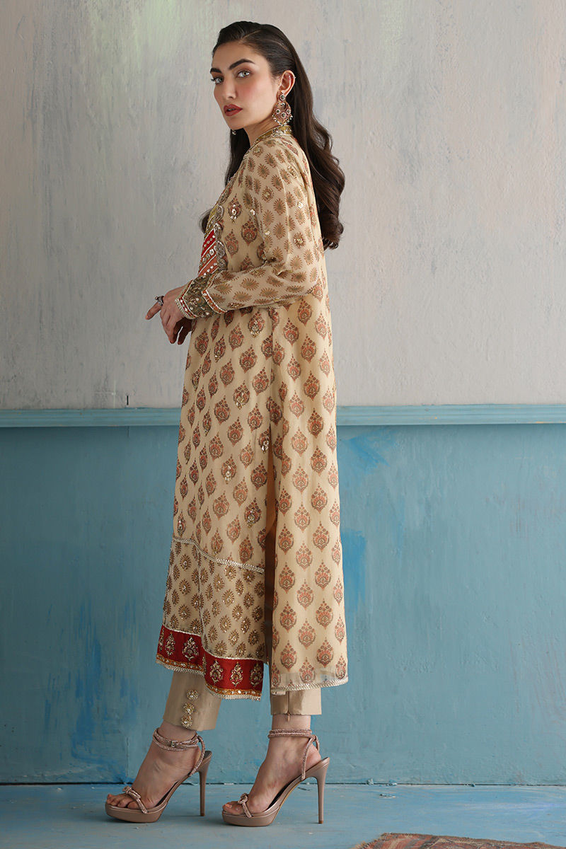 Immerse yourself in a world of timeless elegance with our "Golden Beige Splendor meticulously crafted from maysoori organza silk in a delightful gold beige shade. The shirt features intricate screen print that adds a touch of ethereal charm. The neckline is adorned with appliqué of multi-color pattis, further enhanced with handwork of gota and zardozi. The same handwork adorns the shirt all over, including the borders and sleeves, creating a cohesive and mesmerizing aesthetic. Complementing the shirt is a pair of shimmer silk straight pants. Complete your ensemble with the screen print organza dupatta. The four-sided lace of gota adds a touch of traditional allure, framing the dupatta with grace. length 46 to 47