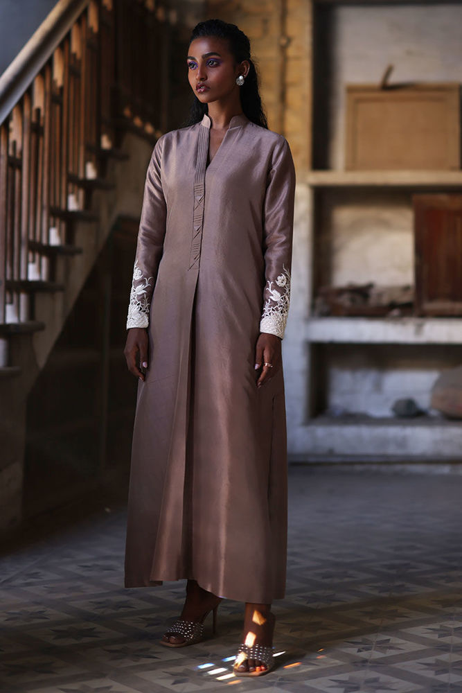 Introducing our stunning shirt made from pure raw silk 80, in a beautiful pinewood color, with a gorgeous fabric manipulation on the neckline and stunning resham and bead cutwork on the sleeves. The box pleat loose A-line cut is both comfortable and flattering, making this shirt a versatile addition to any wardrobe. The pants are available in two materials, shimmer silk and pure raw silk the shimmer silk adds a touch of glamour, while the pure raw silk ensures a comfortable and luxurious fit.