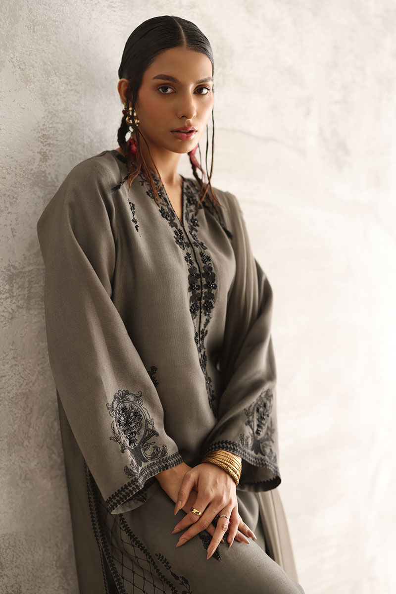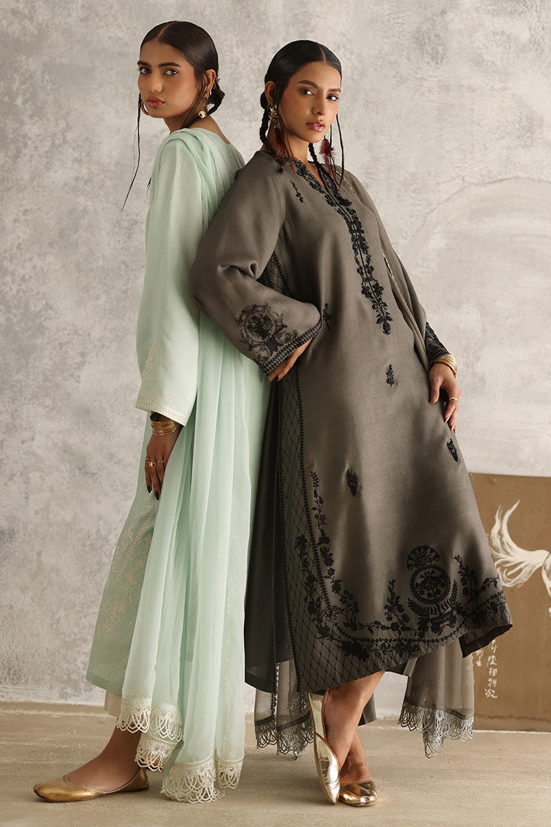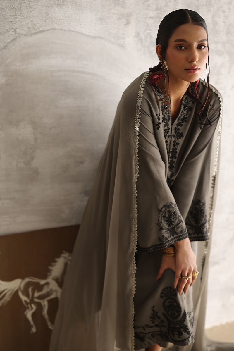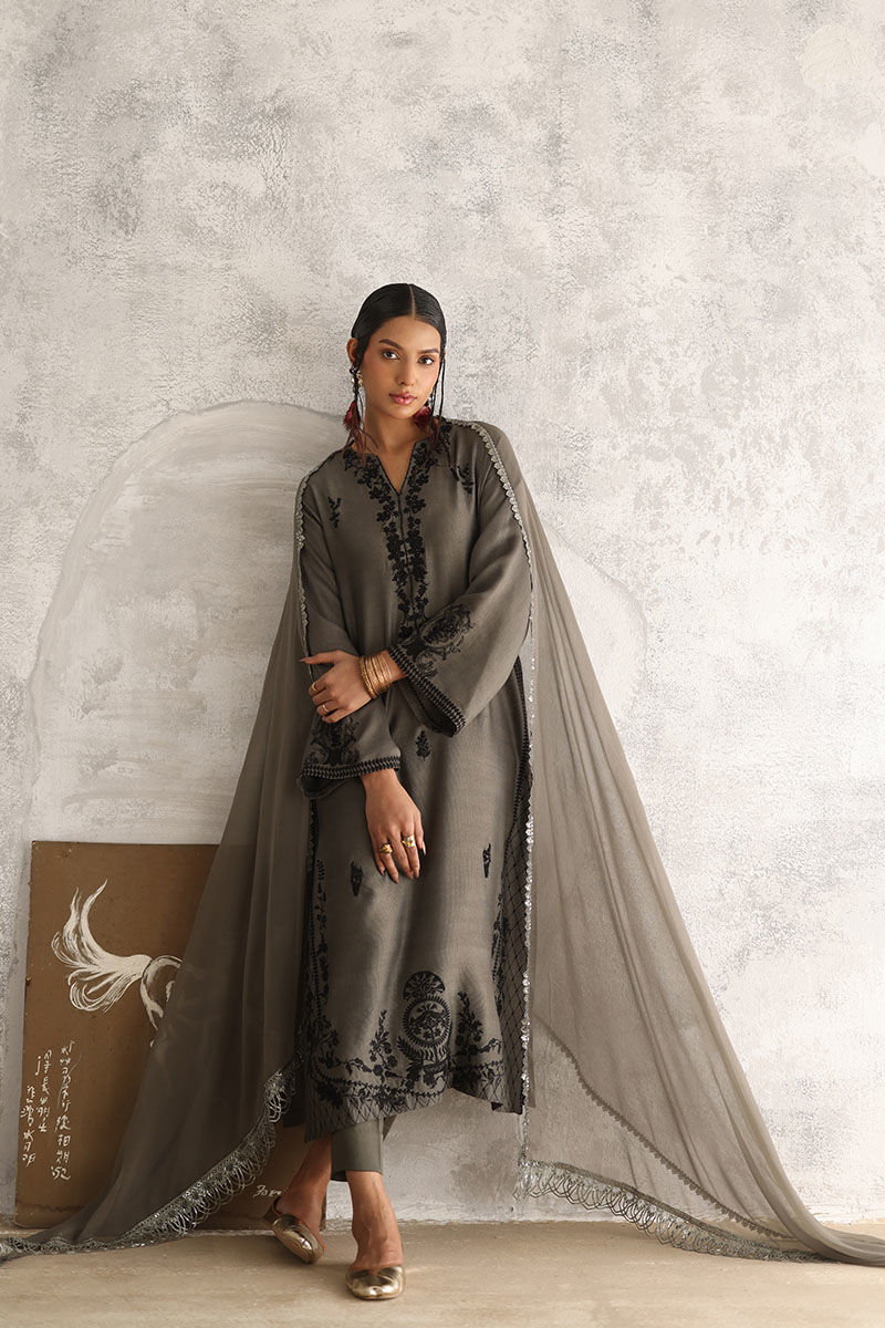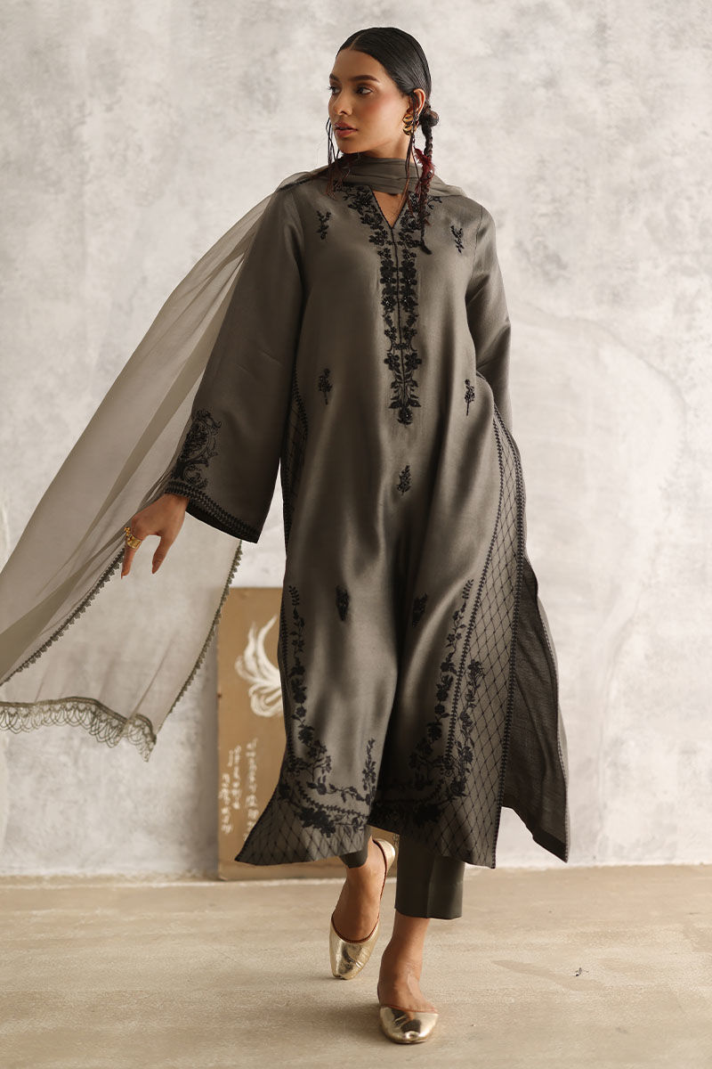 Experience understated sophistication with our gull grey ensemble. The plain Khadi shirt boasts allover resham embroidery, delicately accented with pearls, sequins, cutdana, moti, and naqshi, lending an exquisite touch to your look. Paired with comfortable rayon satin pants for effortless elegance. Complete your ensemble with a chiffon dupatta featuring intricate lace detailing on all four sides, adding a subtle yet refined finish to your attire. The model's shirt length is 47 and culottes length is 36.