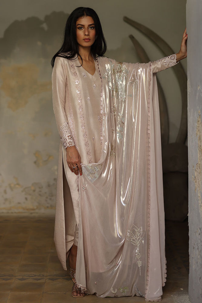 A whisper-pink pure raw silk long shirt with high slits is a must-have ensemble for your wardrobe with beautiful self-tone resham embroidery with cutwork and laces. Finish the look with our shimmer silk straight pants and a pure organza dupatta with resham embroidered scallops. The outfit can also be styled with a Laame Chiffon dupatta, embroidered with resham in pastel shades, zari, pearls, sequence, and tikki stones.