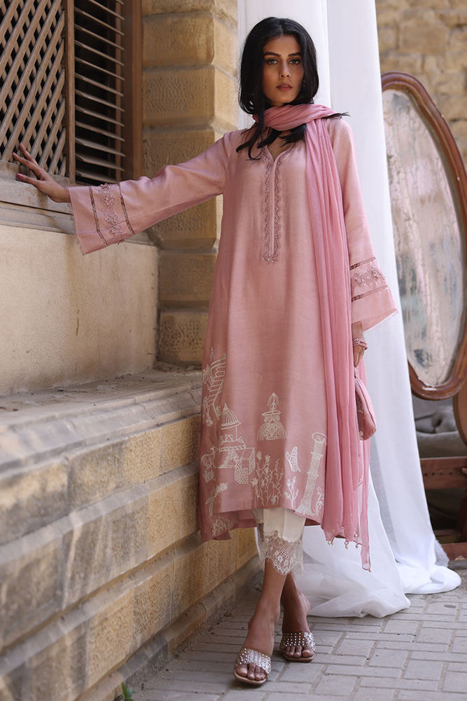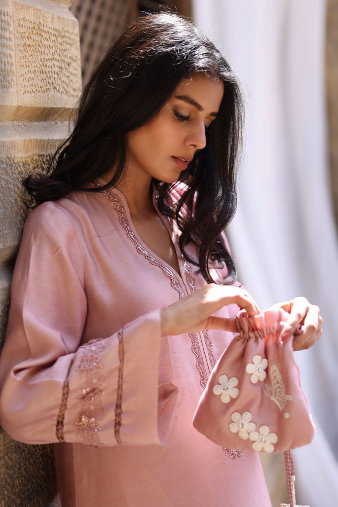 Stand out in a stunning A- line lotus pink Khaadi cotton net shirt that is heavily resham embroidery on daman and tarkashi work on sleeves with lace edging. The outfit can be paired with shimmer silk pants with chantilly lace or stretchable western crepe pants. The dupatta in chiffon features some beautiful pearl hangings. Complete your look with a classy potli pouch that complements your outfit.