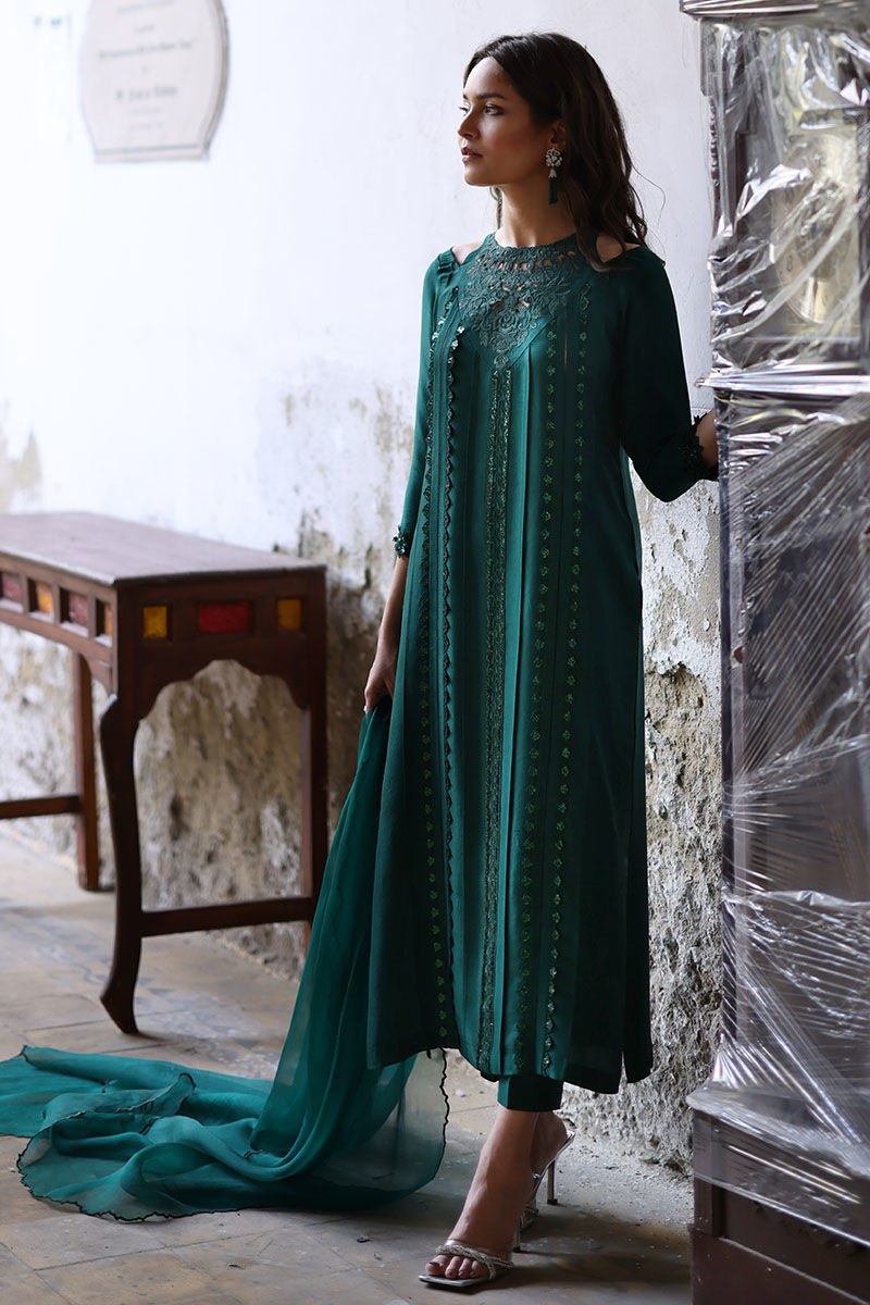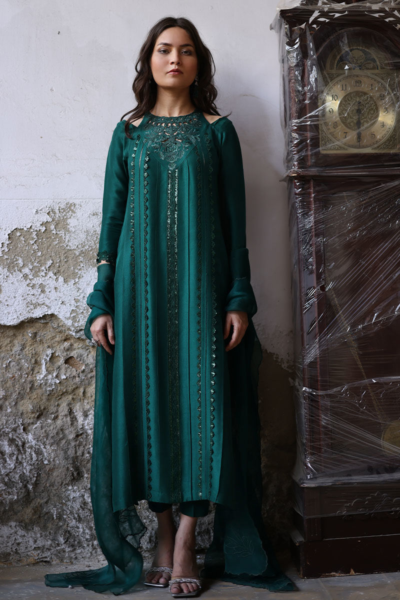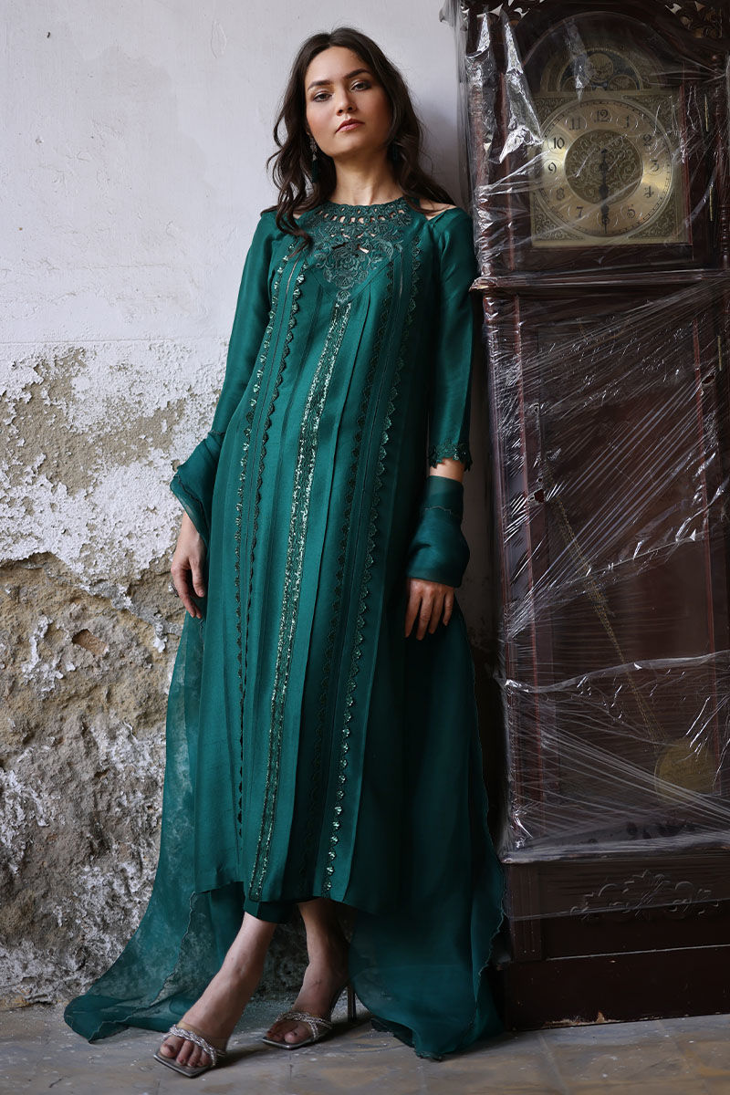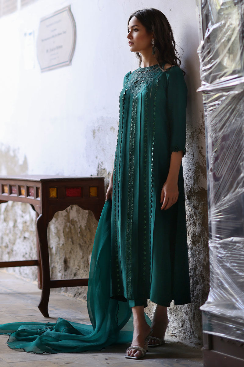 This season's most irresistible trend is the new-age pleats and long shirts with high slits in a refreshing pine needle tone. The shirt is adorned with resham embroidery self-tone in front, pleats, and laces all over the shirt. This elegant shirt is paired with "Pure Raw Silk Pants. Finish the look with a pure organza resham embroidered dupatta with scallops and embroidered corners. It includes shirt, shalwar and dupatta.