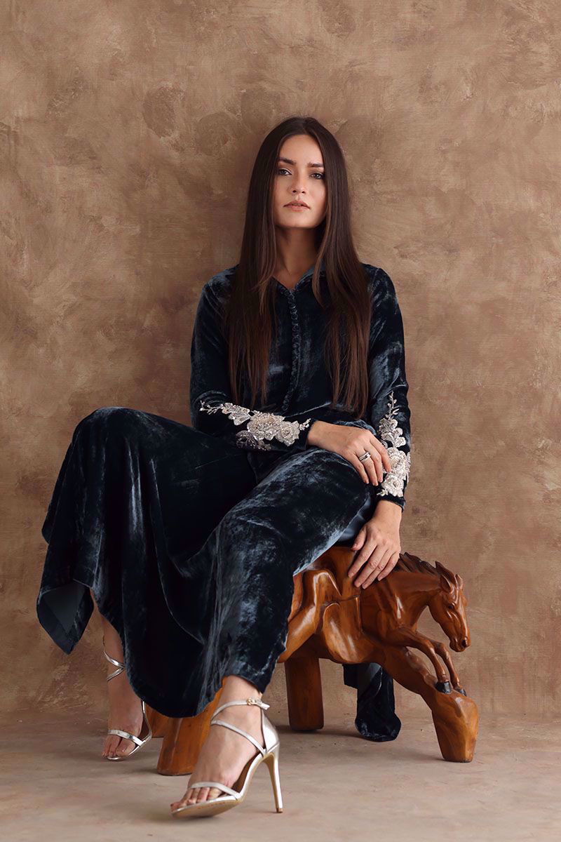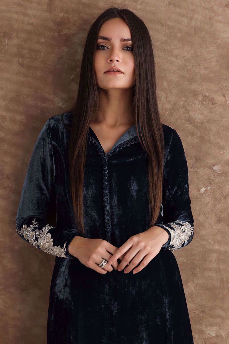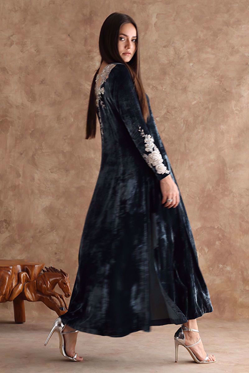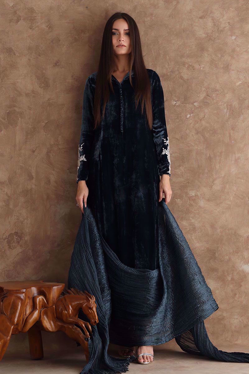 Perfect color for winter evenings. This steeple grey pure velvet shirt in prince panel cut is a statement of elegance. The adorned style is complimented with delicate embellishment on sleeves and back, details of hand work with pearls, cut dana, diamantes, sequins and resham. This shirt can be paired with same color pure raw silk pant and fancy crushed organza dupatta can be purchased at additional cost.