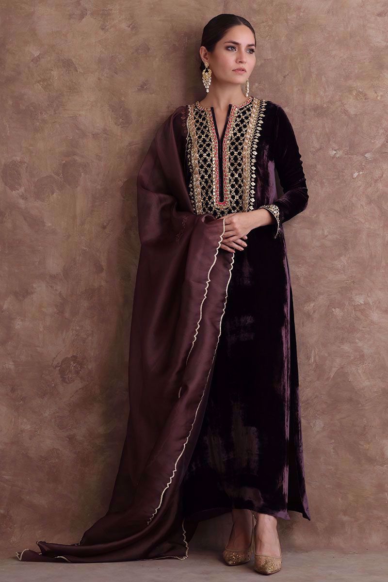 Bronze mist long shirt in pure velvet has eye catching handwork details on neckline. This beautiful piece has delicate handwork of zardozi, gota, sequins, naqshi and cutdana. The attire has same color pure raw silk pants and Shiny organza dupatta with zari work border to be purchased at additional cost.